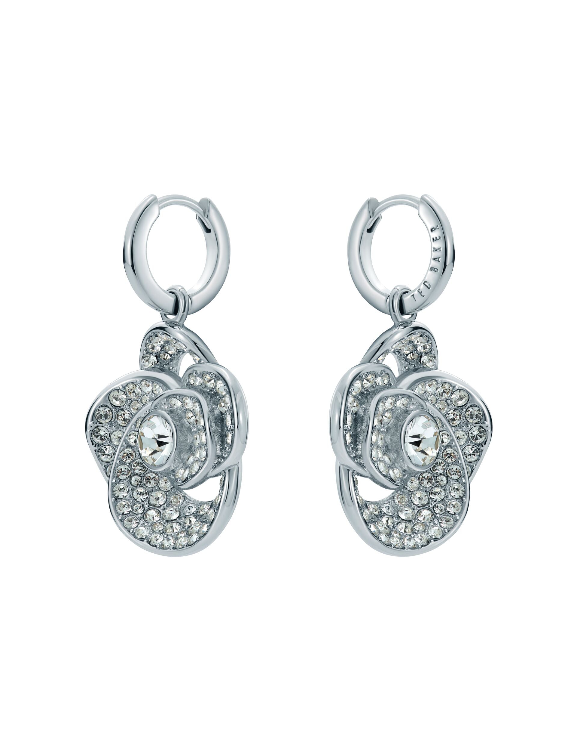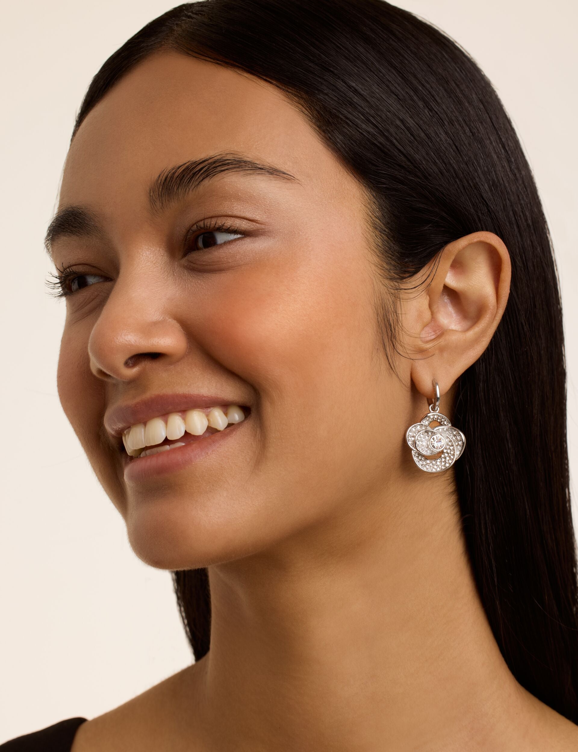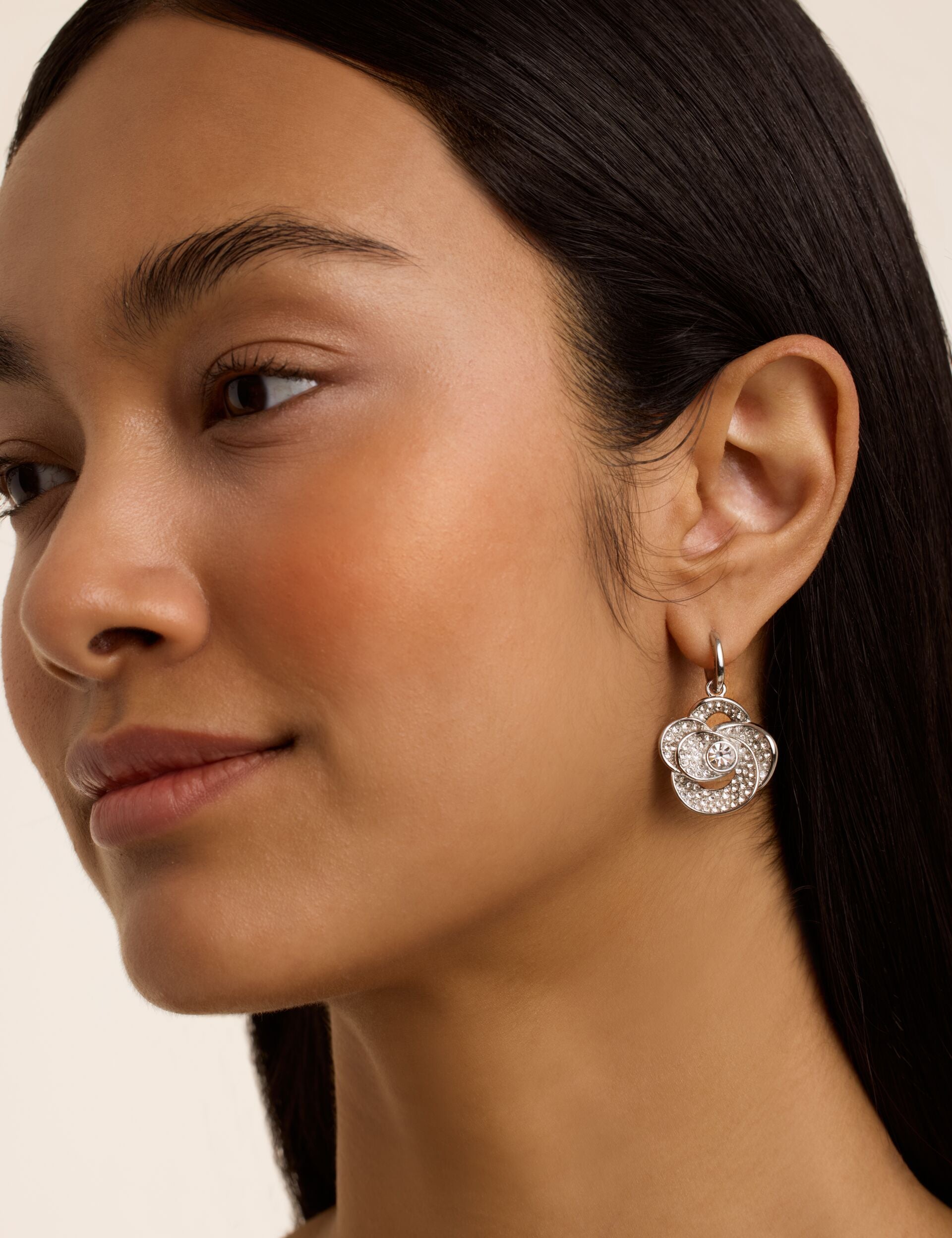 Make a sparkly statement with the FLORENCE earrings, featuring a metal flower pendant set all over with clear European crystals. It hangs from a huggie style hoop with hinge closure for comfortable wear, and finished with subtle engraved branding.