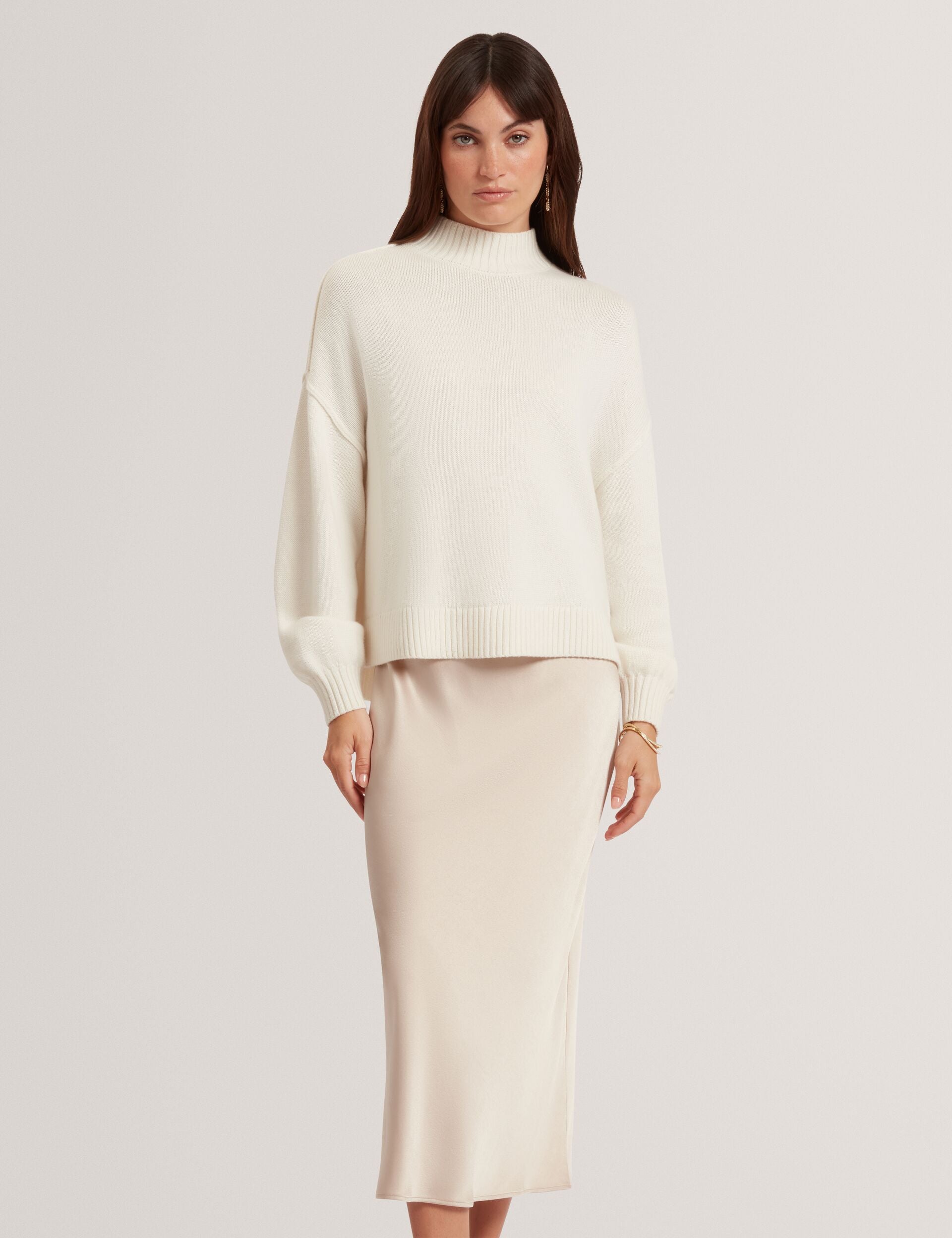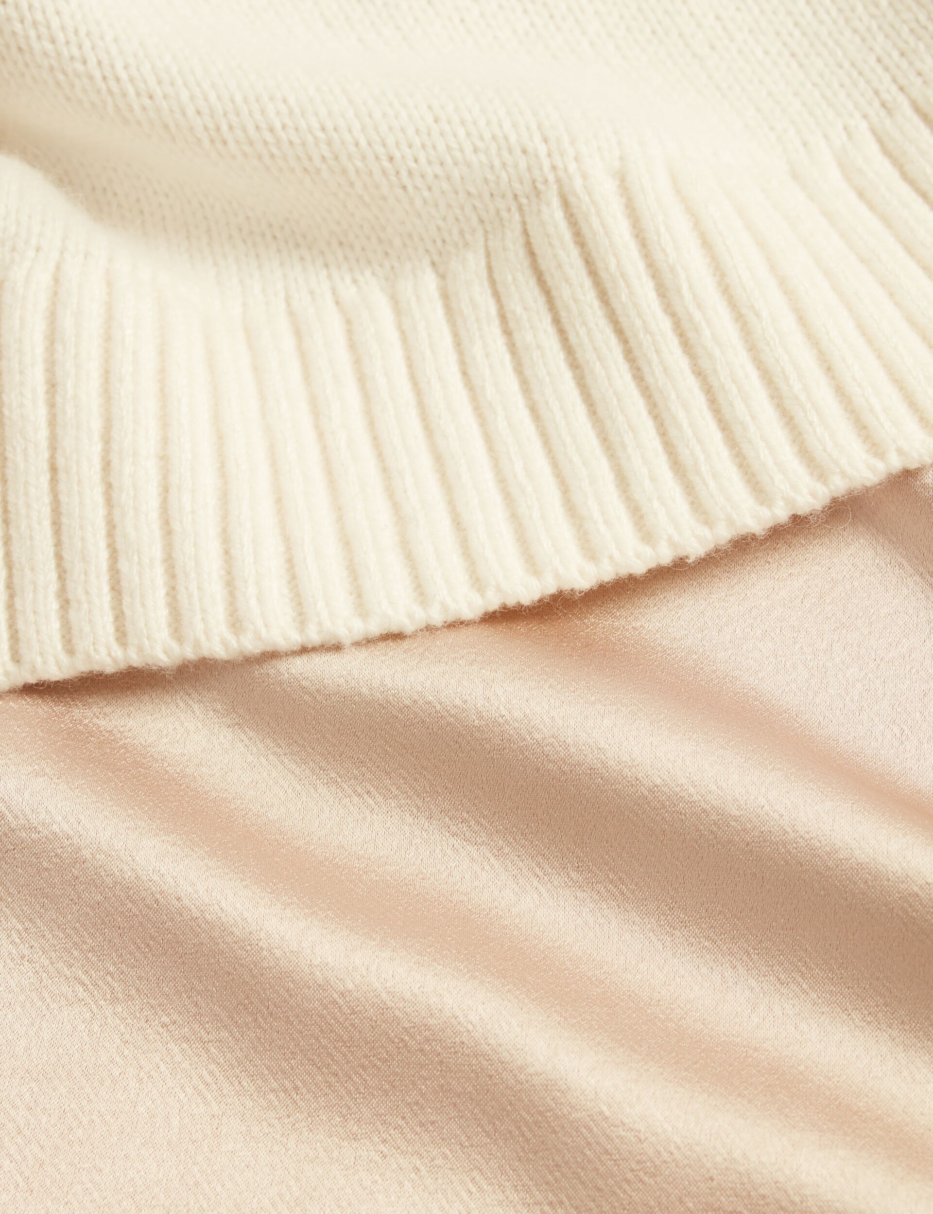 Double up on style with the HARISA 2-in-1 dress, featuring a removable knit jumper. The midi slip dress wows on its own with champagne satin fabric, but throw on the relaxed wool cashmere jumper and you've got an entirely new look.