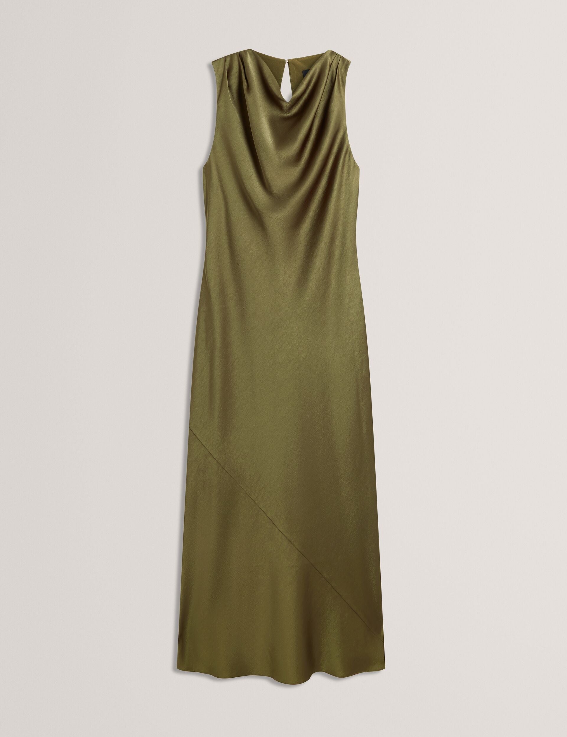 Mit dem ärmellosen Midikleid von LIIMAA ziehen Sie alle Blicke auf sich – und das mit Eleganz. Gefertigt aus hochwertigem Satin in einem satten Khaki-Ton, besticht der fließende, schräg geschnittene Ausschnitt durch zarte Drapierungen und verleiht jedem Outfit zu jedem Anlass feminine Ausstrahlung.
