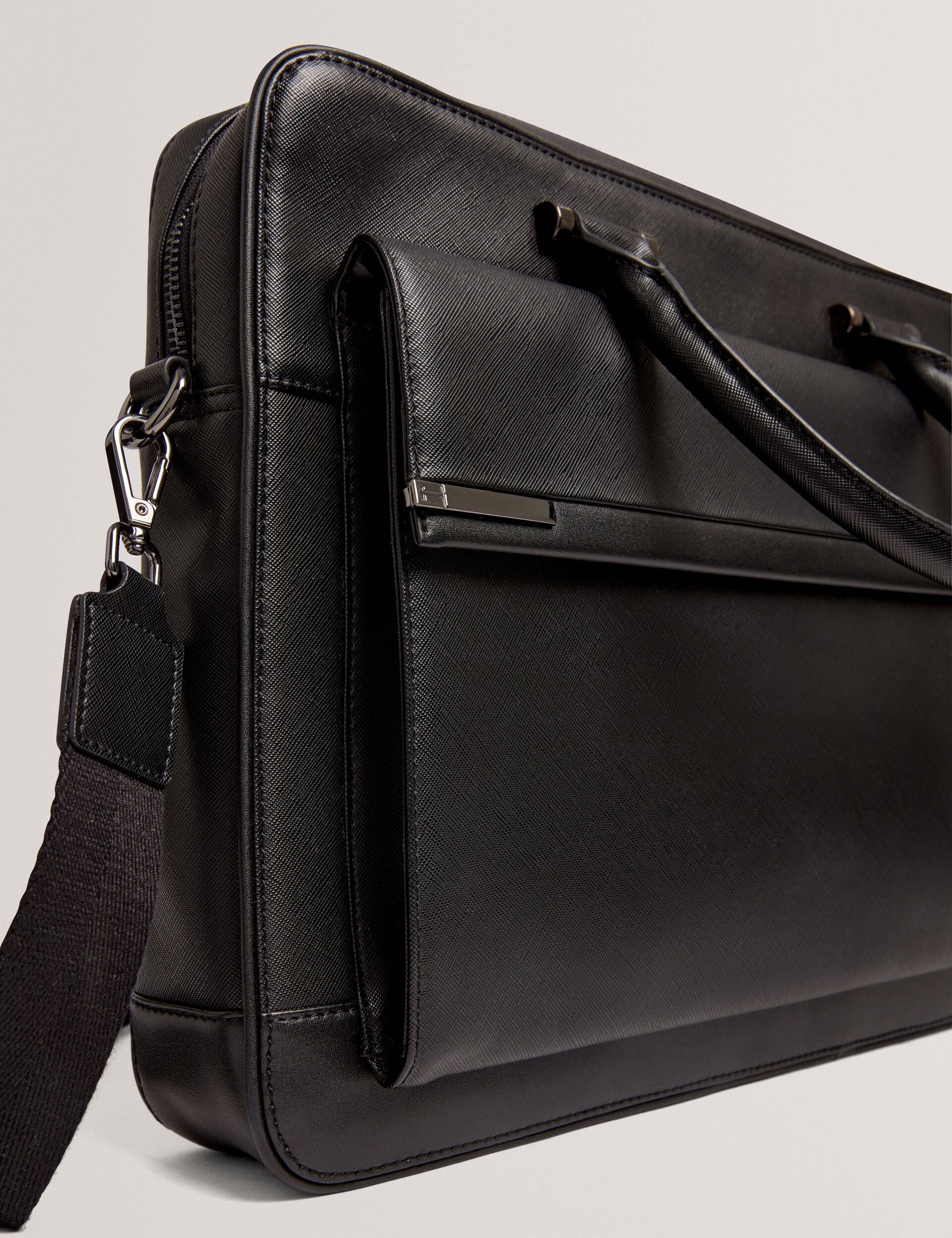 Commuting or travelling, SANNDRO is the sleek and secure way to carry your laptop. Crafted from a crosshatch texture PU with a hardware tie bar detail, this laptop bag features a handy flap front pocket and a padded laptop compartment to organise all of your working essentials.