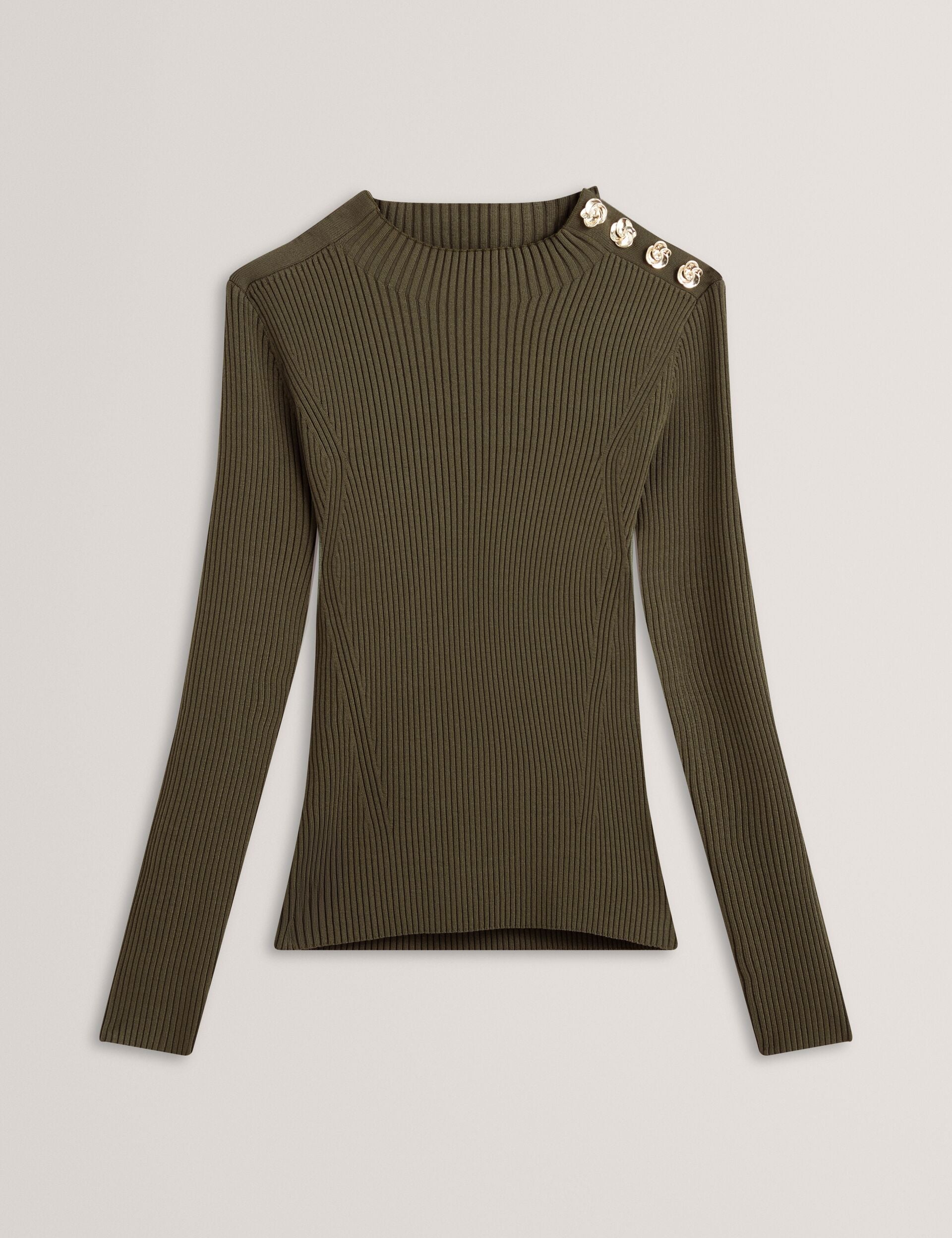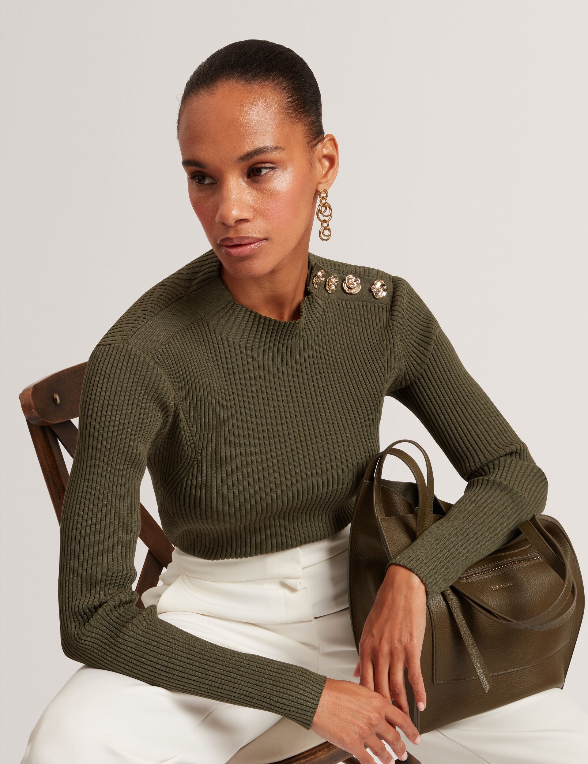 BLEANA is a flattering basic with a touch of Ted's luxury charm. Crafted from a stretch knit fabric with a ribbed texture, this long sleeve top features gold-tone rose buttons at the shoulder for that effortlessly polished look.
