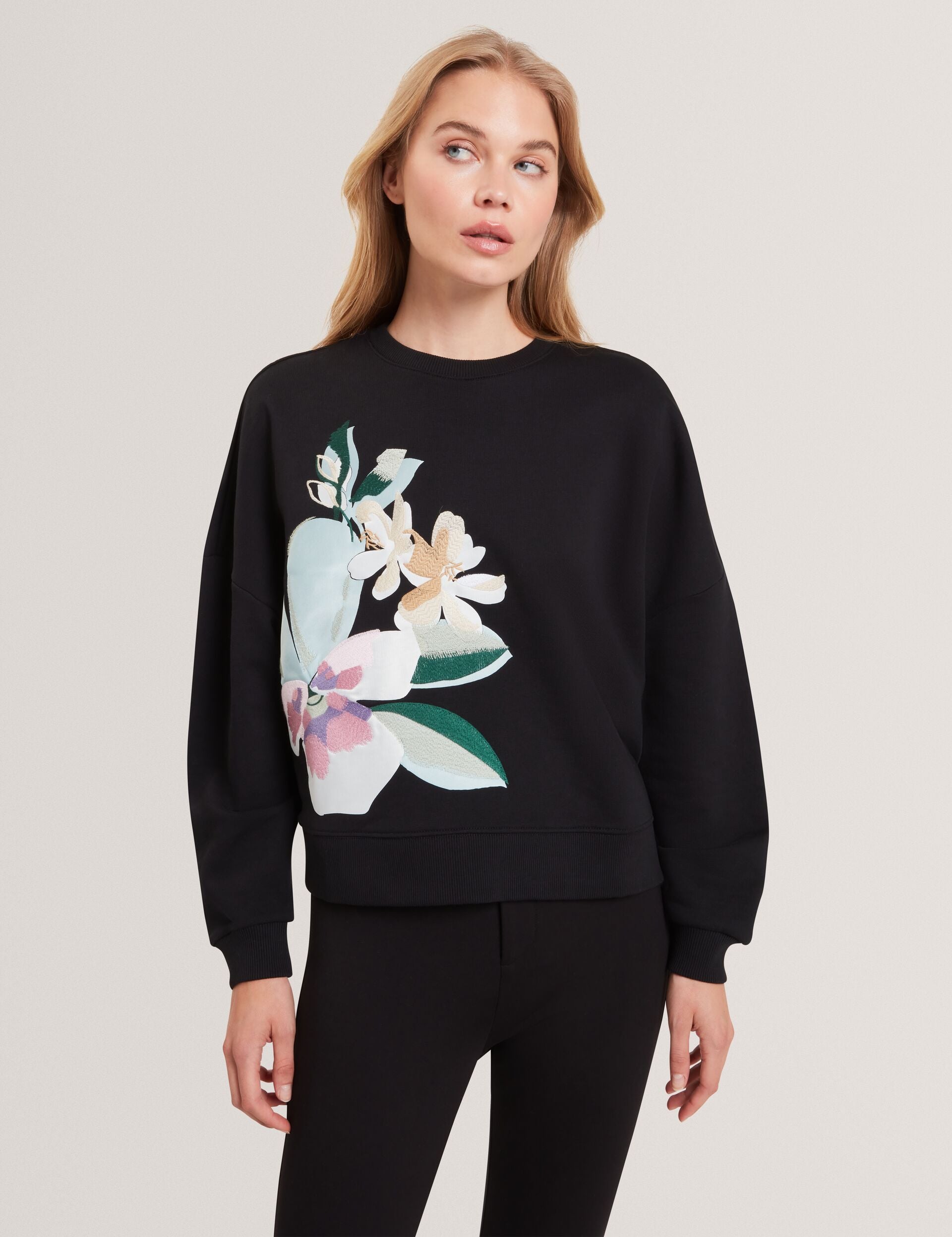 - Floral graphic with embroidered detail