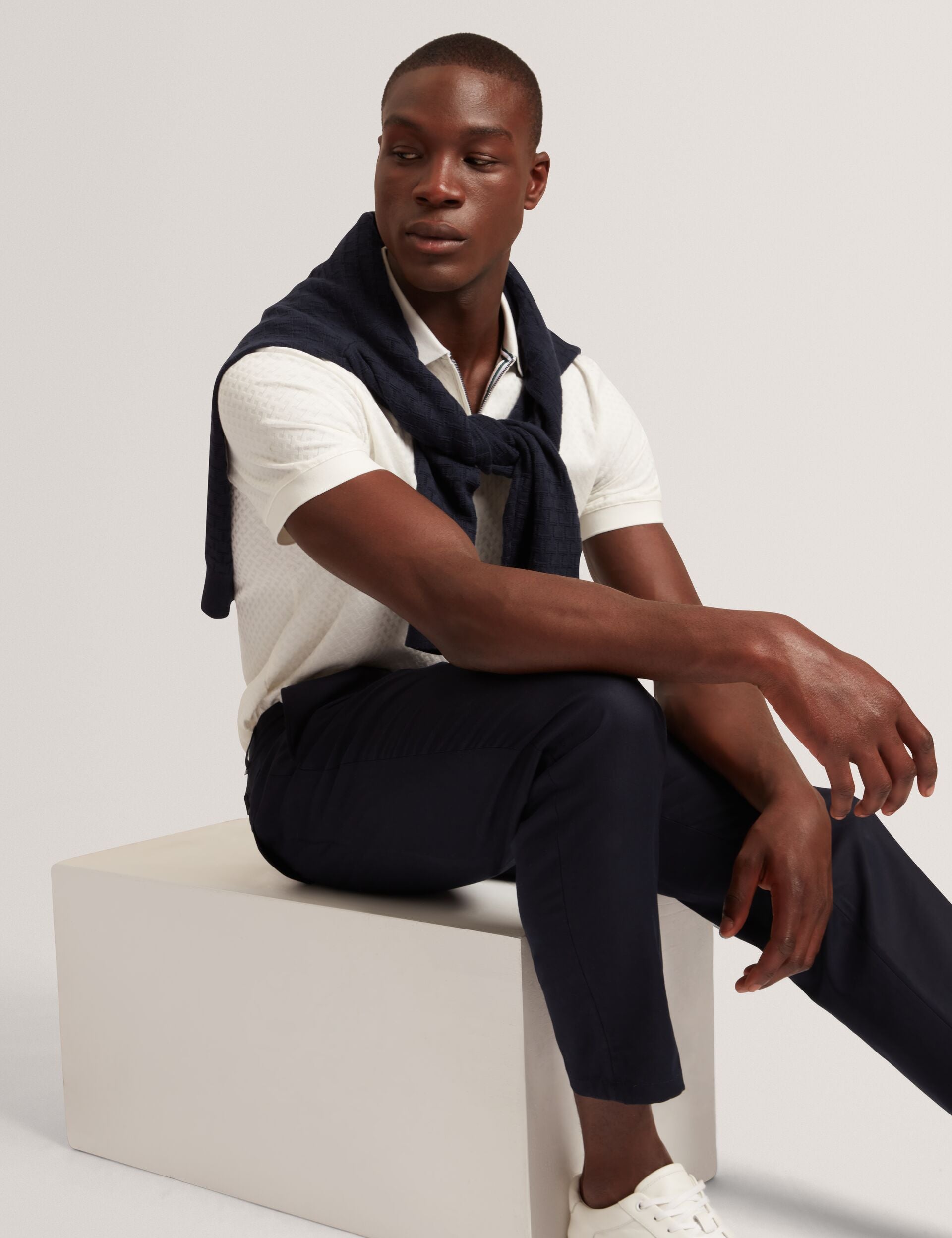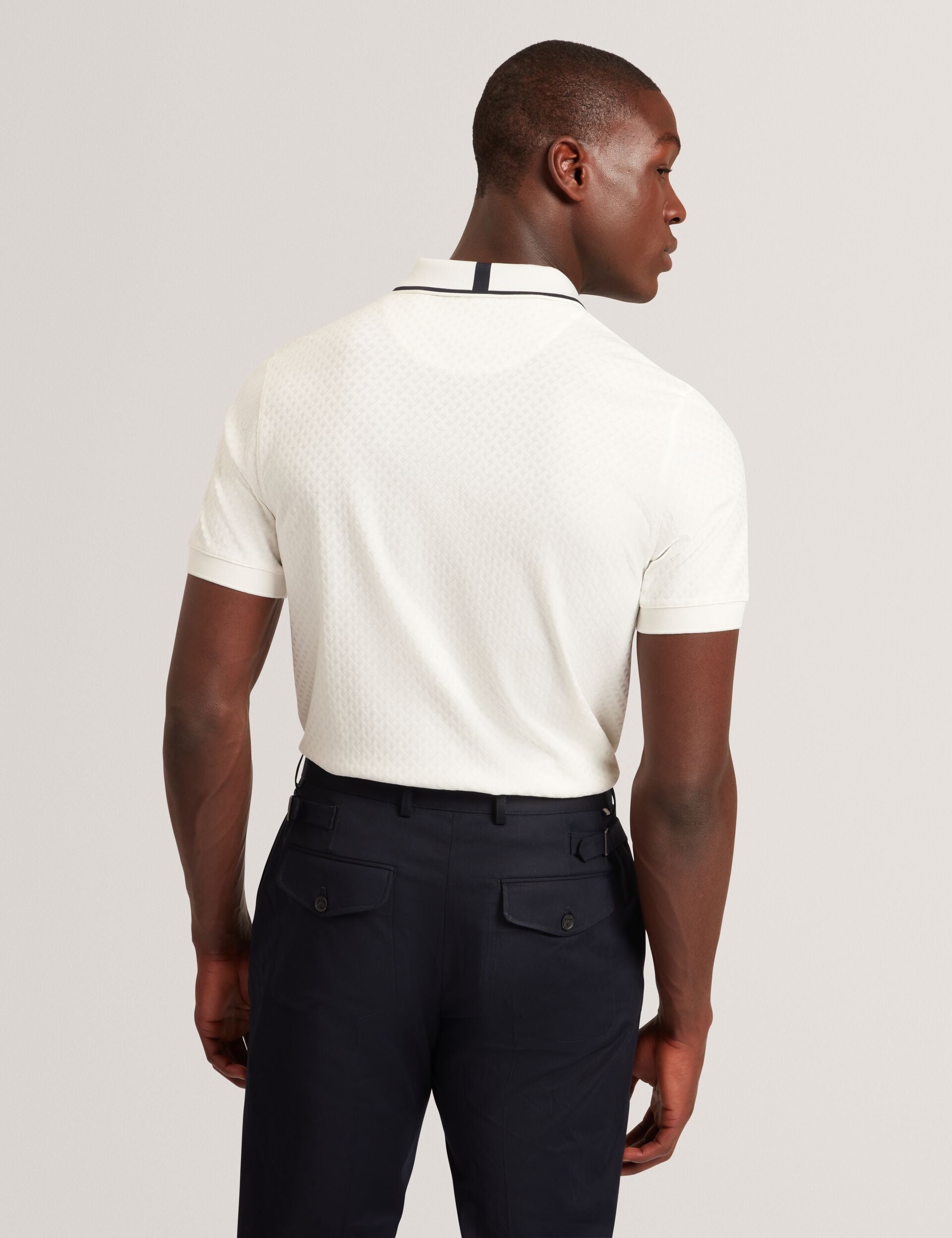 COPHEN makes a sharp addition to your polo collection. Our signature T texture gives it that designer twist, and we've trimmed the collar with a stand-out single stripe. Made from stretch cotton fabric, this piece is complete with a modern zip neck.