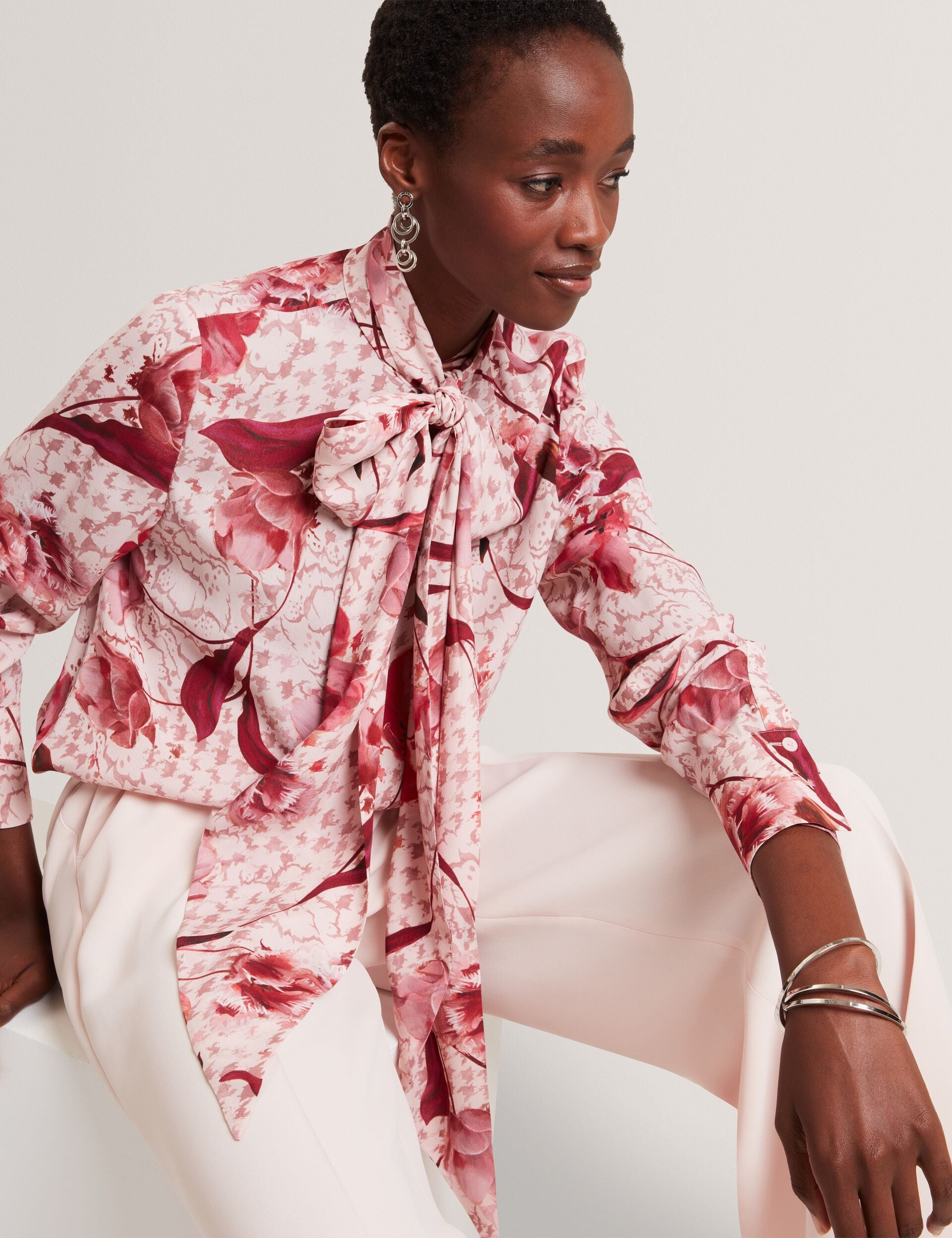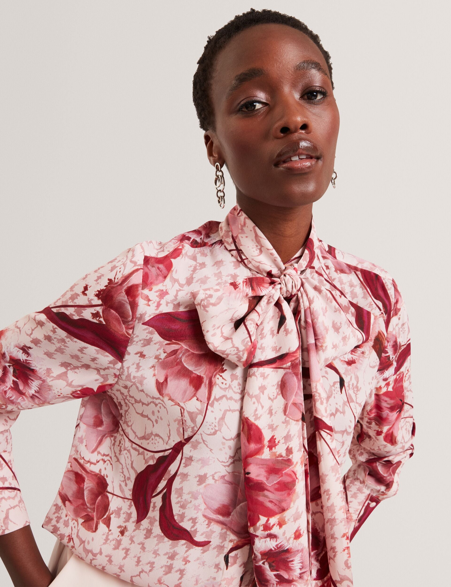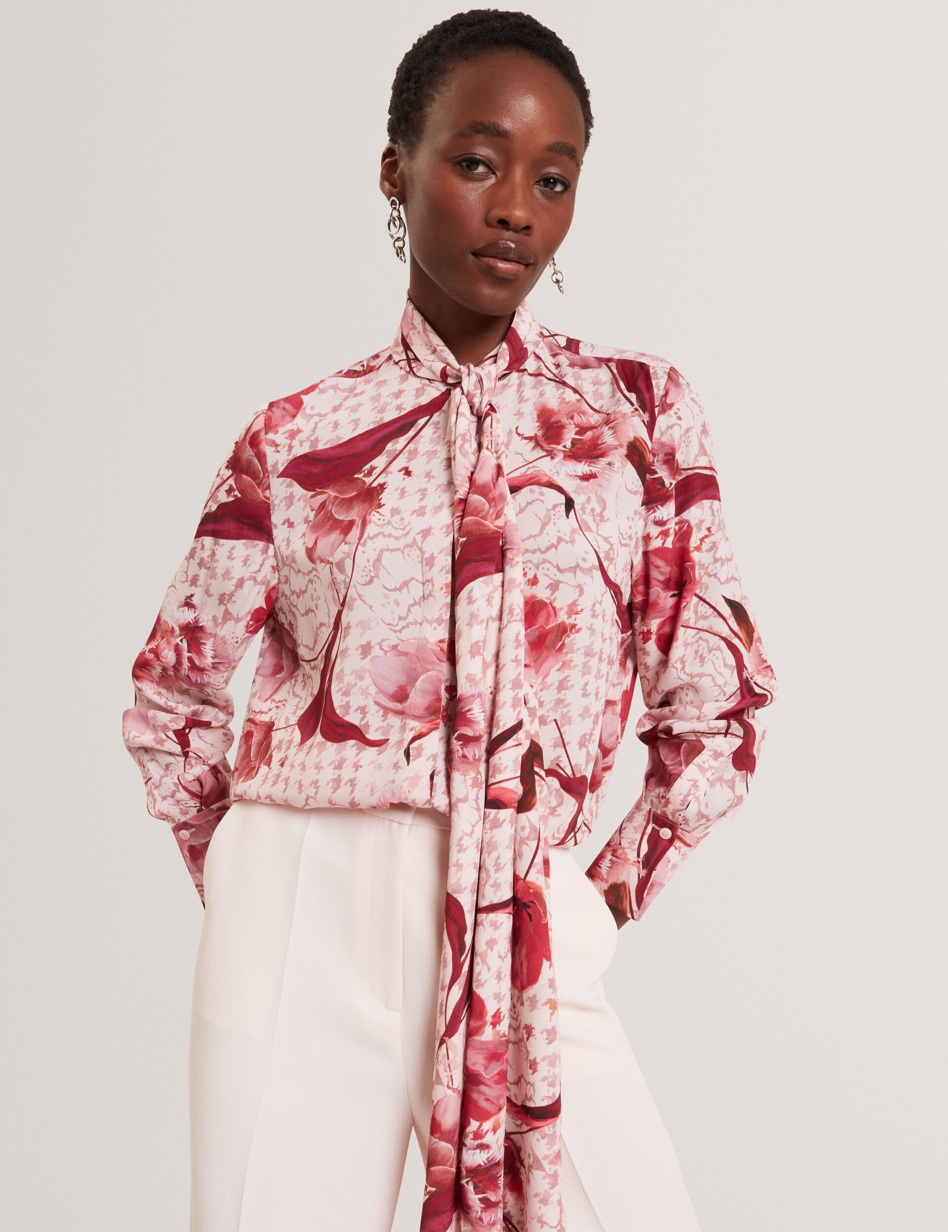 Time to look pretty in pink with CORENA. Our floral houndstooth print is added to a pink base, delivering a vibrant pop of colour that's perfect for the in-between seasons. A tie detail at the neck brings this longline blouse to a feminine finish.