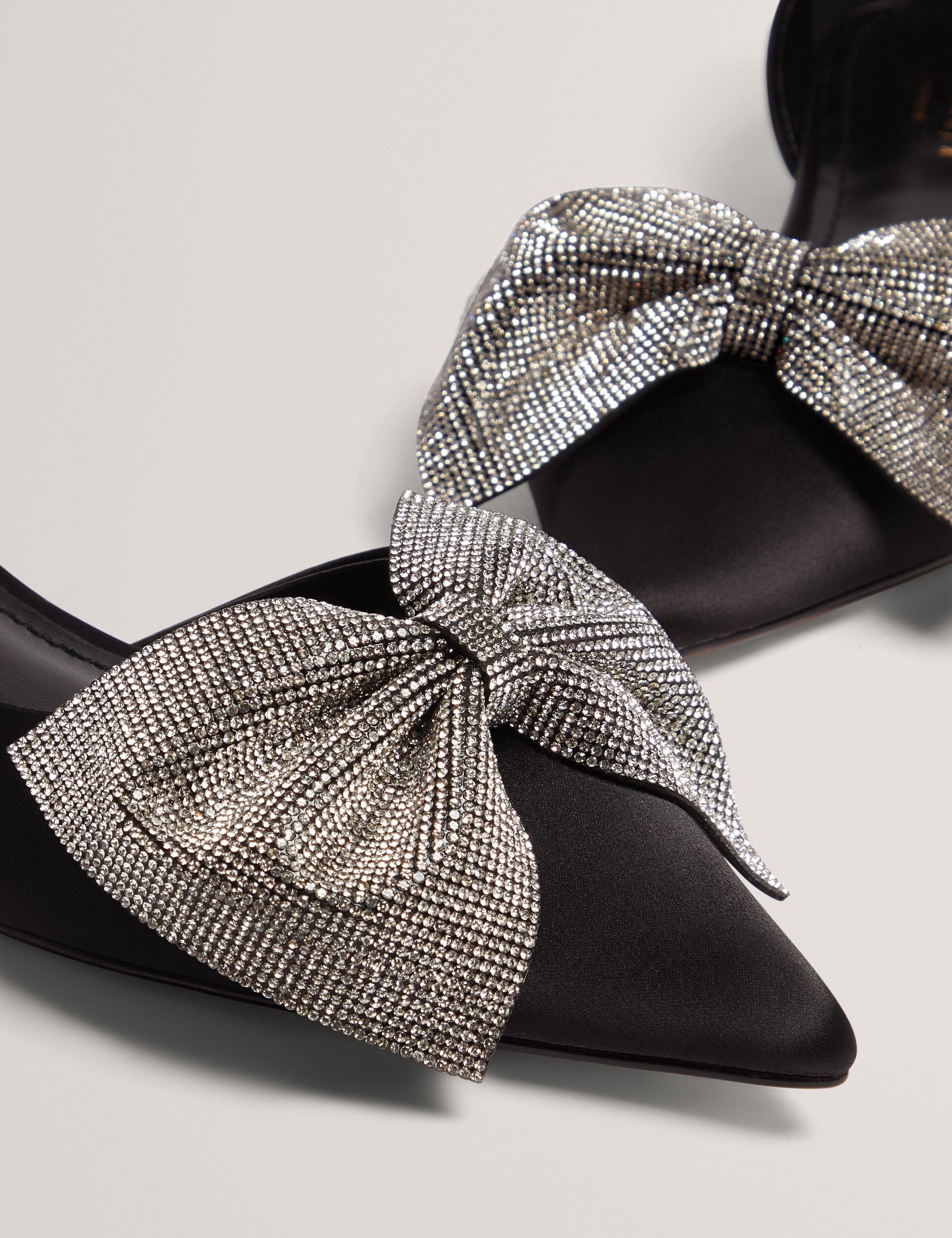 Delicate yet dazzling, the CRISSLY kitten heels feature a sparkling rhinestone bow atop a sleek satin fabric. Designed in a pointed toe silhouette, these shoes are feminine elegance with a luxe finish.