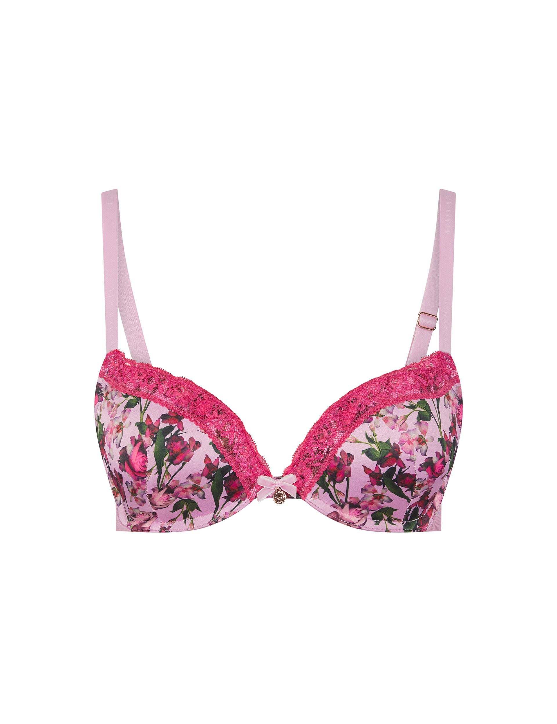 DIAMOND gives you shape and support in the prettiest way possible. This plunge bra creates a flattering silhouette with its underwiring and padded cups, designed with a delicate petal print on smooth satin fabric for an elegant look and feel.