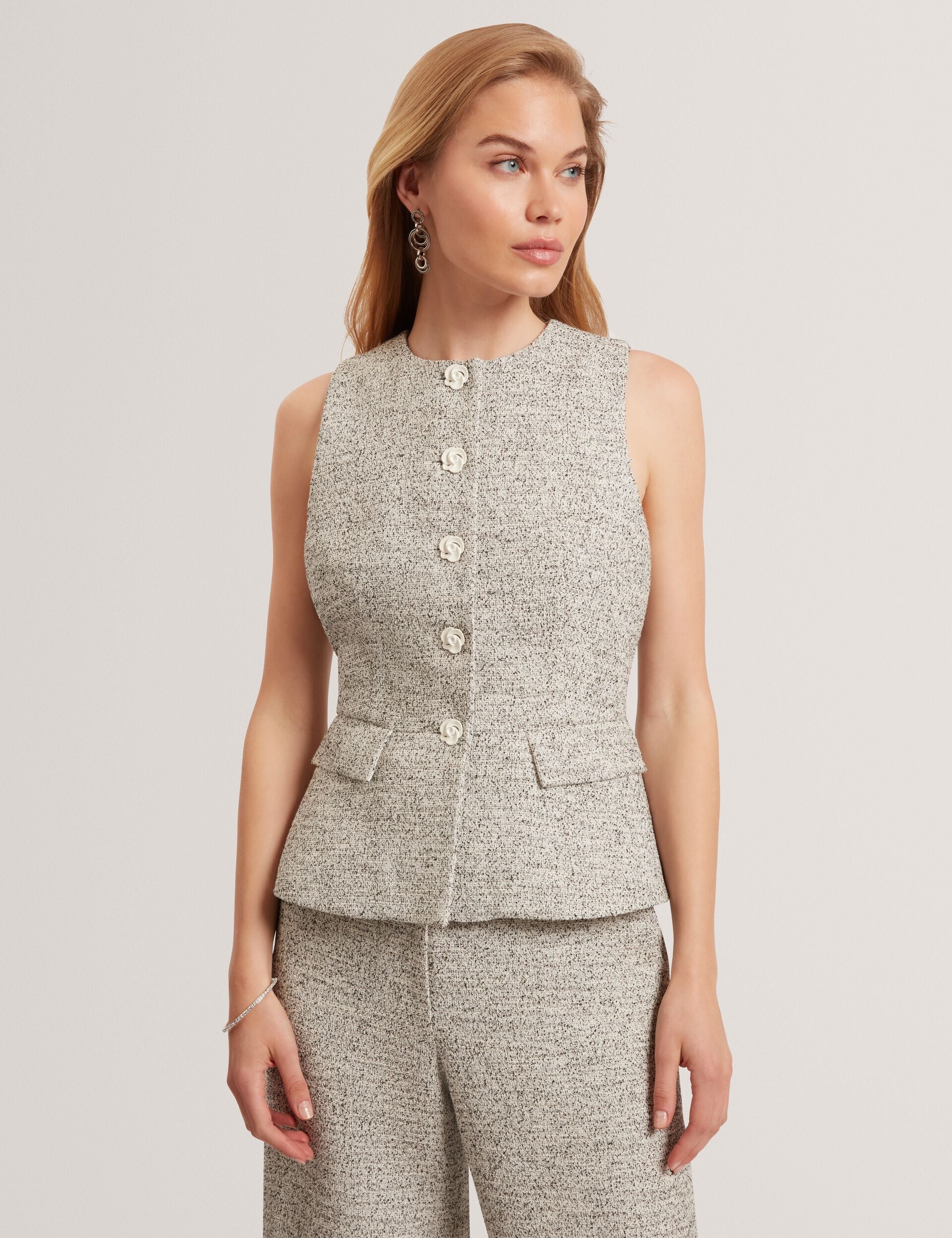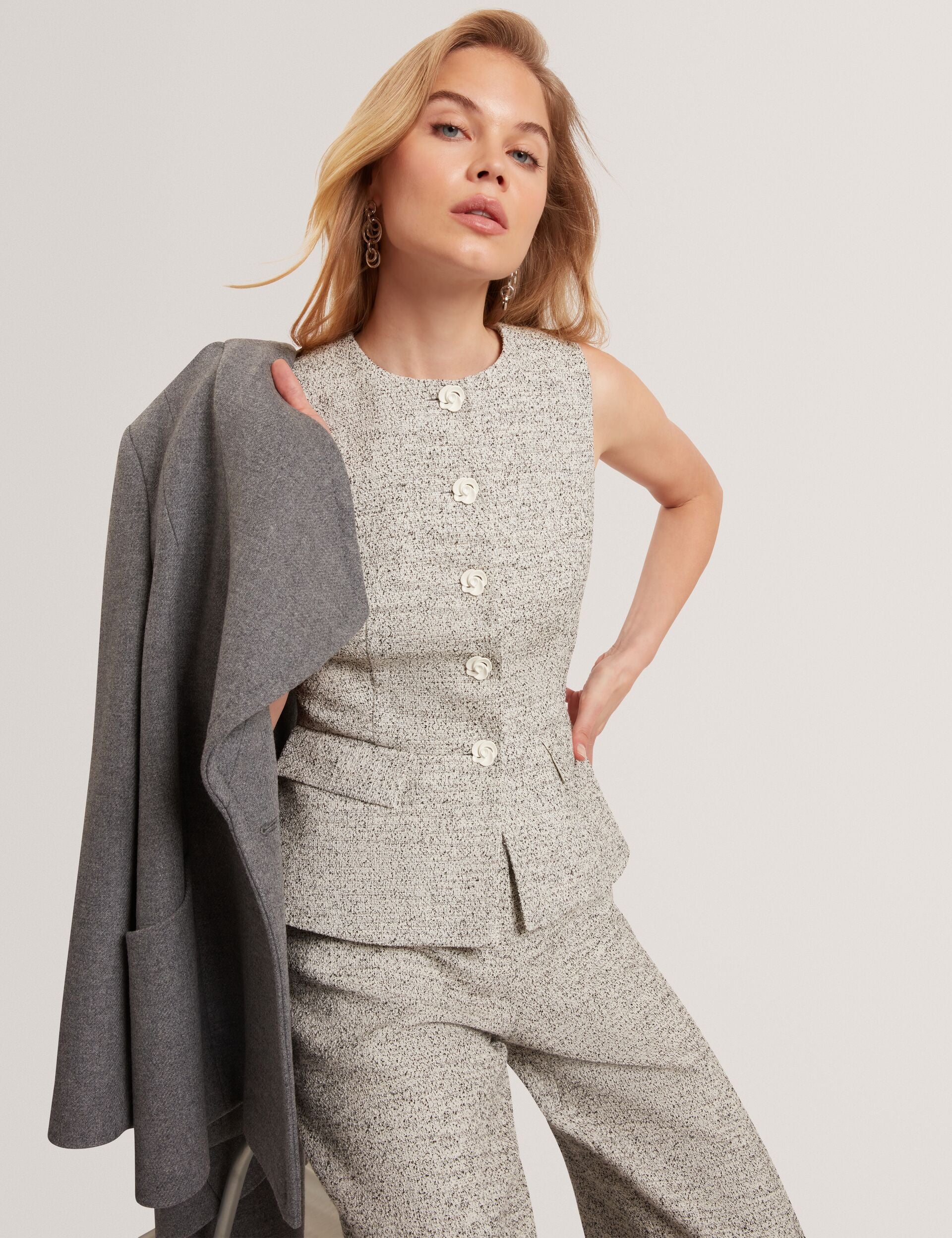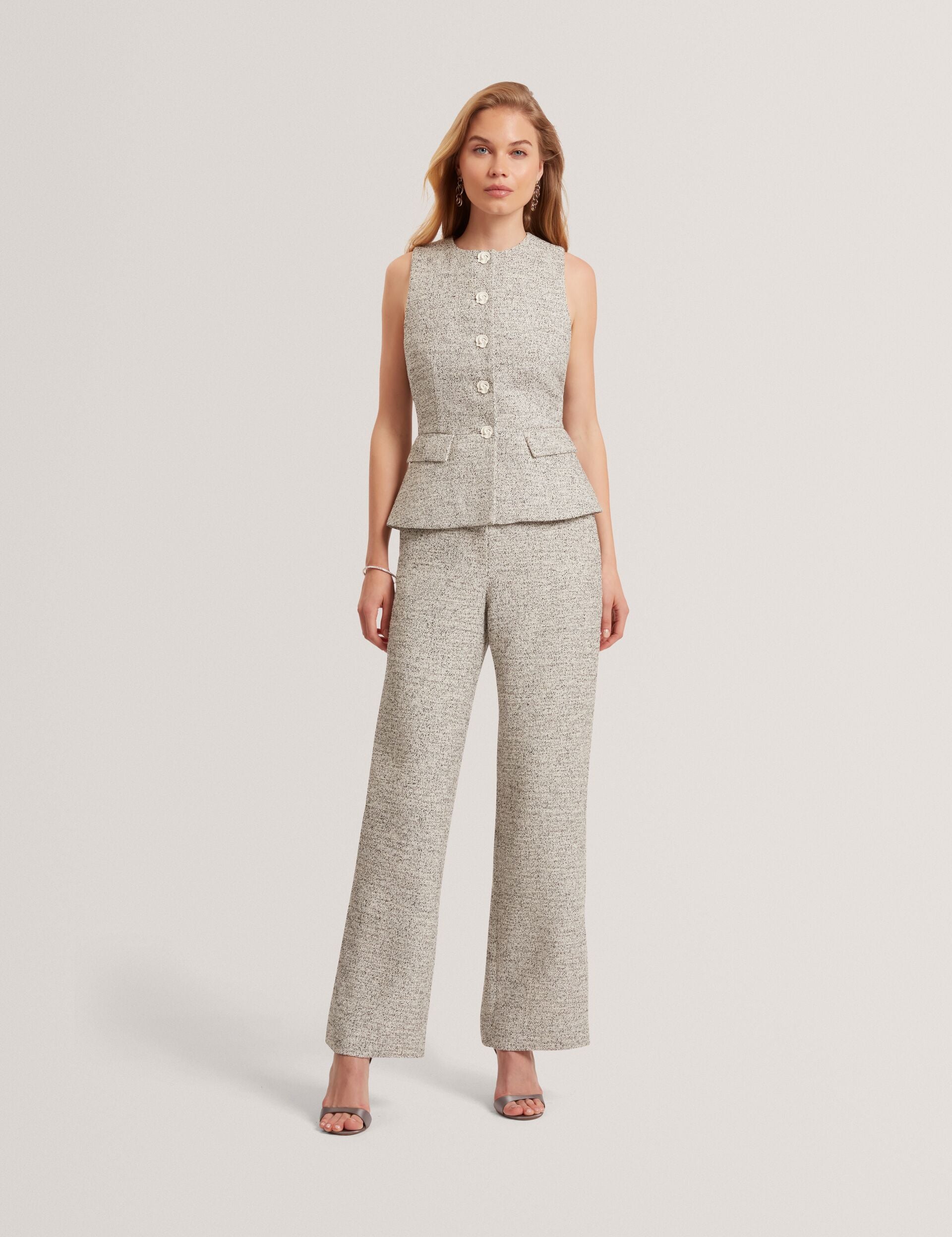 Tailored but never too serious, the EKAAW bouclé waistcoat brings a fresh, feminine energy to traditional suiting. Featuring delicate rose-shaped buttons and an hourglass shape, it’s made to flatter, layer, and stand out.