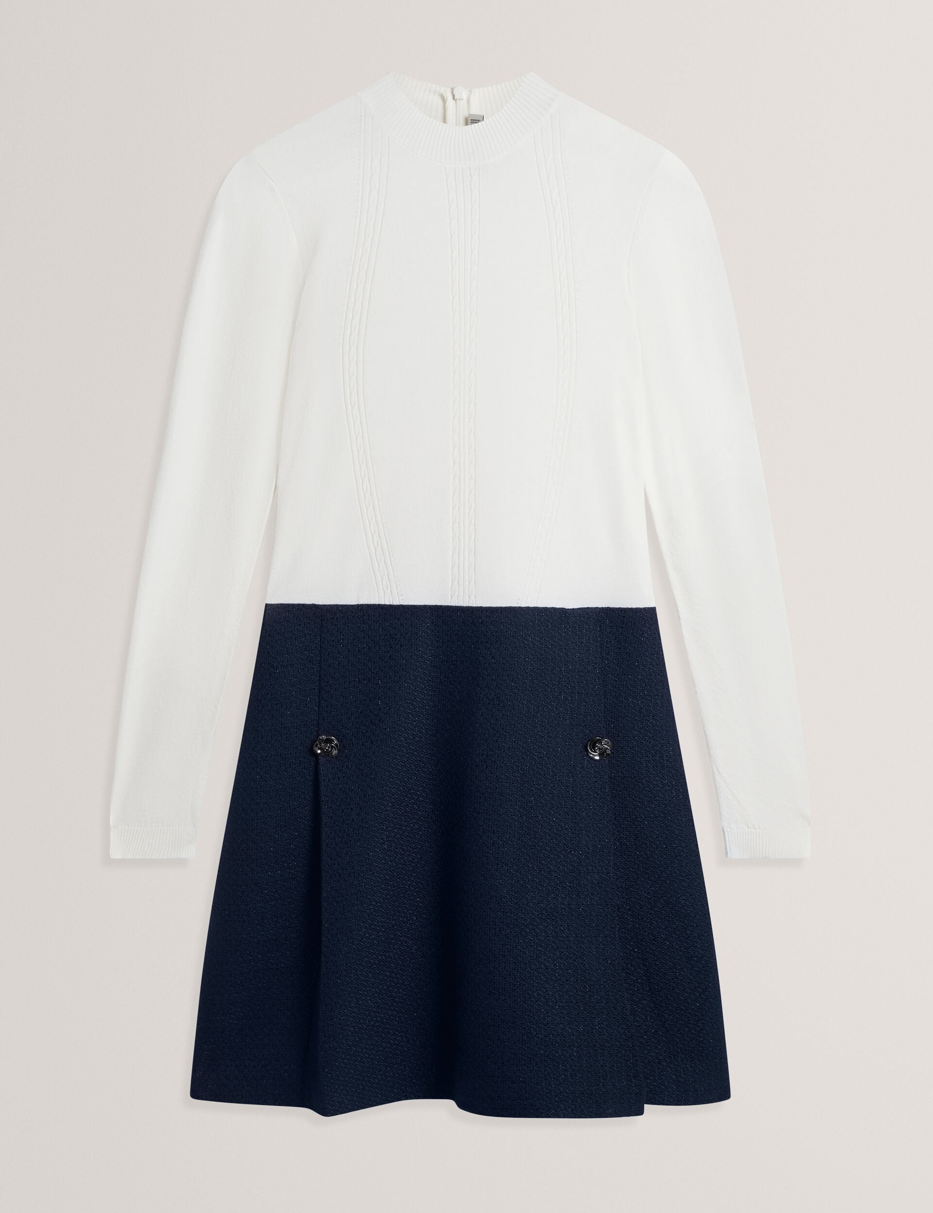 From workdays to cocktail hours, this FLOXAM mini dress feels effortlessly put-together. A cream knit bodice is elevated by cable detailing and ribbed trims, which is added to a navy boucle skirt to give you that classic tailored look.