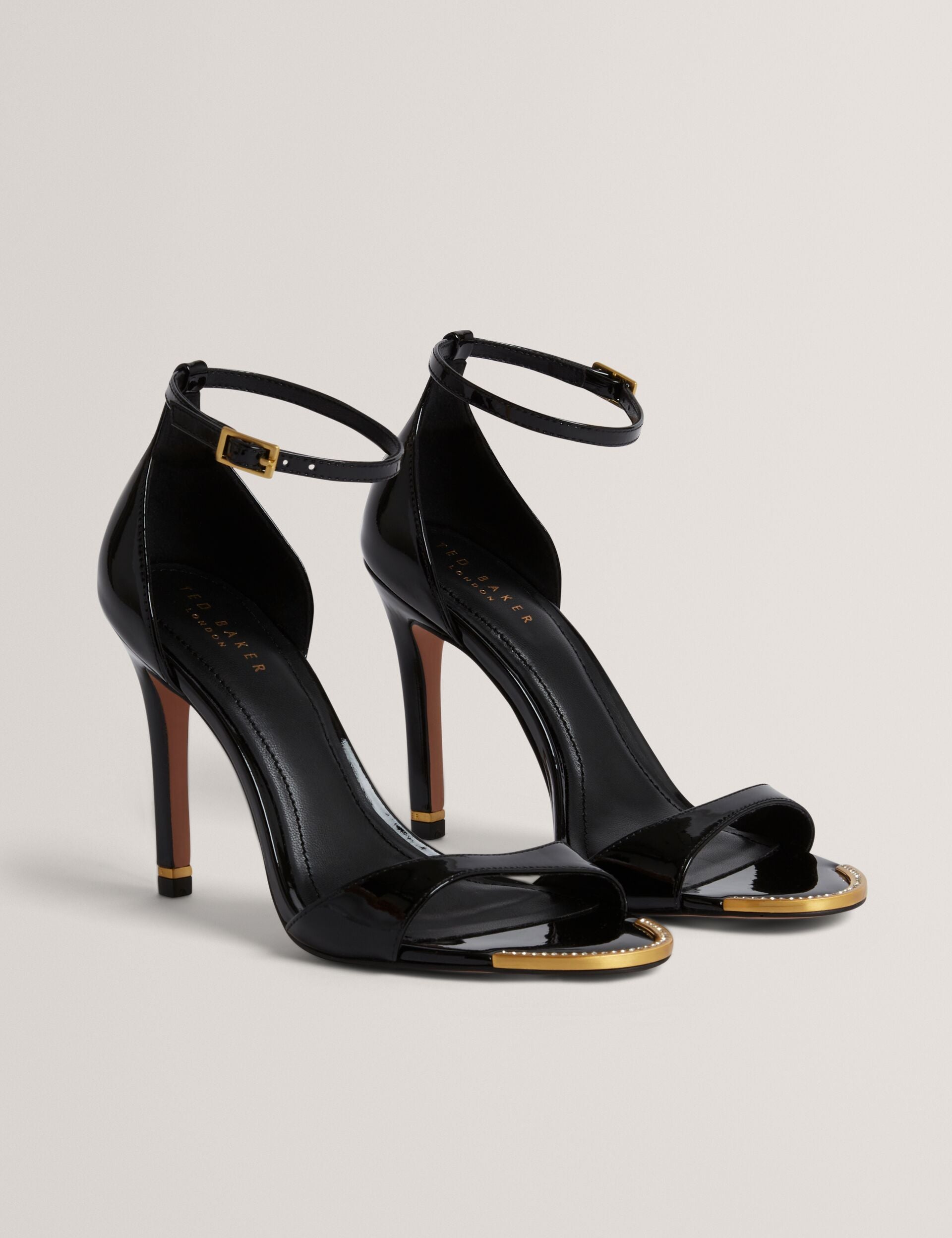 Crafted from patent leather with a sleek stiletto heel, the HELLIY sandals offer elevated style and effortless sophistication for day or evening, plus the crystal hardware bar detail at the toe adds a sparkle to your step.