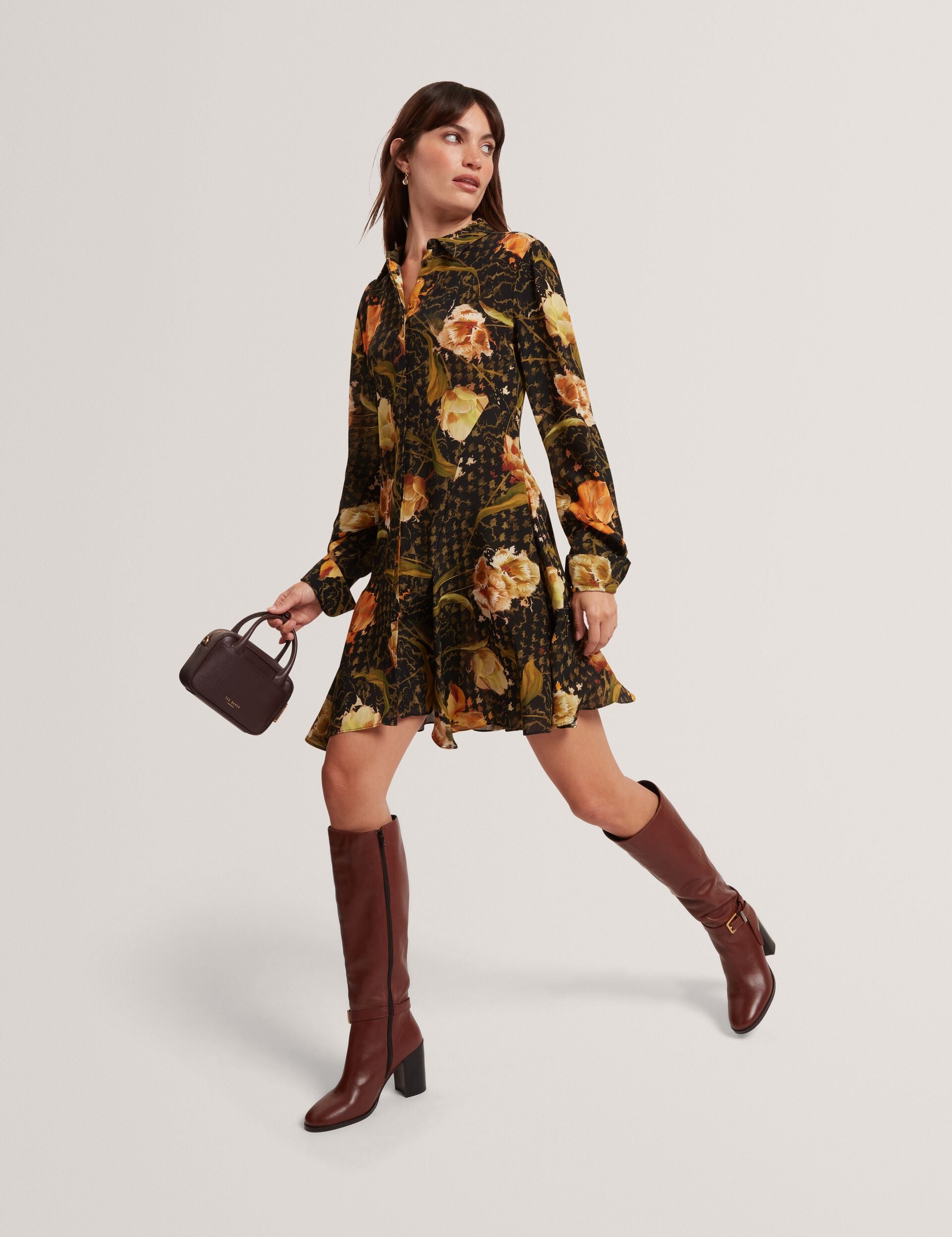 INDIVIA turns the classic shirt dress silhouette into a fun and flirty statement. Designed with a warm-tone floral check print and a flippy pleated skirt, this button-up mini is poised to charm from day to night.