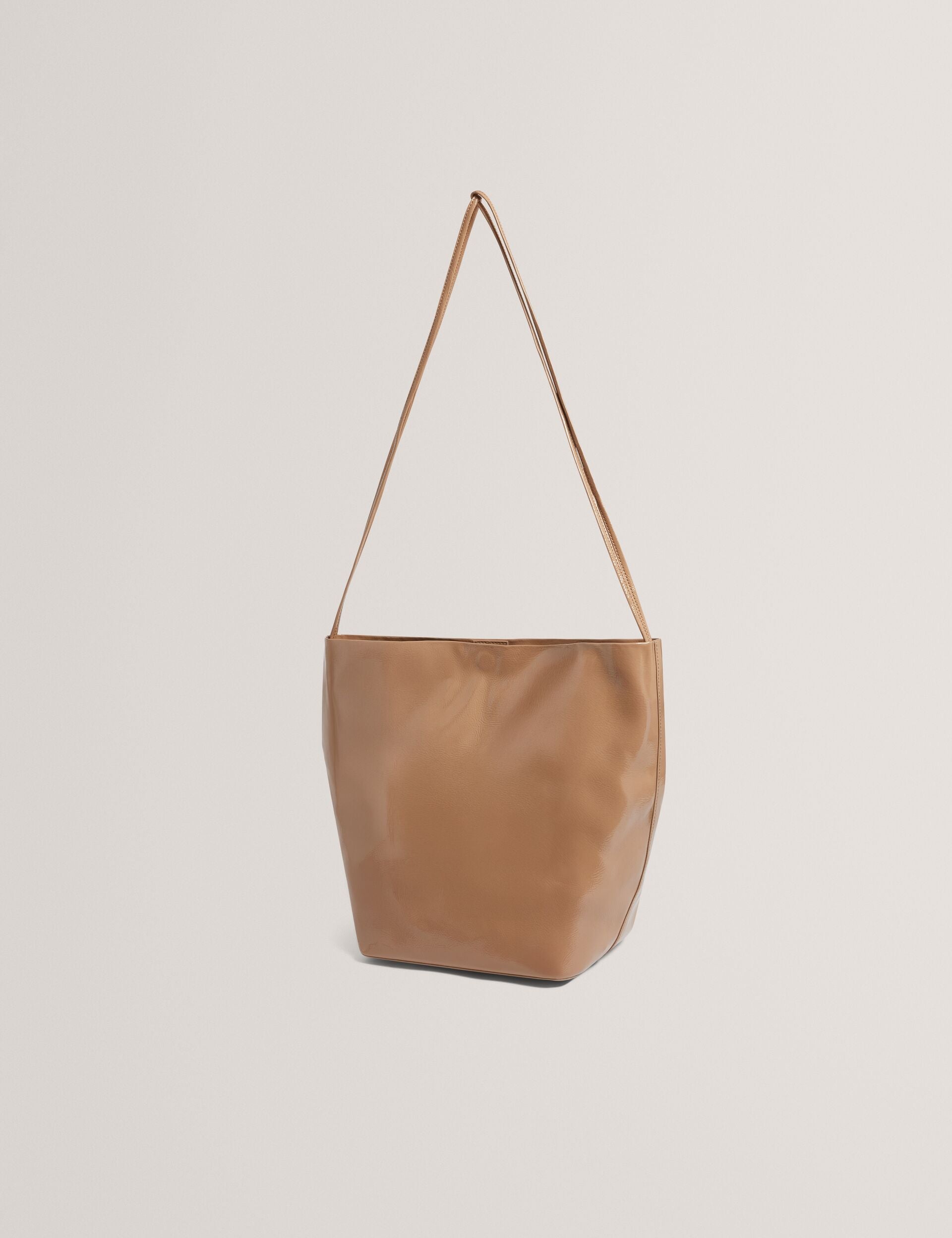 Sleek and minimalist, the KAMILAA bucket bag features a slim shoulder strap and roomy interior. Its patent faux leather is finished with a crinkled texture for effortless, everyday style.
