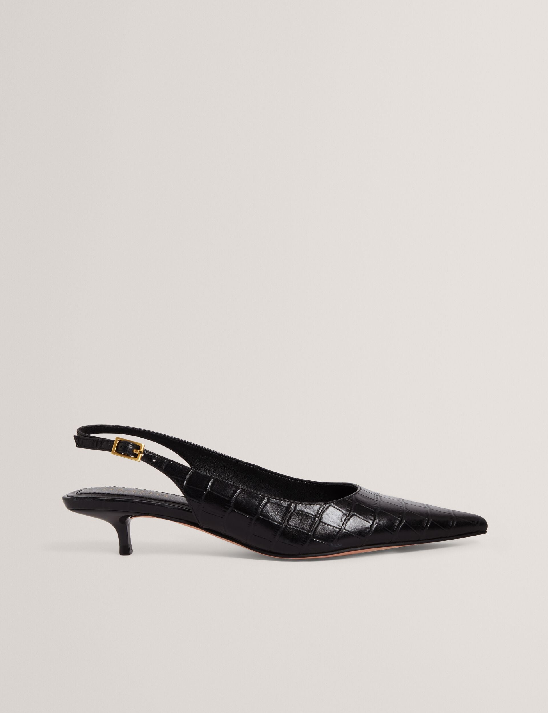 Throw on these KITIY kitten heel shoes to instantly elevate outfits day and night. These pointed toe pumps are crafted from a supple croc texture leather and slip on with a chic slingback strap.