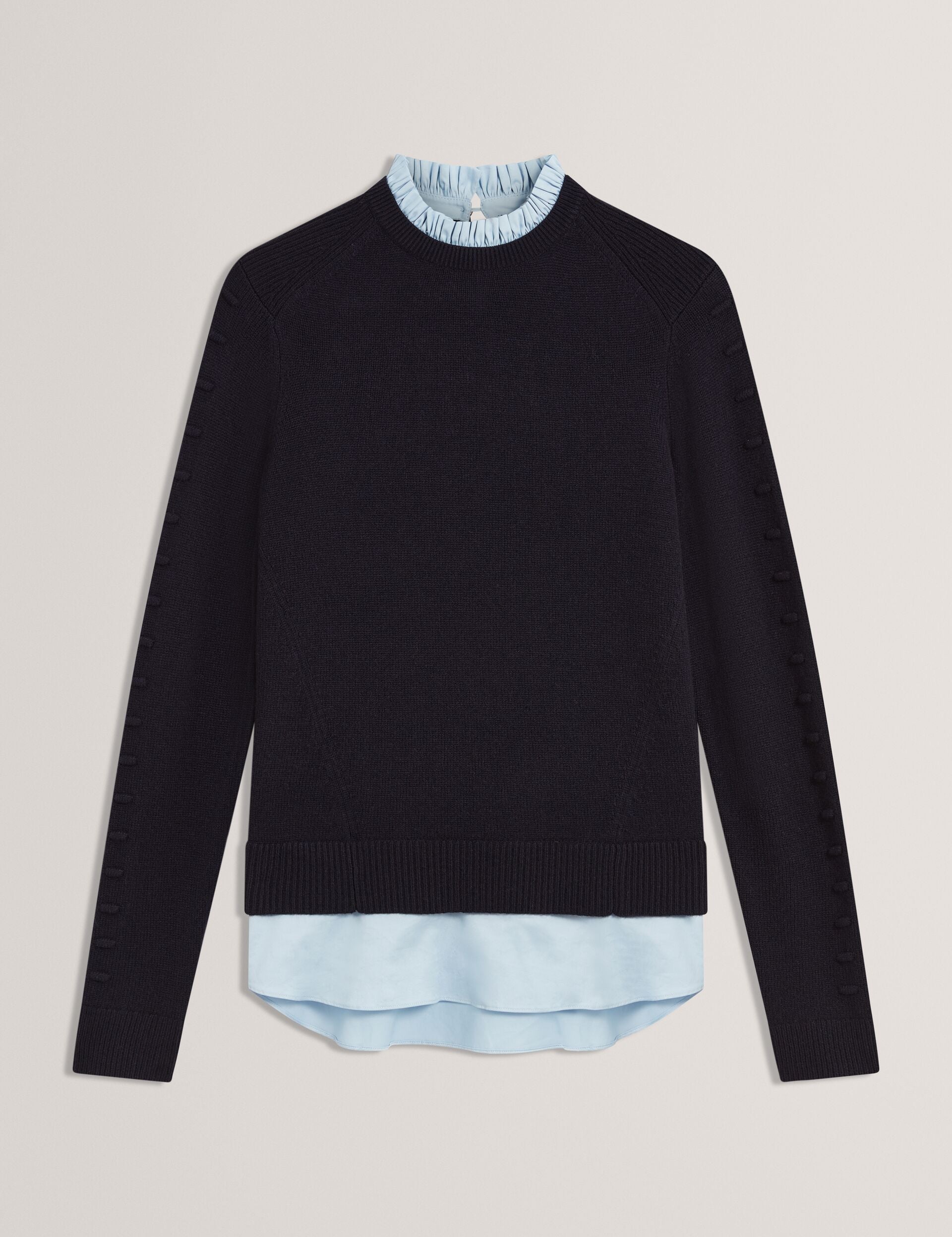 Opt for a smarter style of jumper with LISSIAH, pairing cotton shirt style trims with a wool cashmere blend knit. A longline hem makes it work well with both jeans and tailored trousers, whilst the ruffled neckline and bobble sleeve detail give it a touch of texture.
