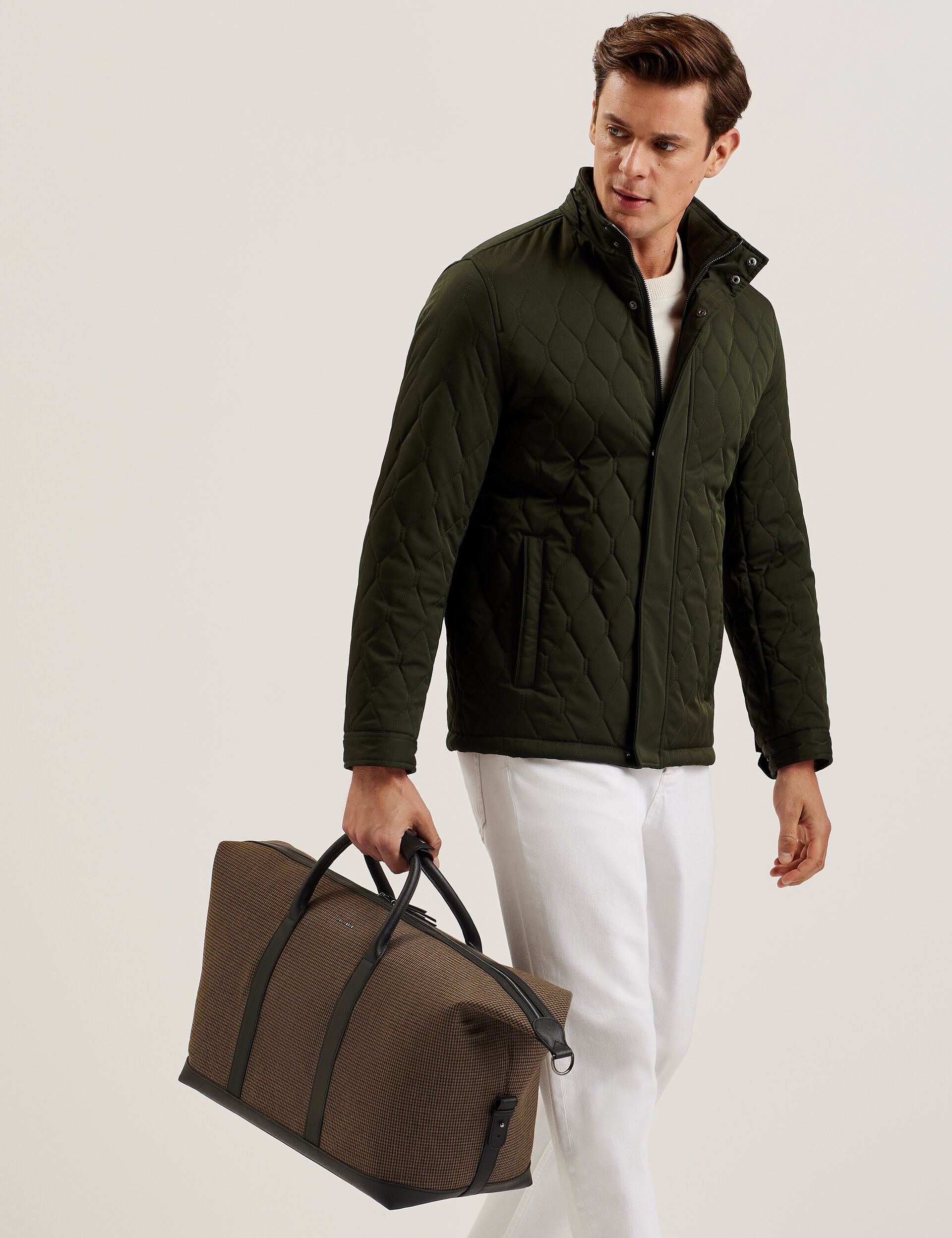 The MALCOM holdall bag is the only accessory needed for your weekend getaway. A checked wool blend fabric gives it a preppy feel, elevated by faux leather trims with a crosshatch texture. It's easy to carry on your travels thanks to top handles that feature a handy holder tab, as well as a removable strap fitted with shoulder pad.