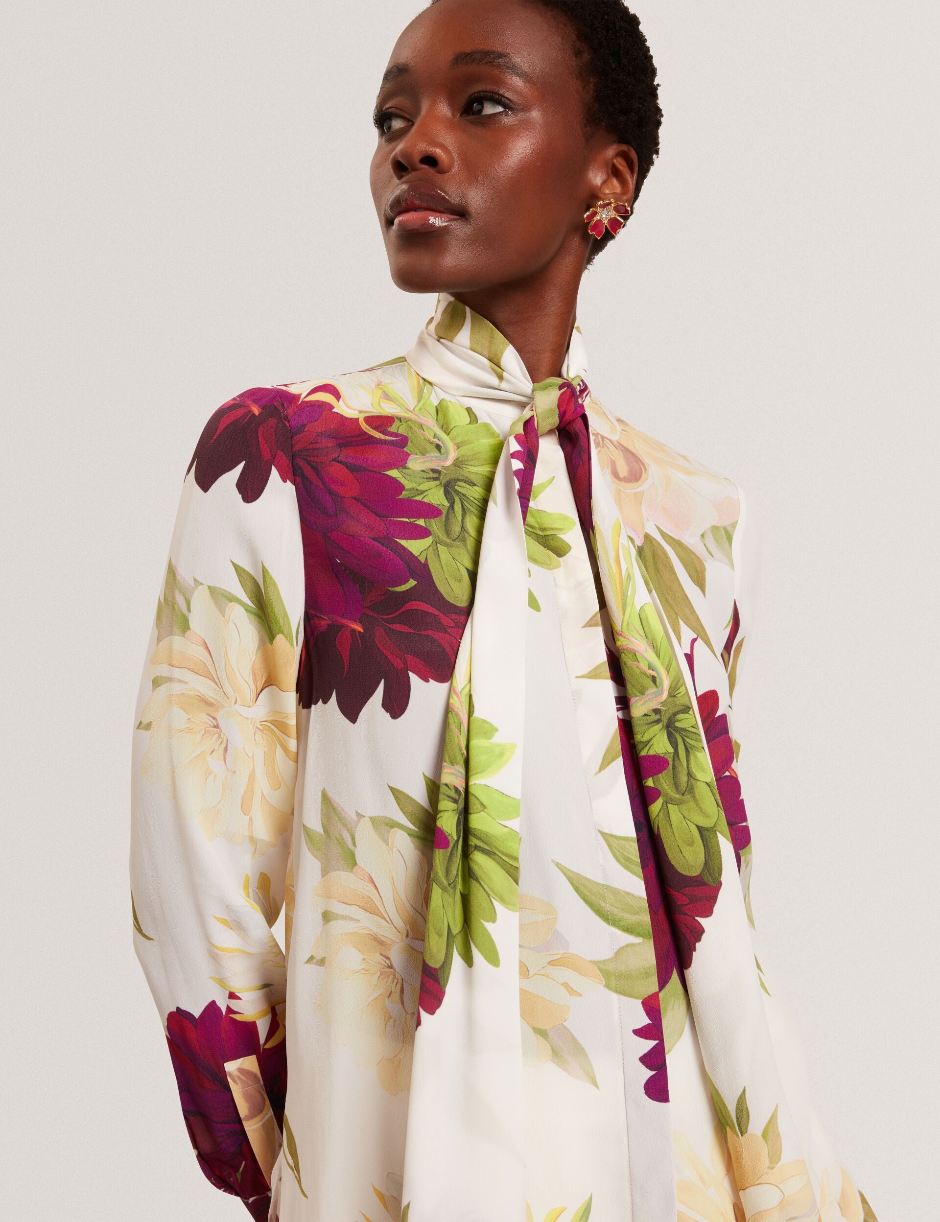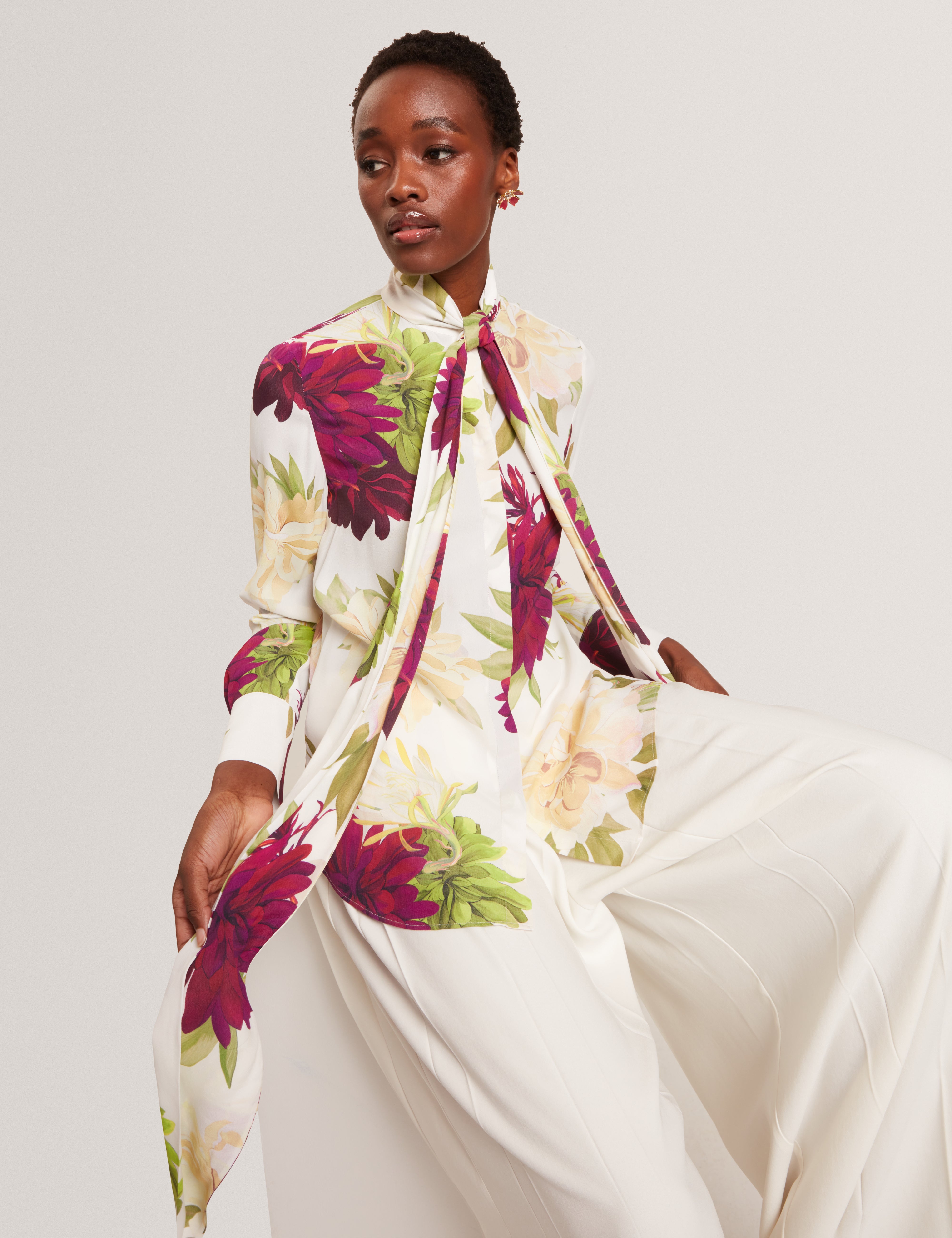 - High neck with scarf-style tie