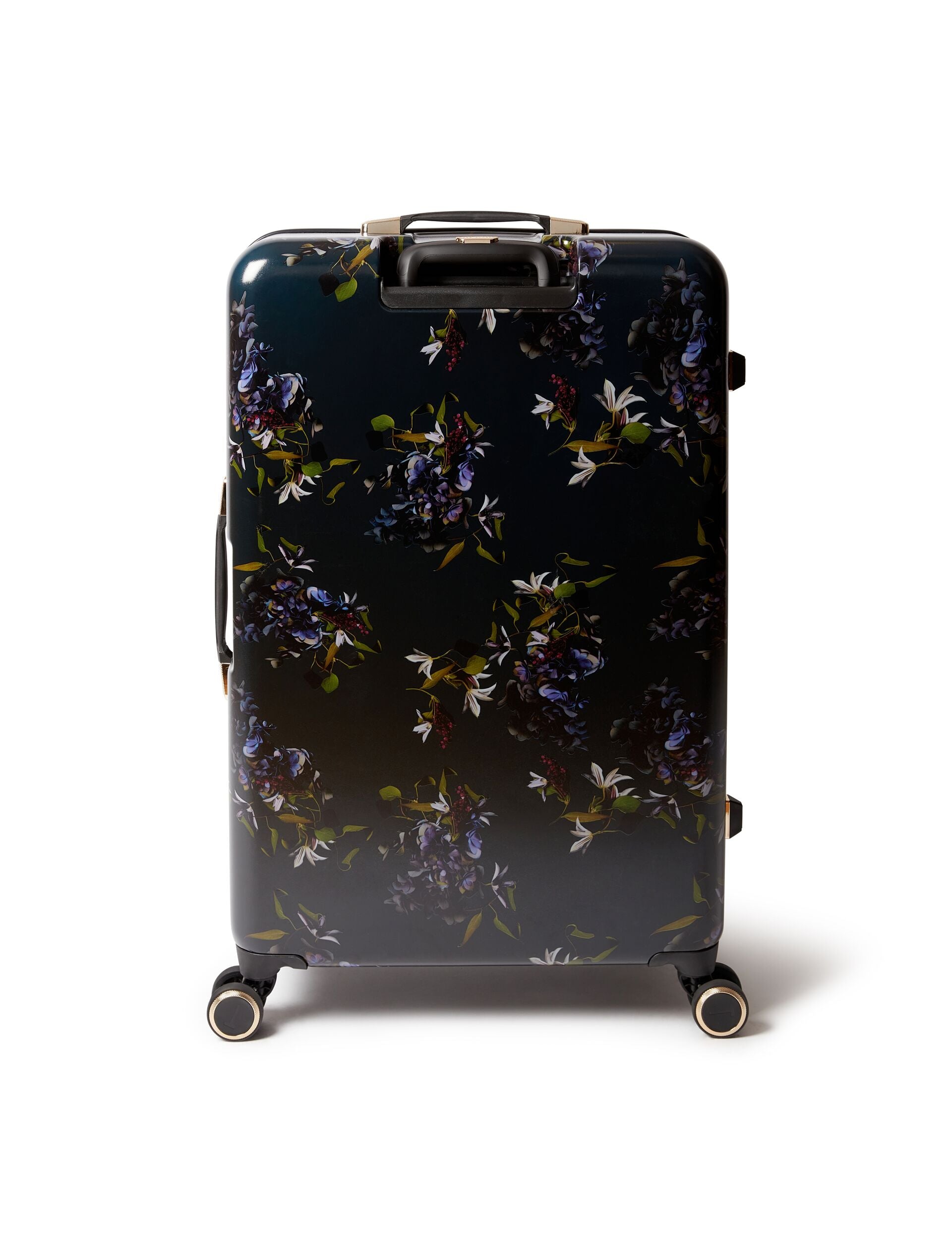 Our Midnight Bloom large suitcase is serious on style and packing space. A spacious interior with zipped divider keeps your luggage organised, protected by a TSA lock and hard shell outer. And for a truly Ted Baker statement, it's finished with a dramatically dark floral print.