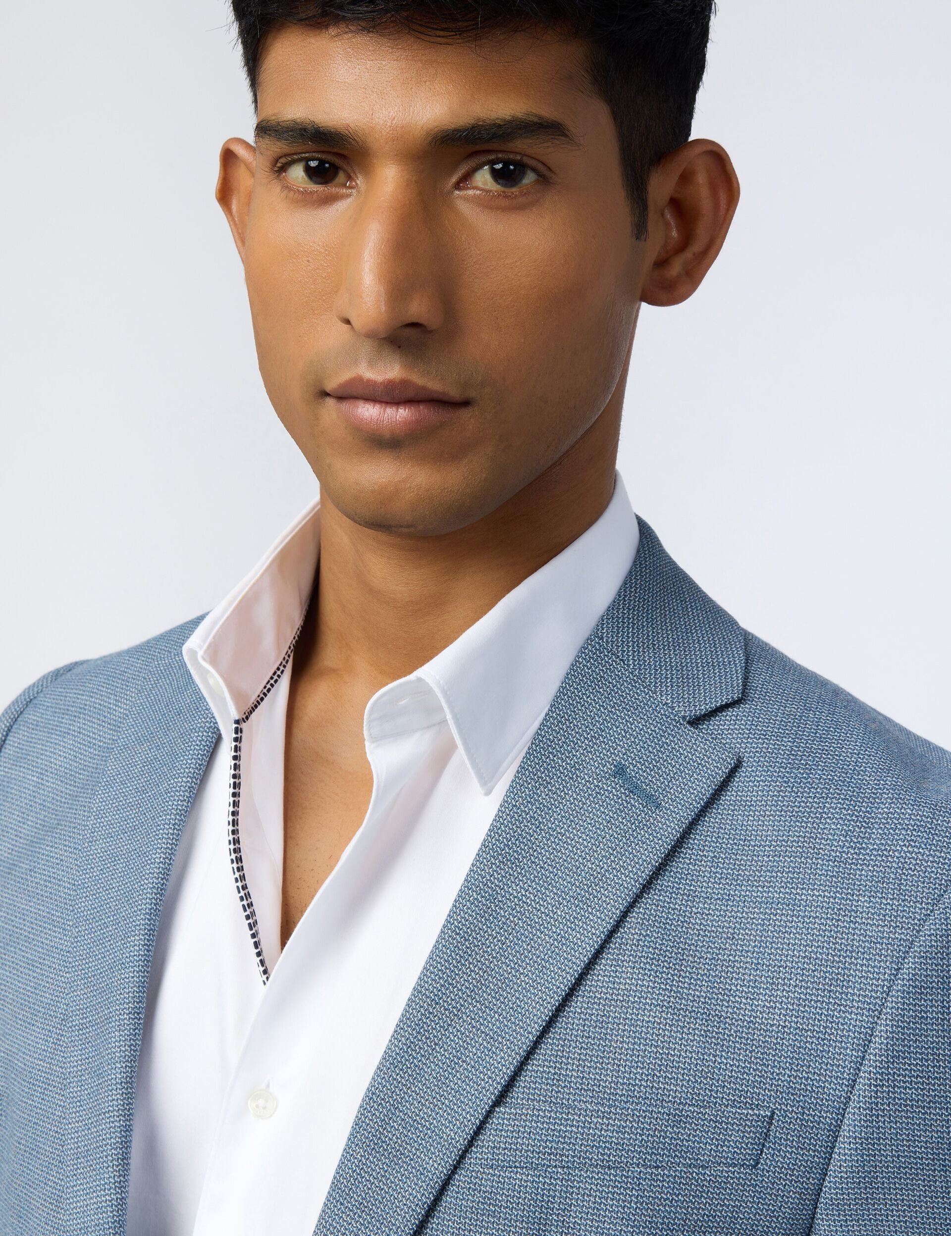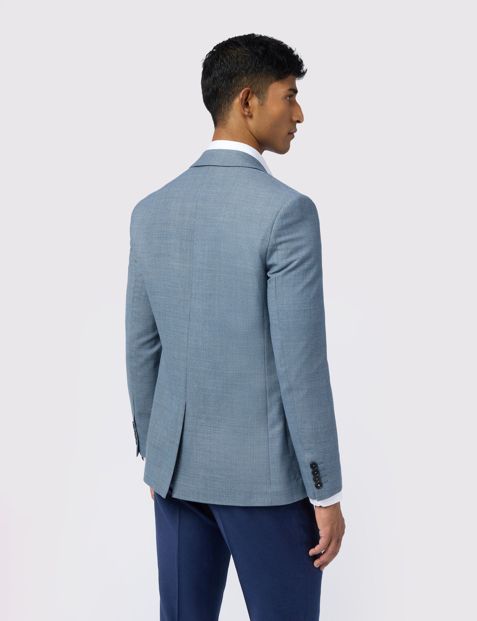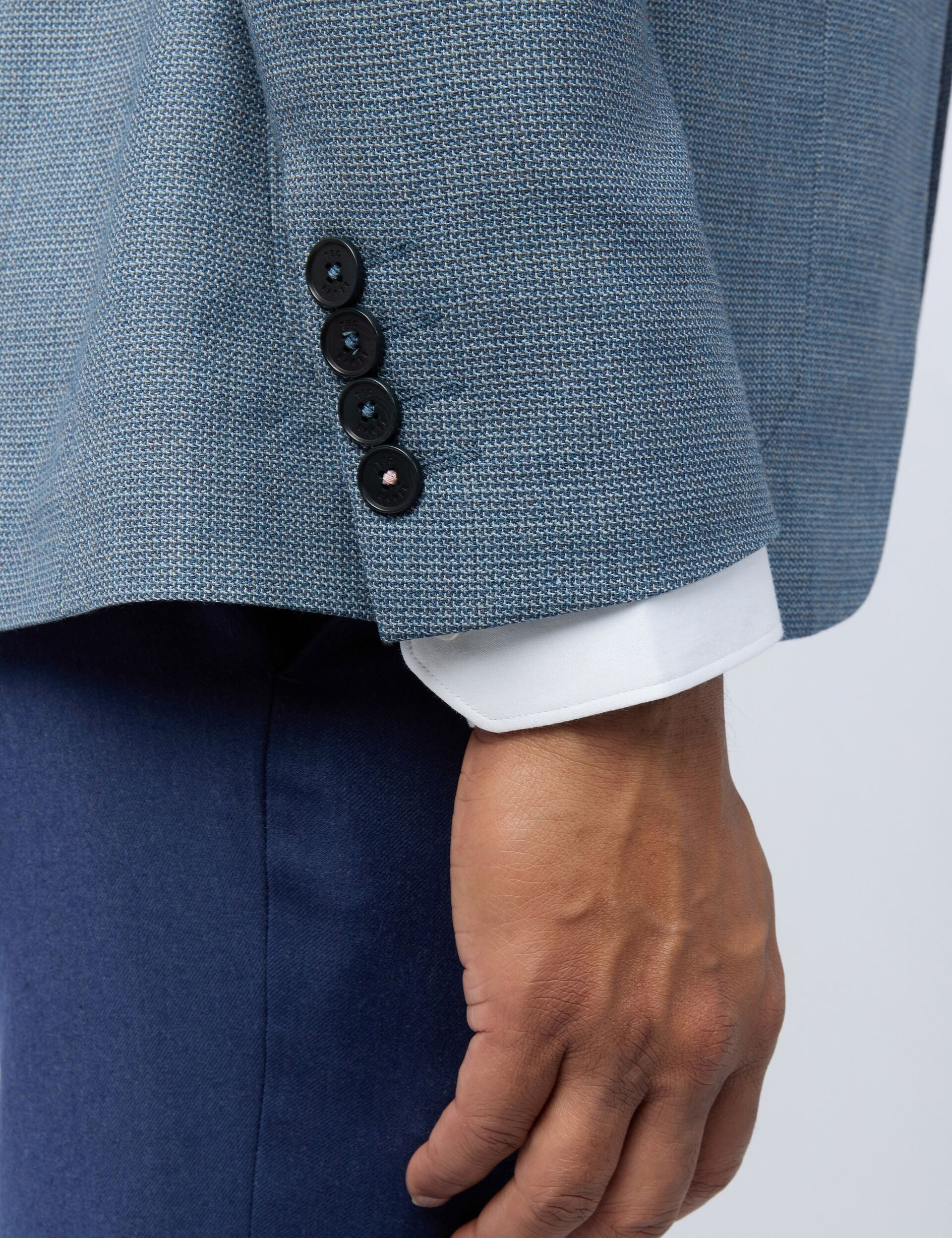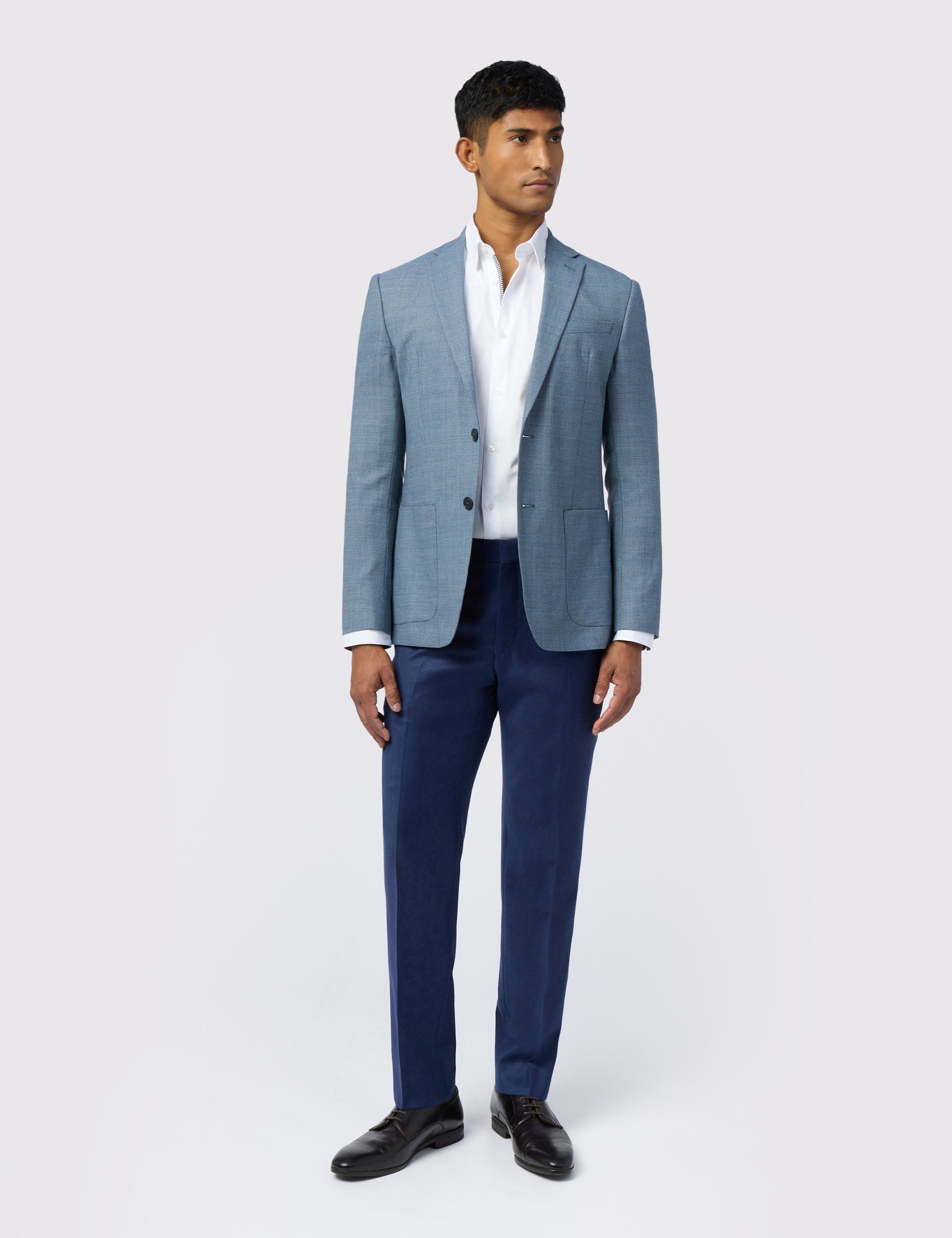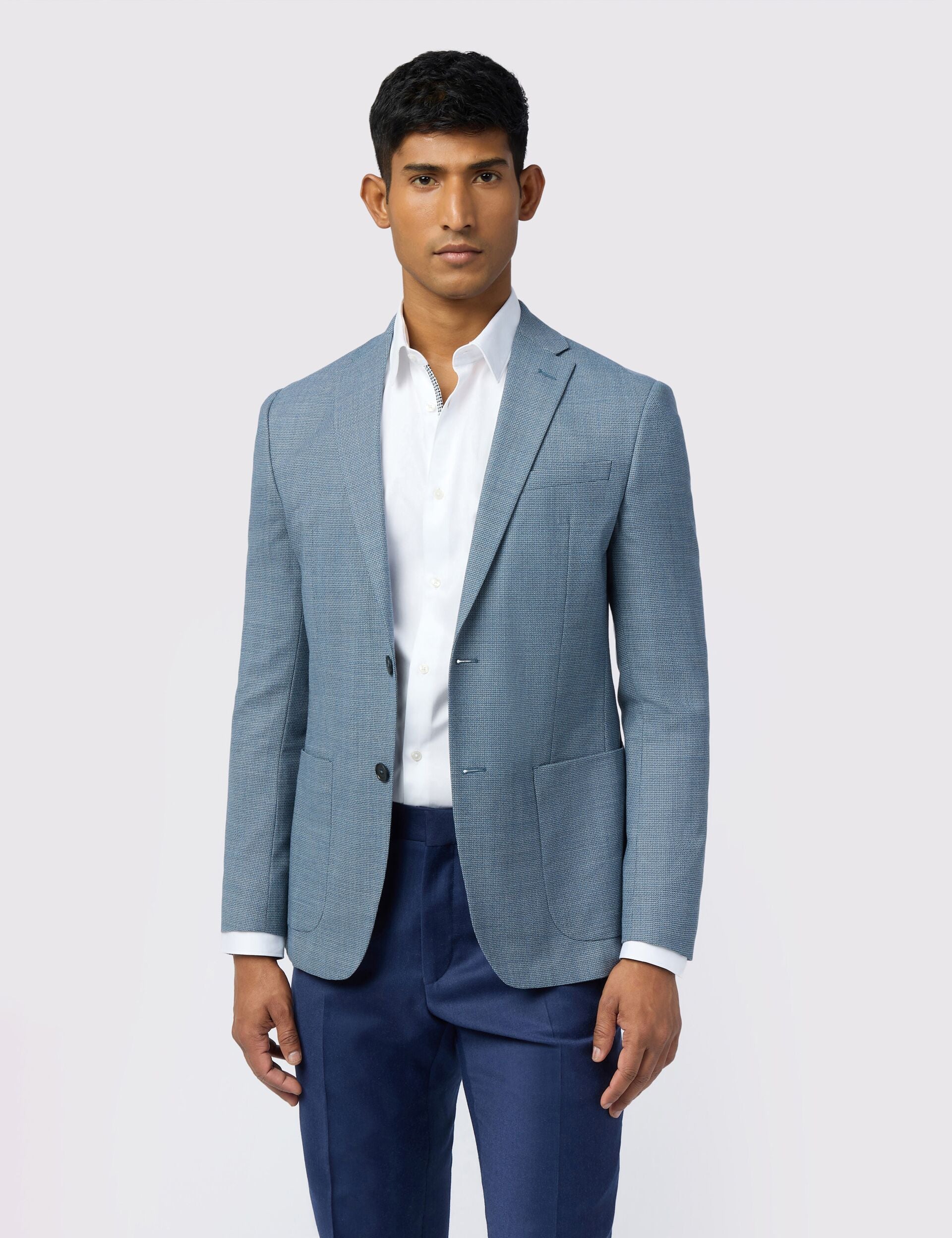 Add depth to your smart style with the ORAM blue blazer, designed with a hopsack woven texture that's full of character. Crafted from a wool-rich blend with stretch, this slim fit jacket layers comfortably over cotton shirts and light knits.