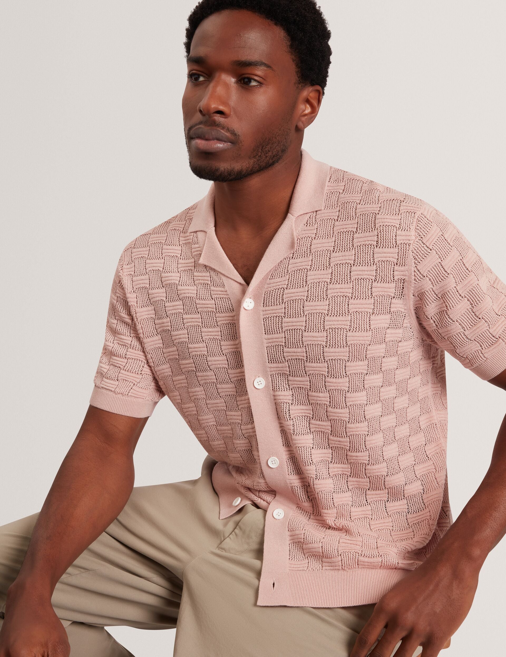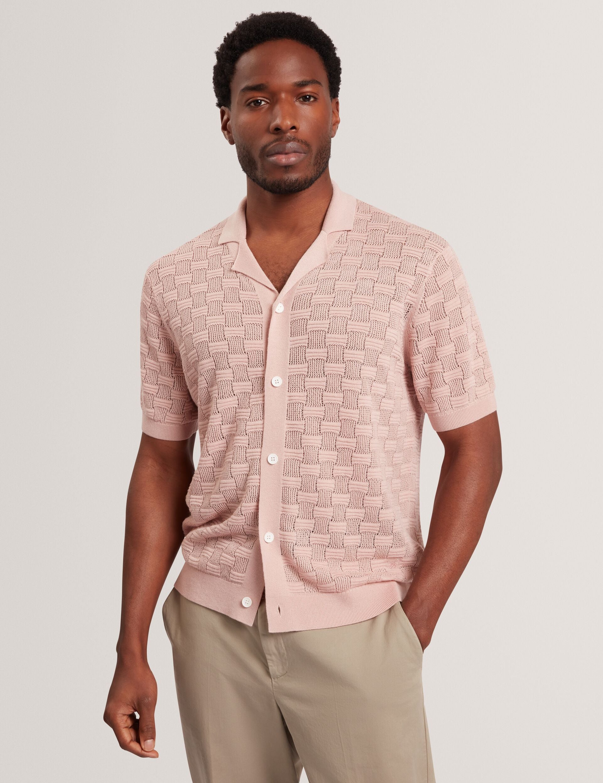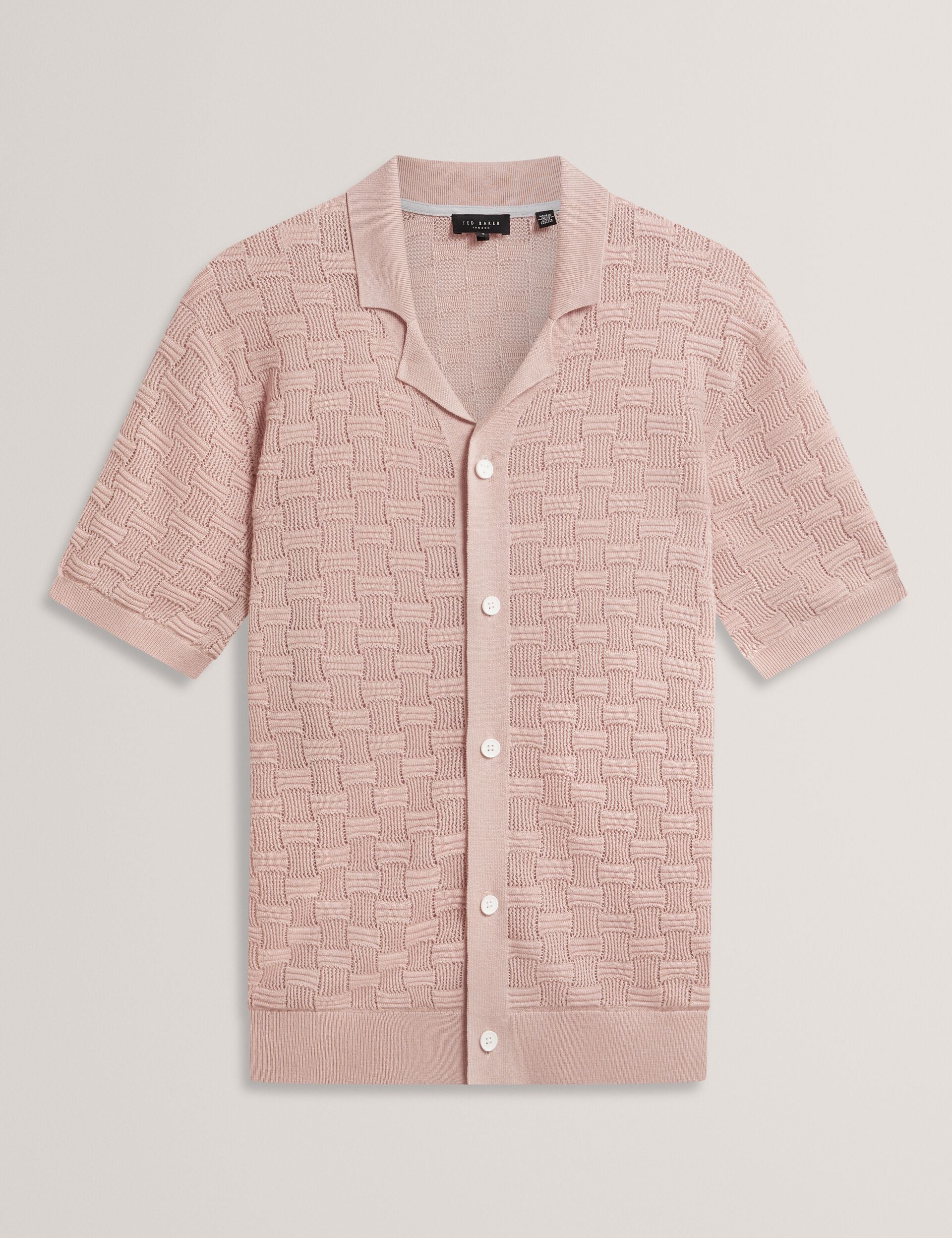 Crafted from a breathable wool blend knit with a luxe touch of silk, the ROWWANN short sleeve shirt is designed with a unique basketweave texture in a soft shade of pink that instantly uplifts any outfit.