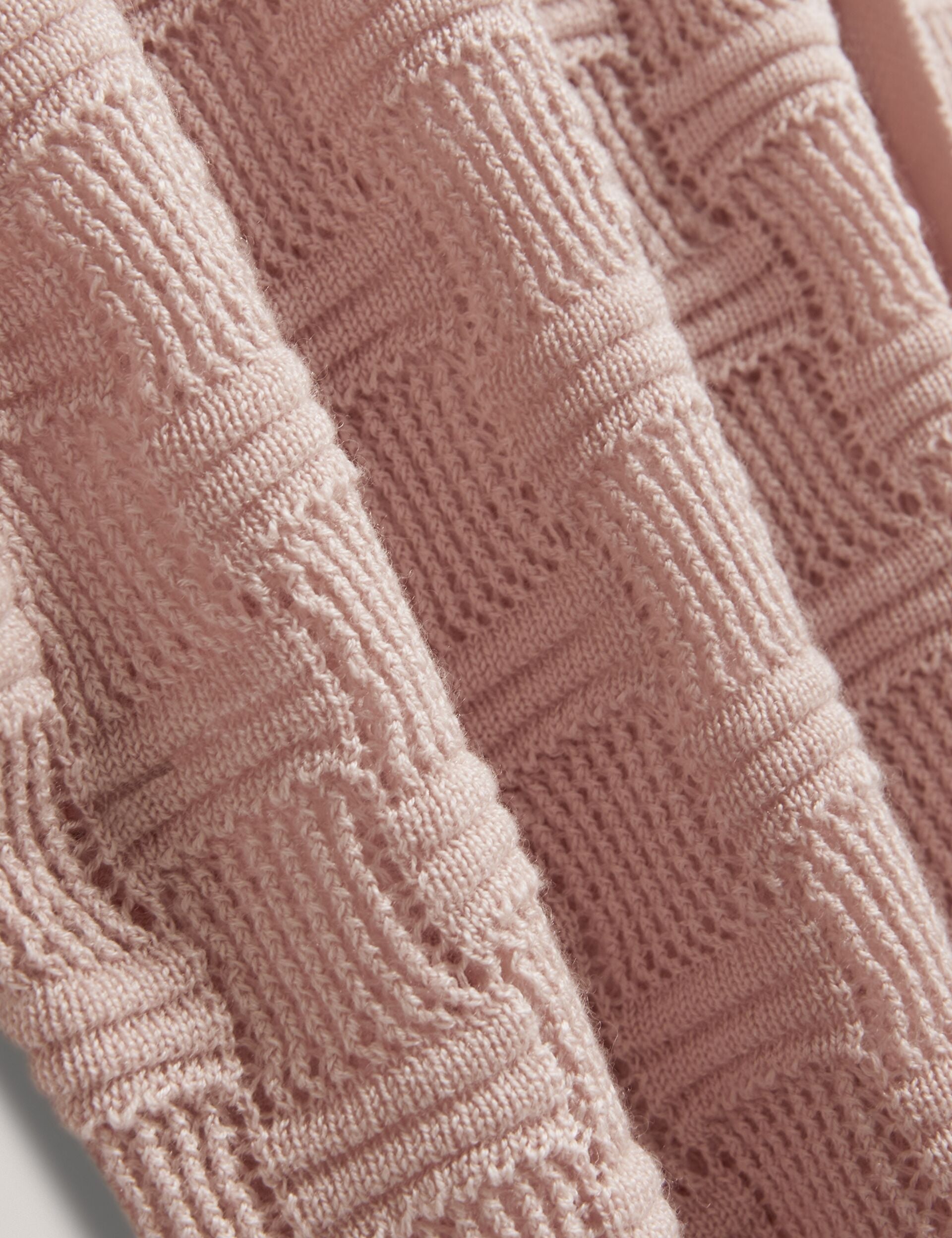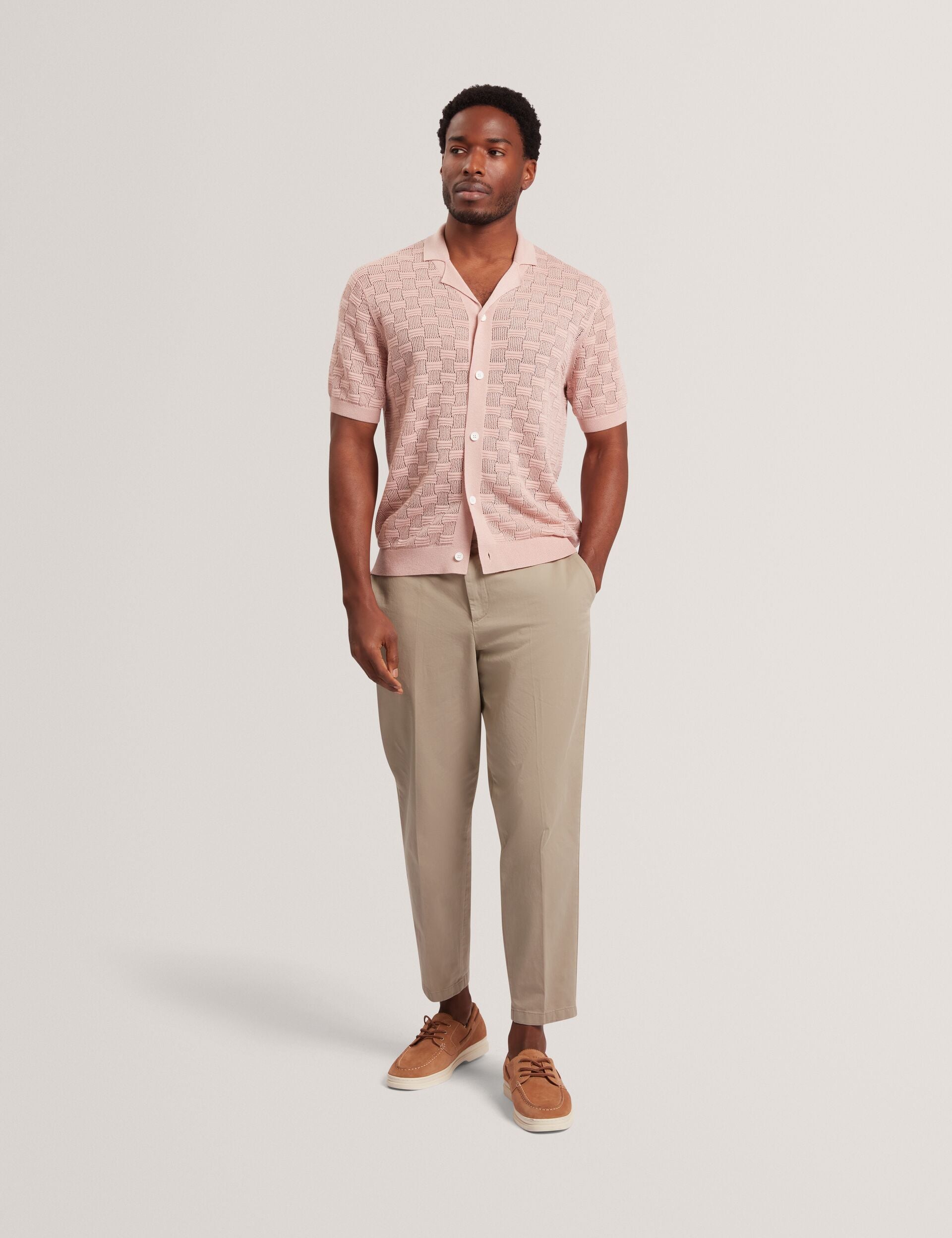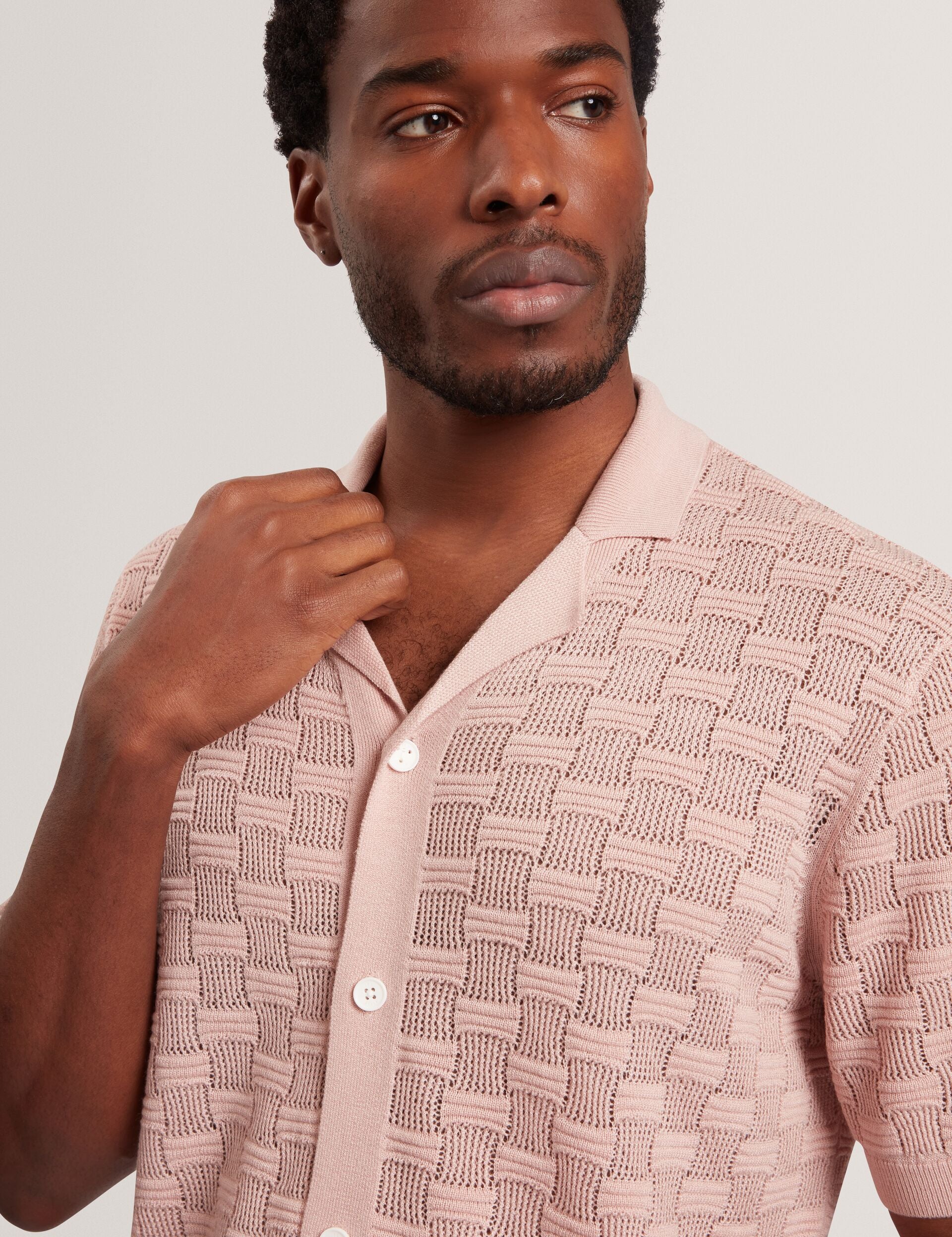 Crafted from a breathable wool blend knit with a luxe touch of silk, the ROWWANN short sleeve shirt is designed with a unique basketweave texture in a soft shade of pink that instantly uplifts any outfit.