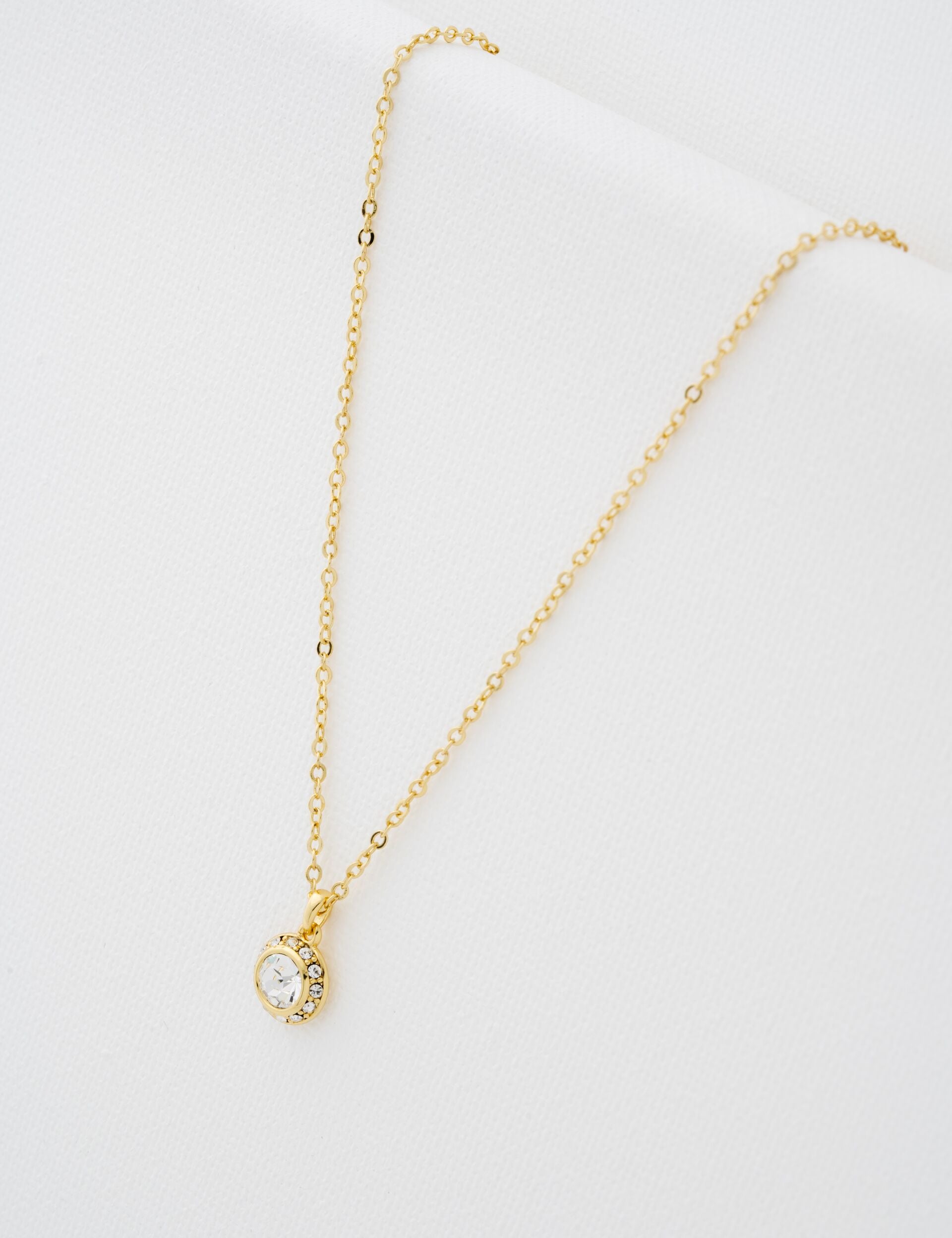 Simplicity is at its finest with SOLTELL. This necklace showcases a pendant set with a single clear crystal at its centre, and surrounded by a pavé crystal halo for all-around shine. Finished with an extendable chain, this versatile piece is fit for any occasion.