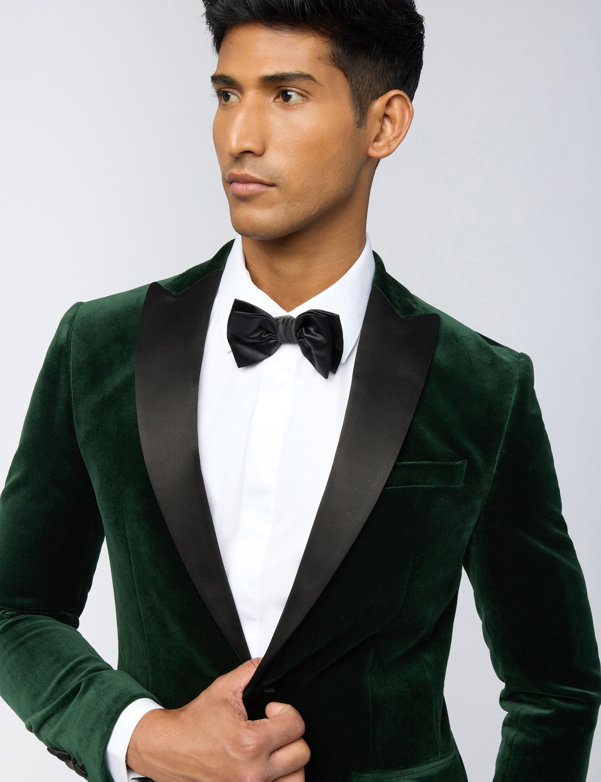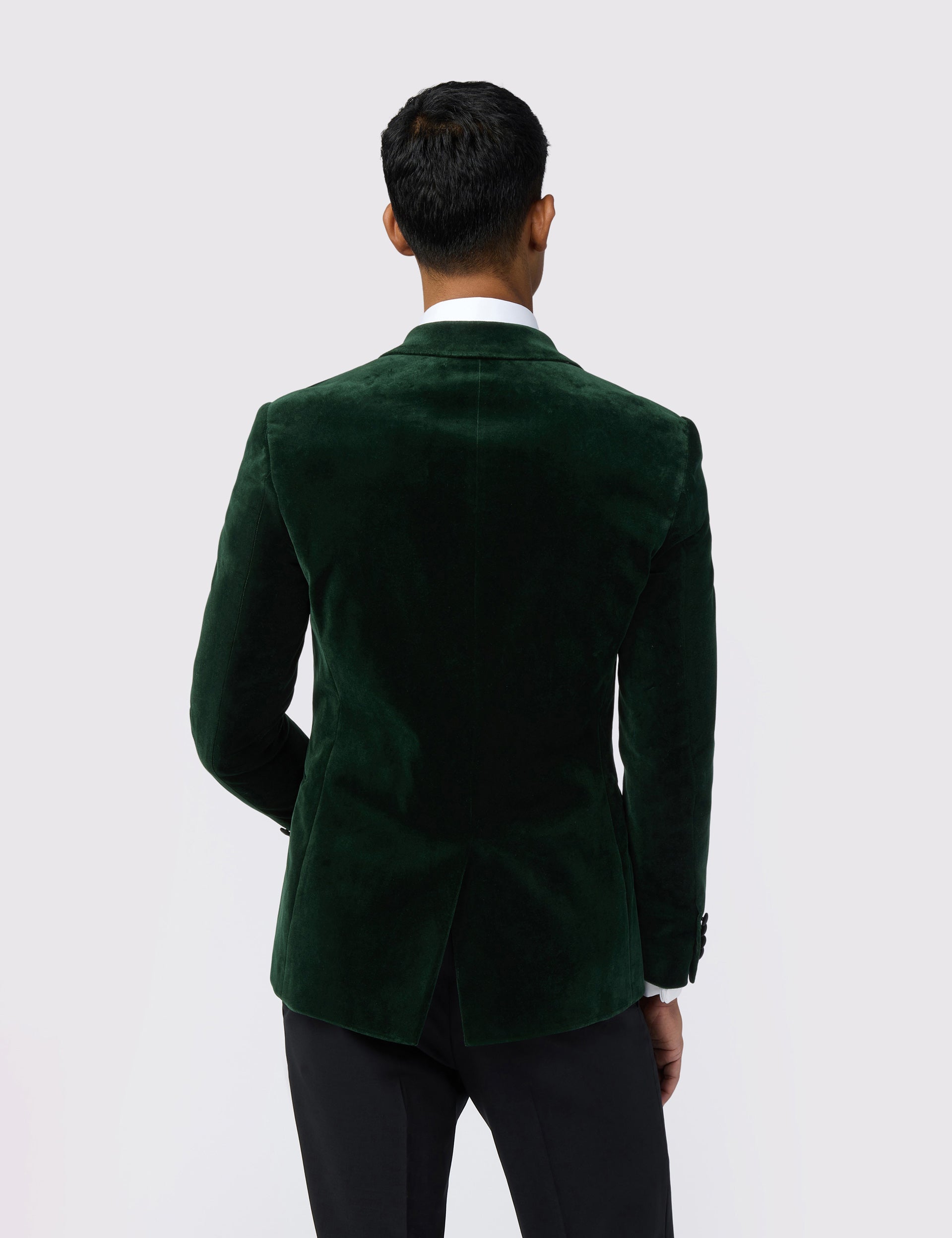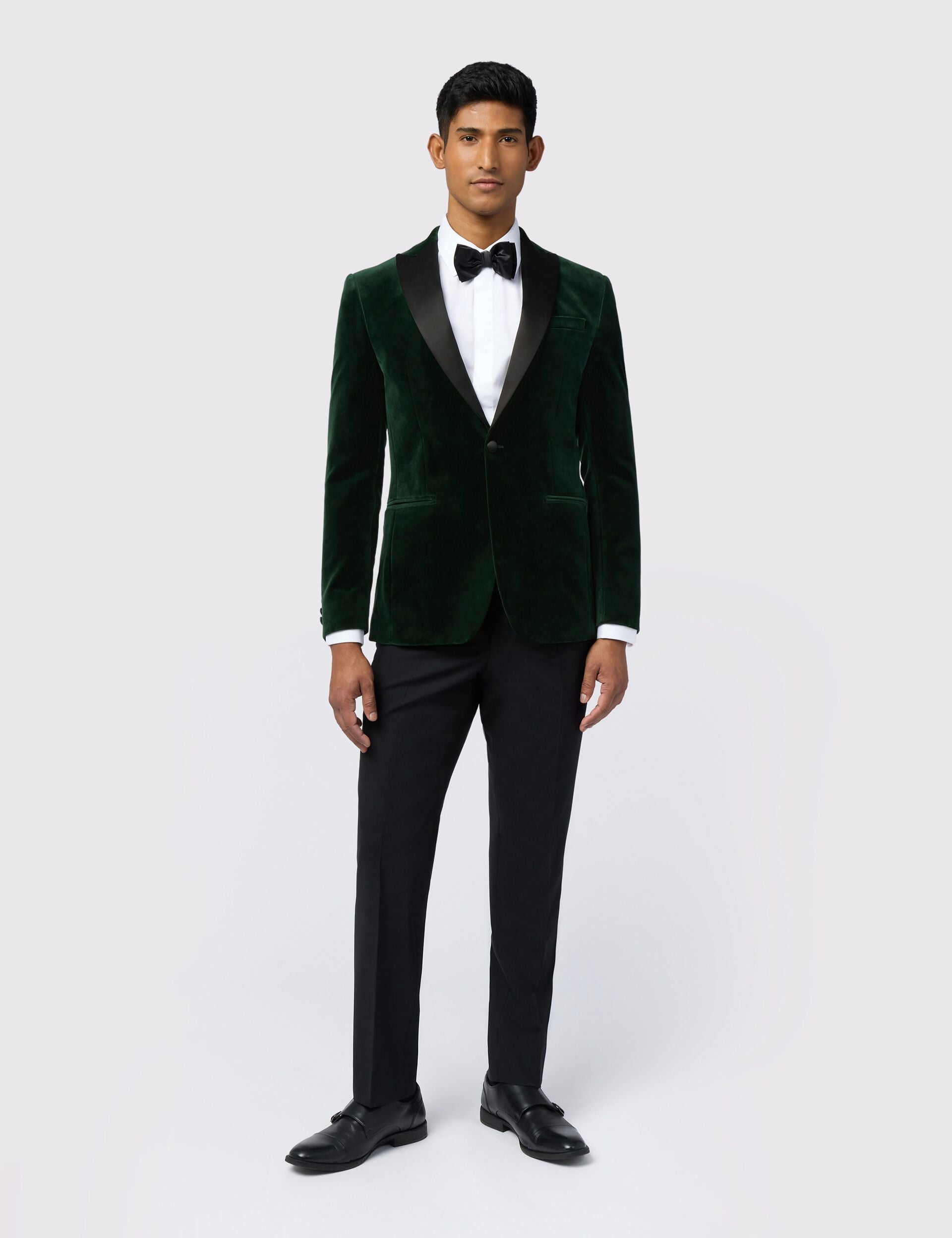 Crafted from luxurious velvet in a forest green shade, the TIGHEJ evening jacket makes a sophisticated statement. A slim fit creates flattering structure, whilst the contrasting black satin lapels give it that tuxedo feel. Pair with black tuxedo trousers for black tie events and festive celebrations.