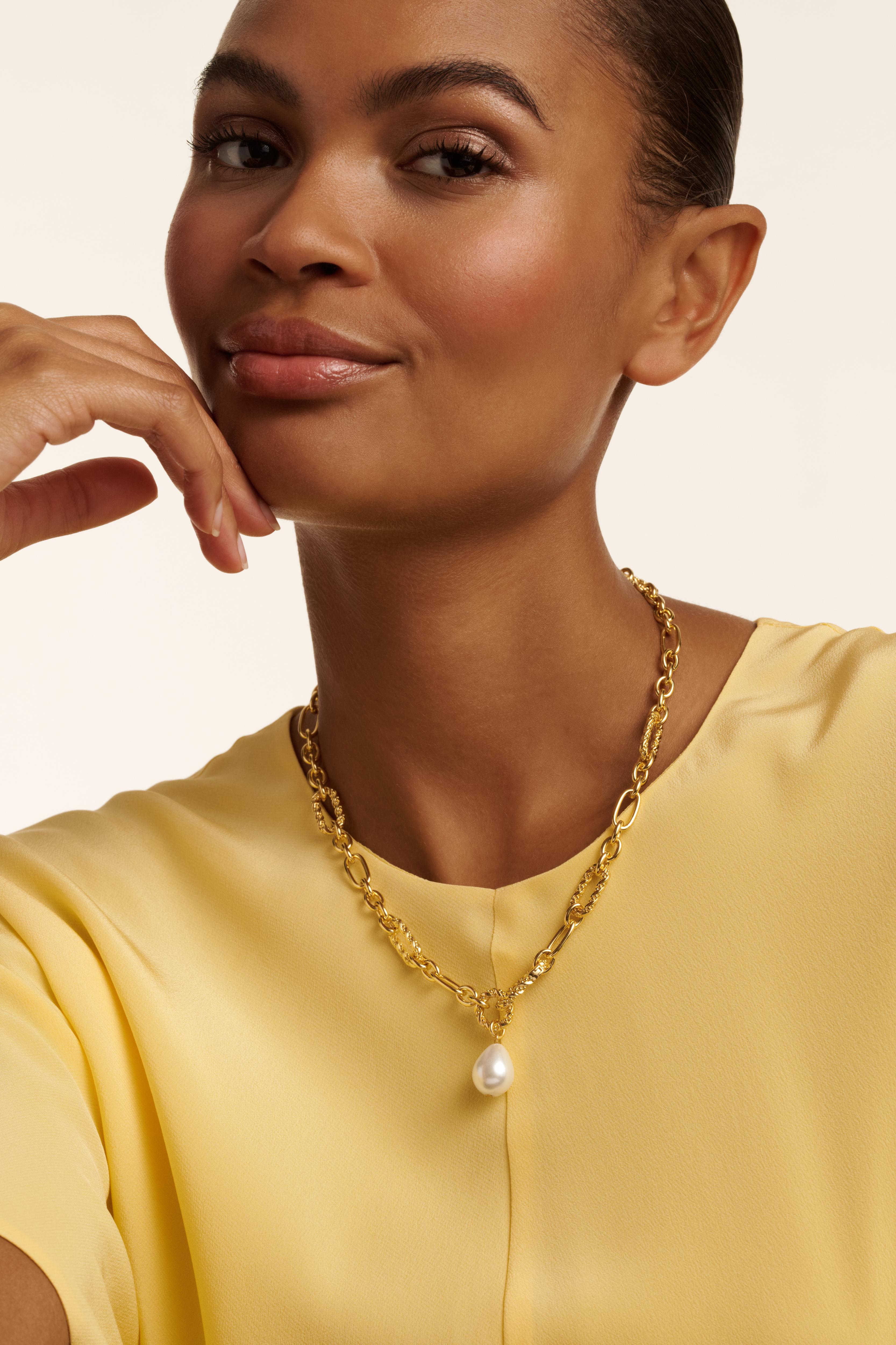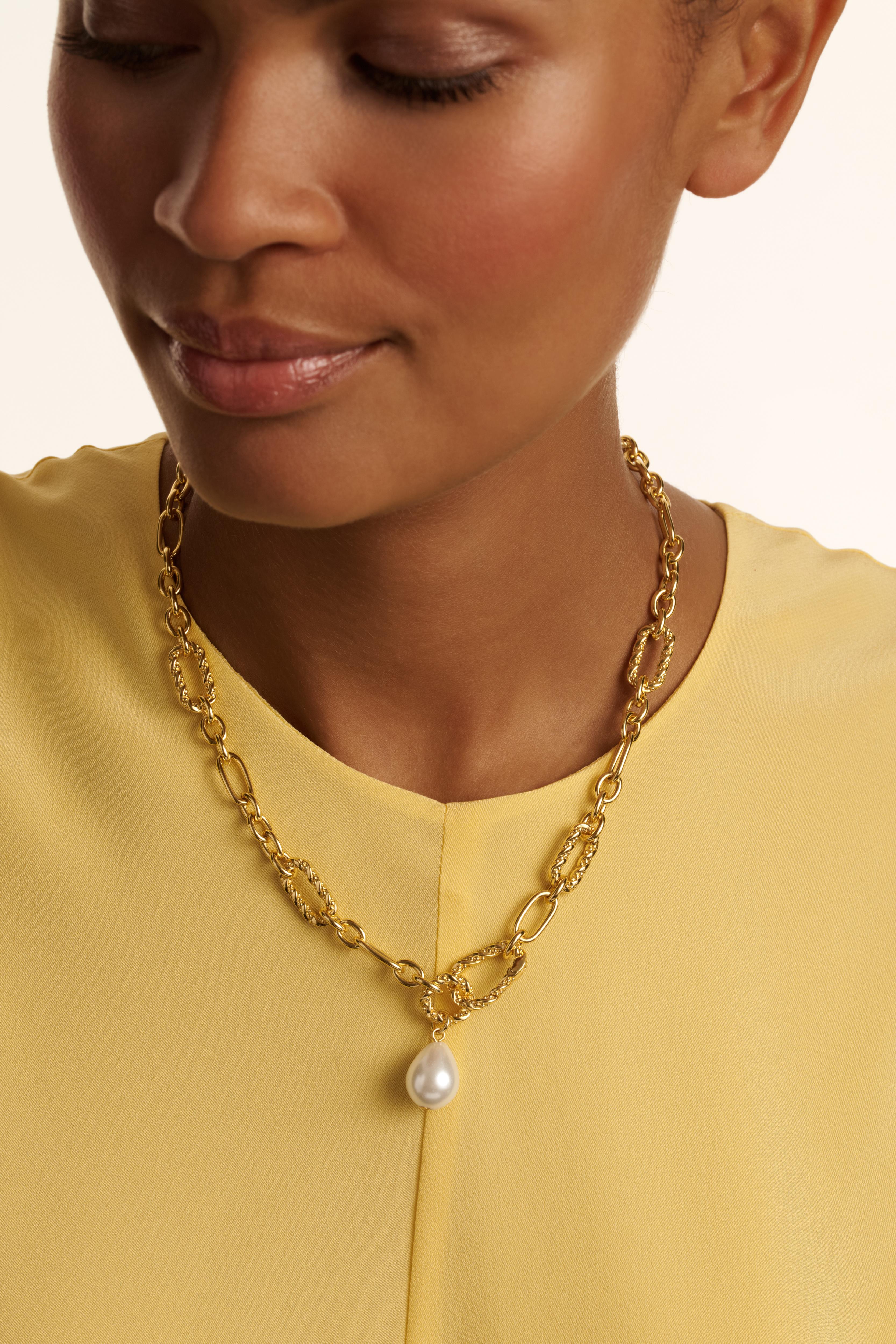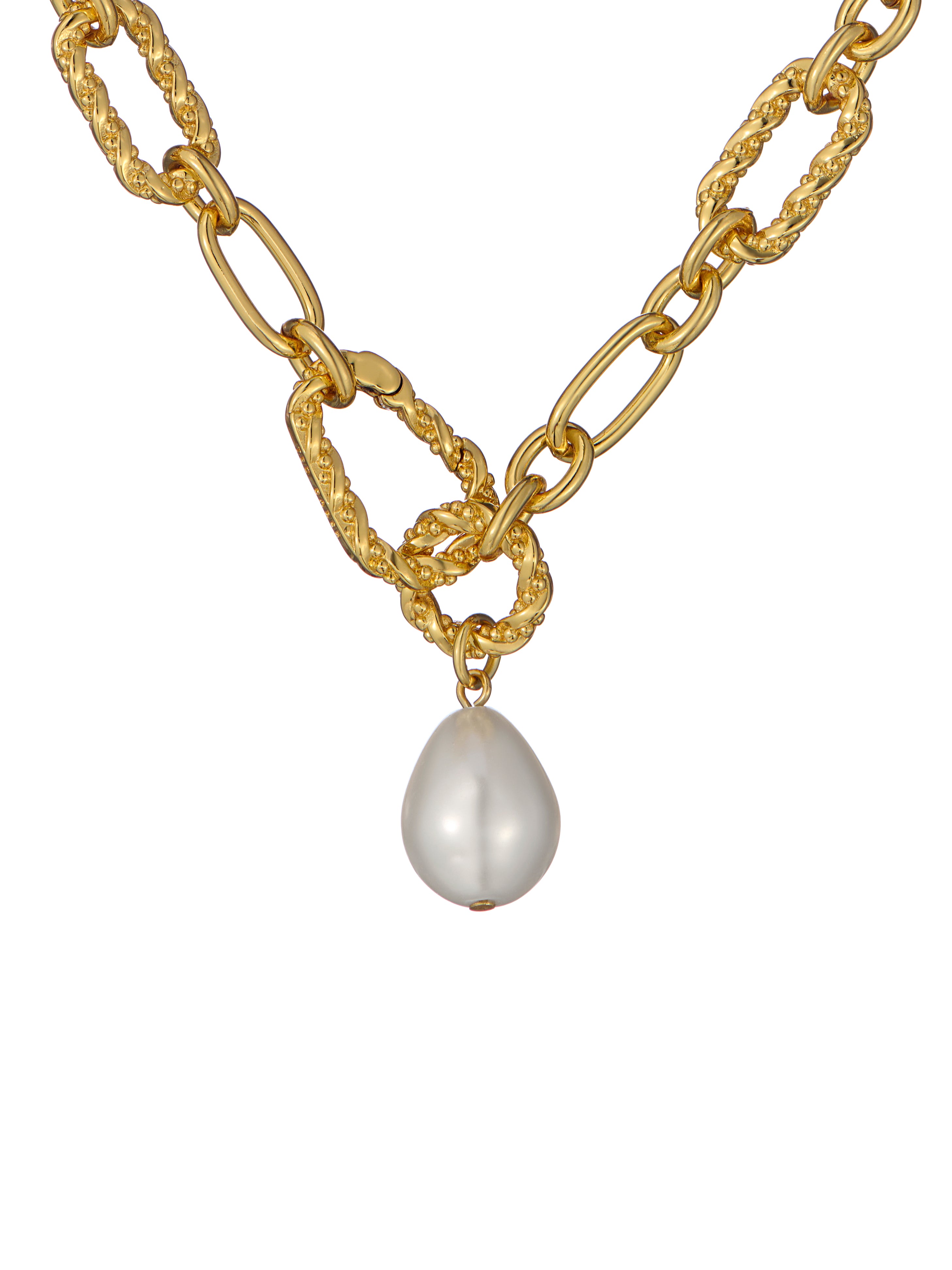 The TIMORA necklace makes quite the statement, pairing the timeless elegance of a teardrop faux pearl pendant with a modern mixed link chain that boasts a twisted texture. This gold tone piece fastens at the front with a distinctive carabiner clasp.