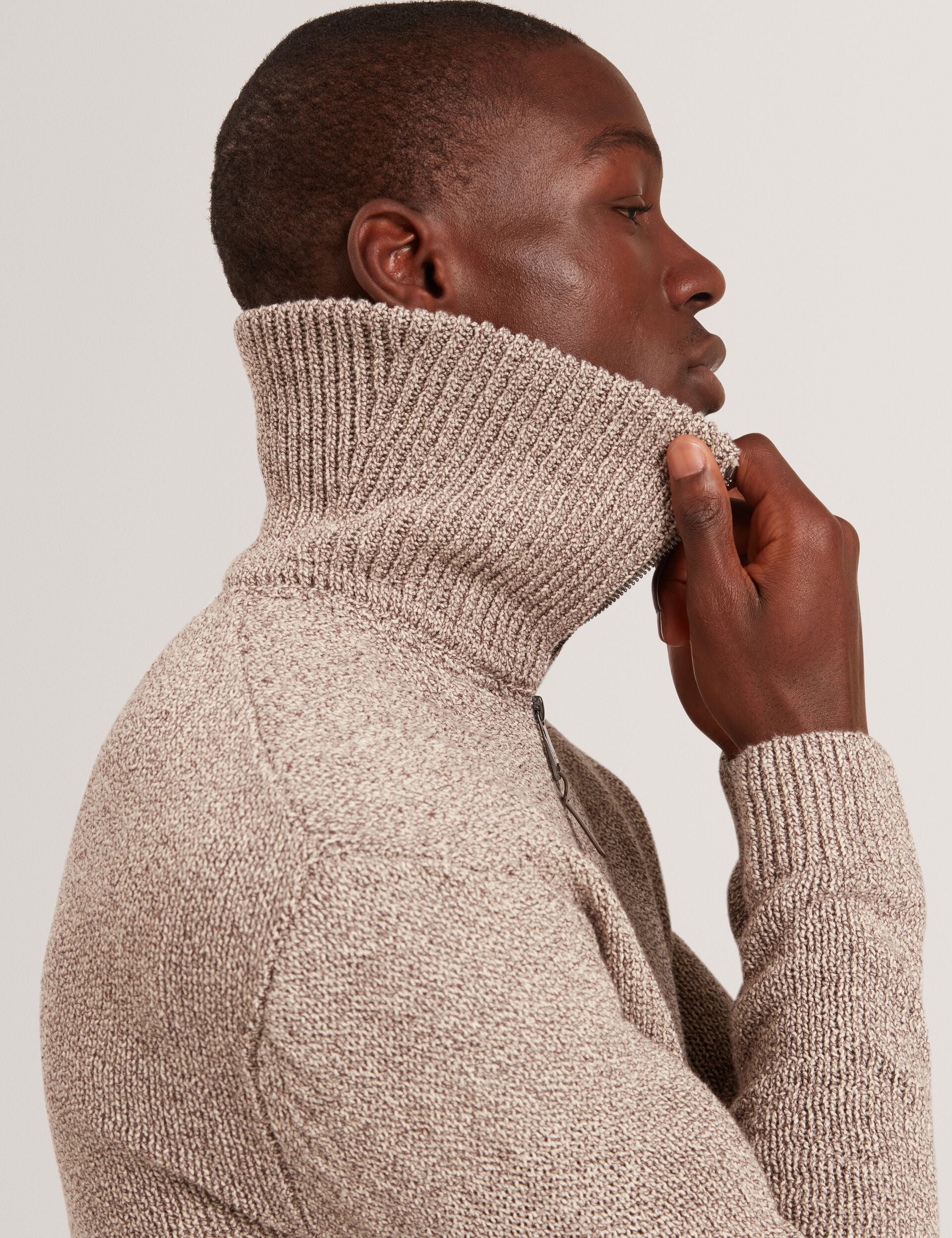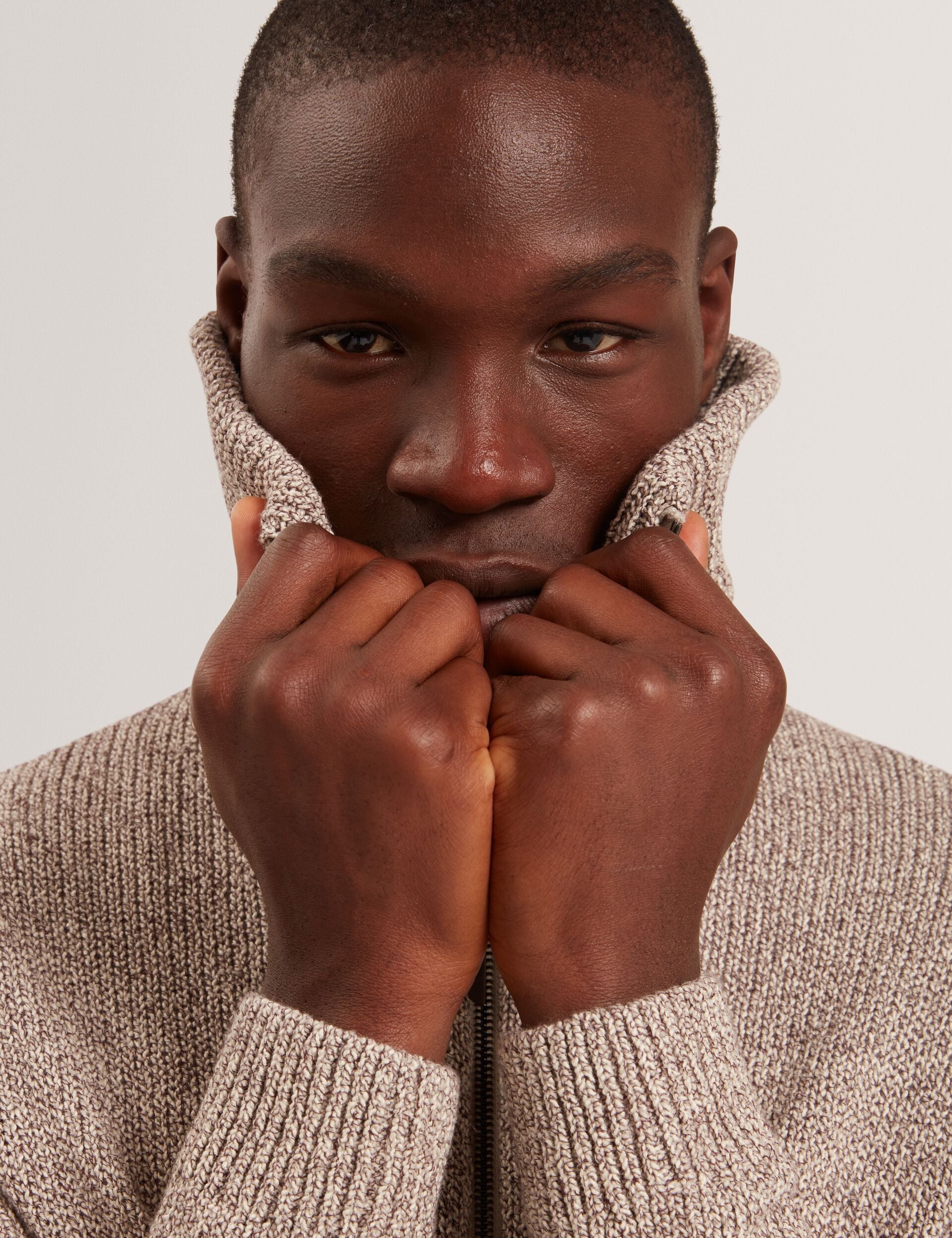 VARINK is a chunky knit for the new era. Mixed tone yarn is twisted together to give this jumper its subtle colour, which is designed with a funnel neck collar and zip-through fastening that feels effortlessly laid back. This heavyweight knit will be your go-to for every cold snap.