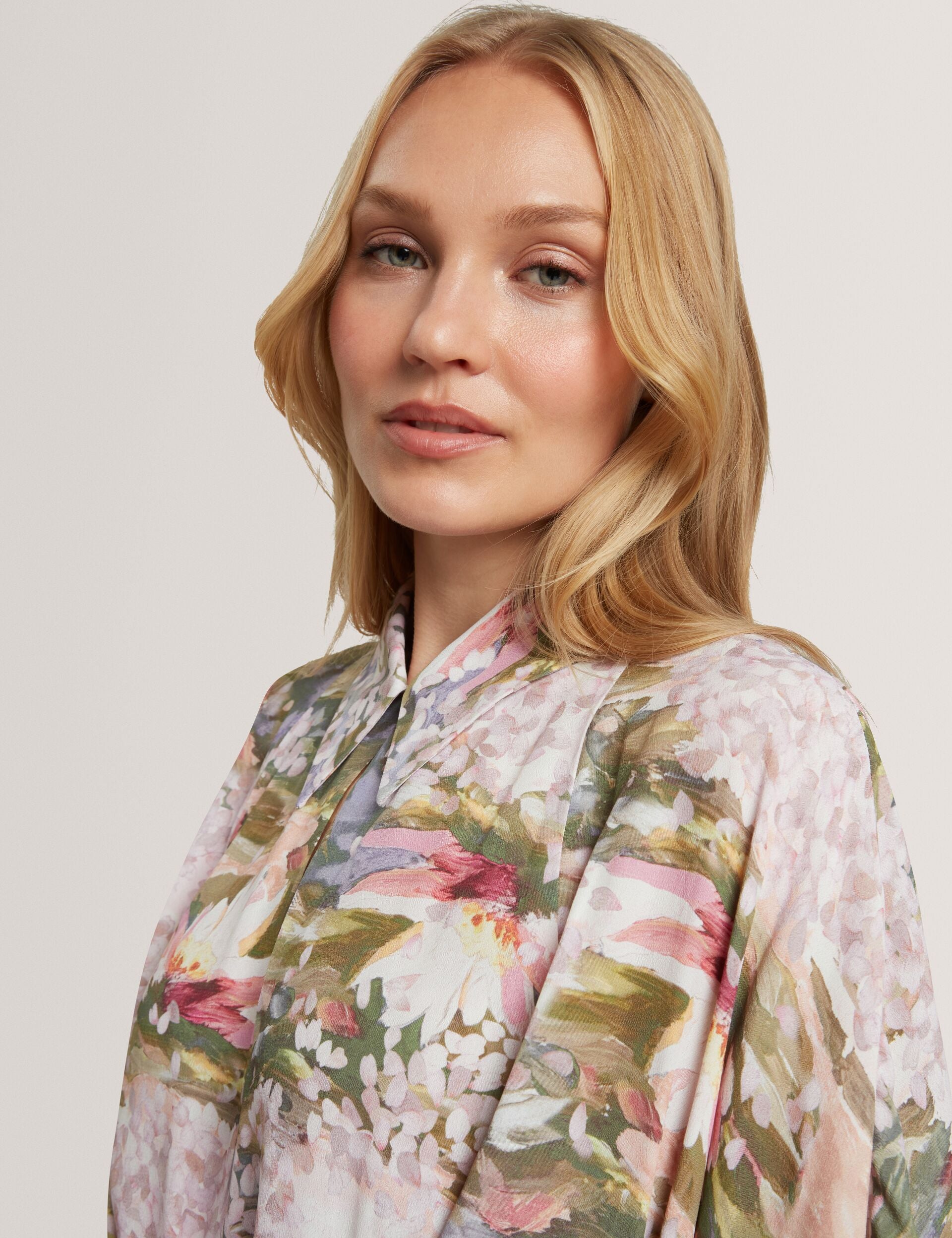 - Short kimono-style sleeves