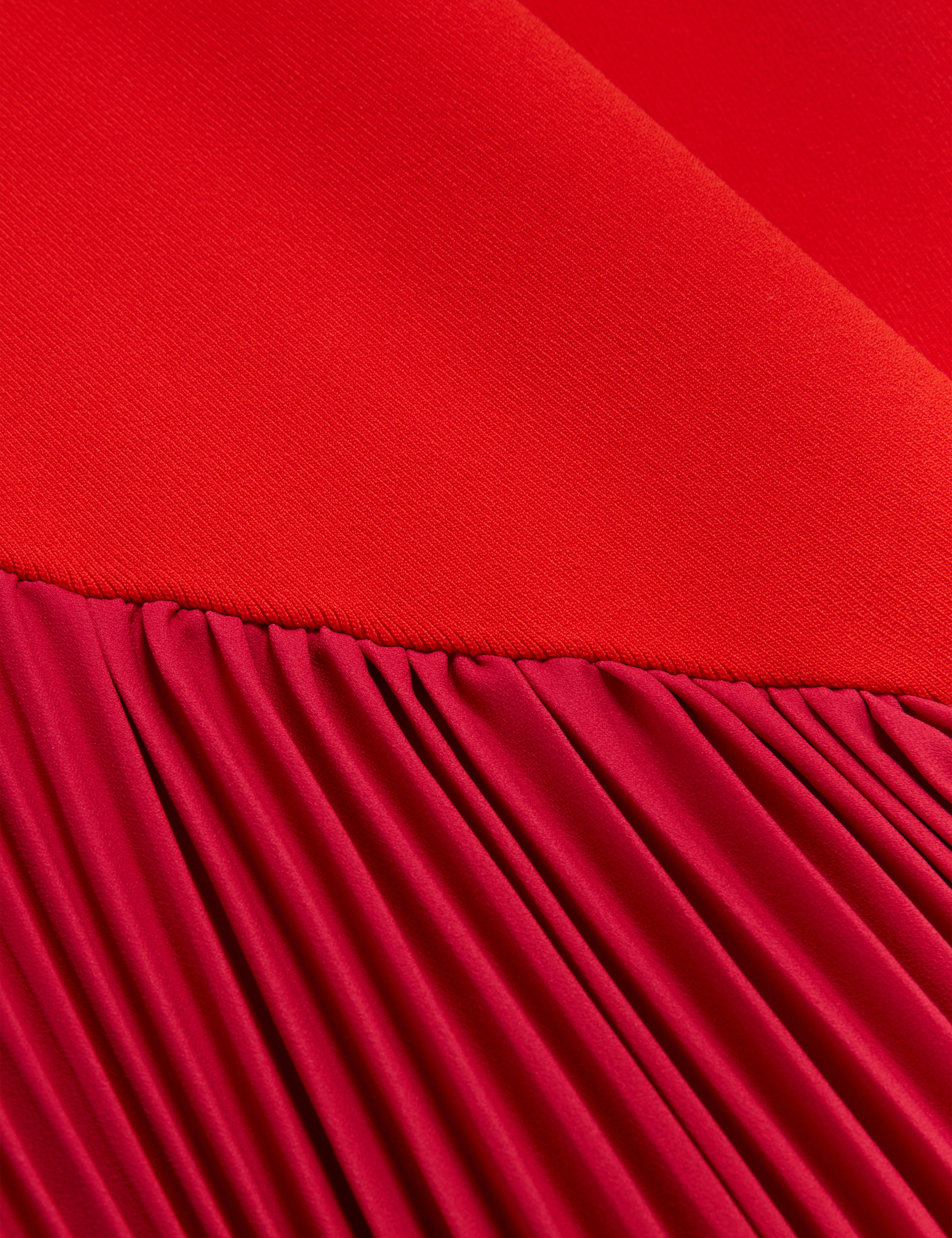 The ZEERA midi dress is effortless elegance with a touch of our trademark flair. The sleek column silhouette is crafted from a sculpting knitted fabric, combined with an asymmetric pleated panel at the side in a contrasting shade - it's just enough movement to make every step into a statement.