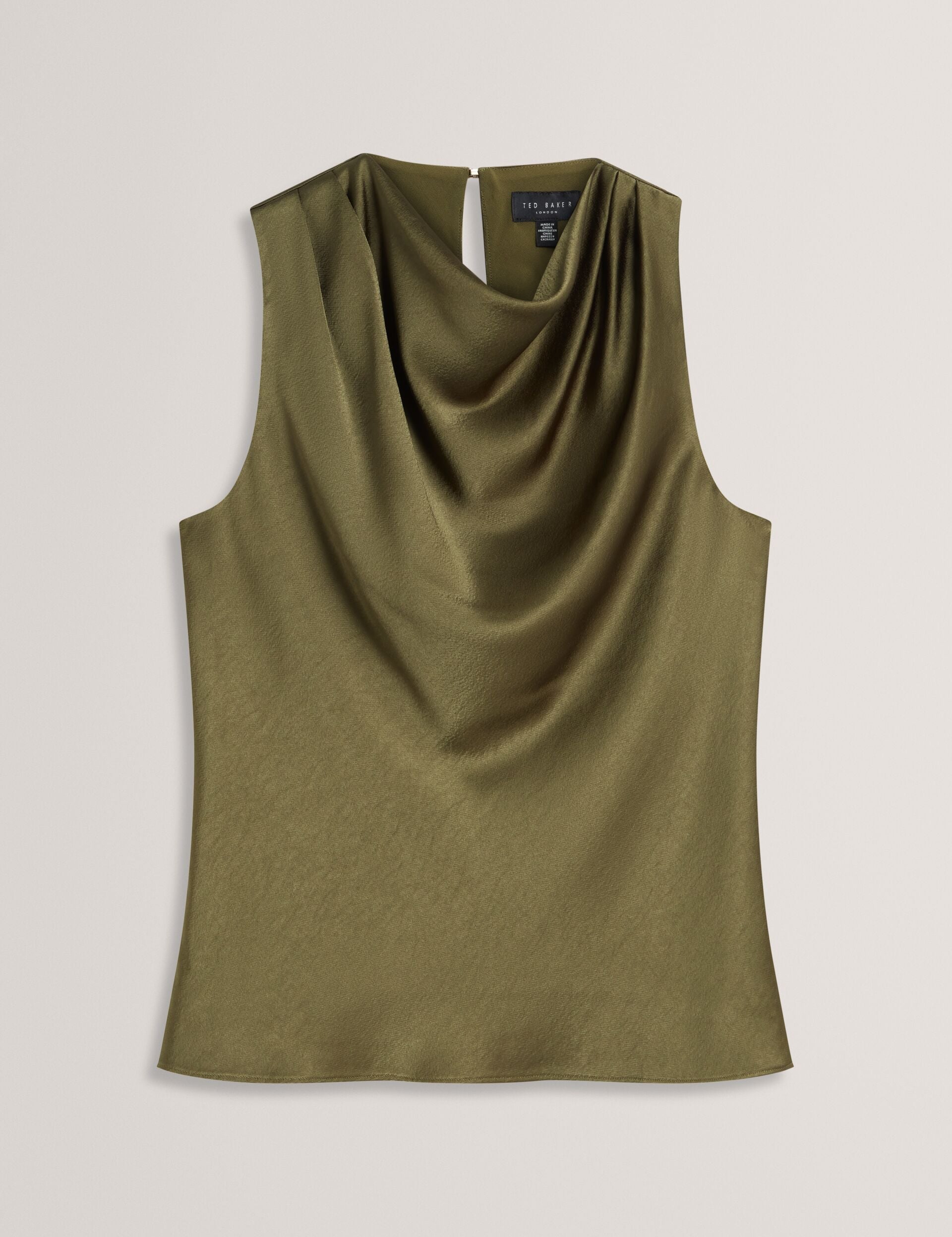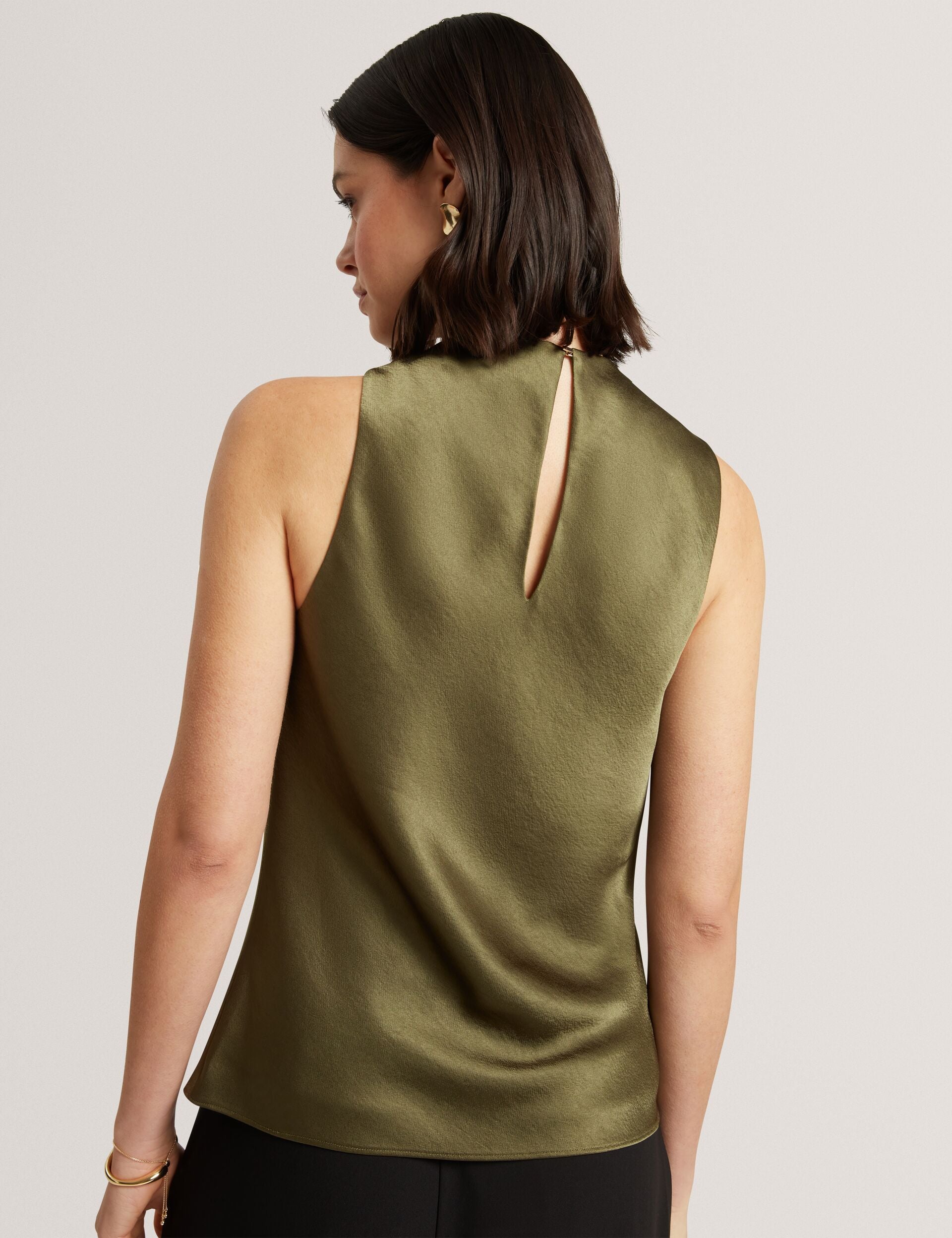 ZEPHA est idéale pour les soirées, avec son satin texturé et le subtil effet drapé de son col bénitier. Conçu dans une teinte kaki naturelle, ce top sans manches offre une allure raffinée sans effort.