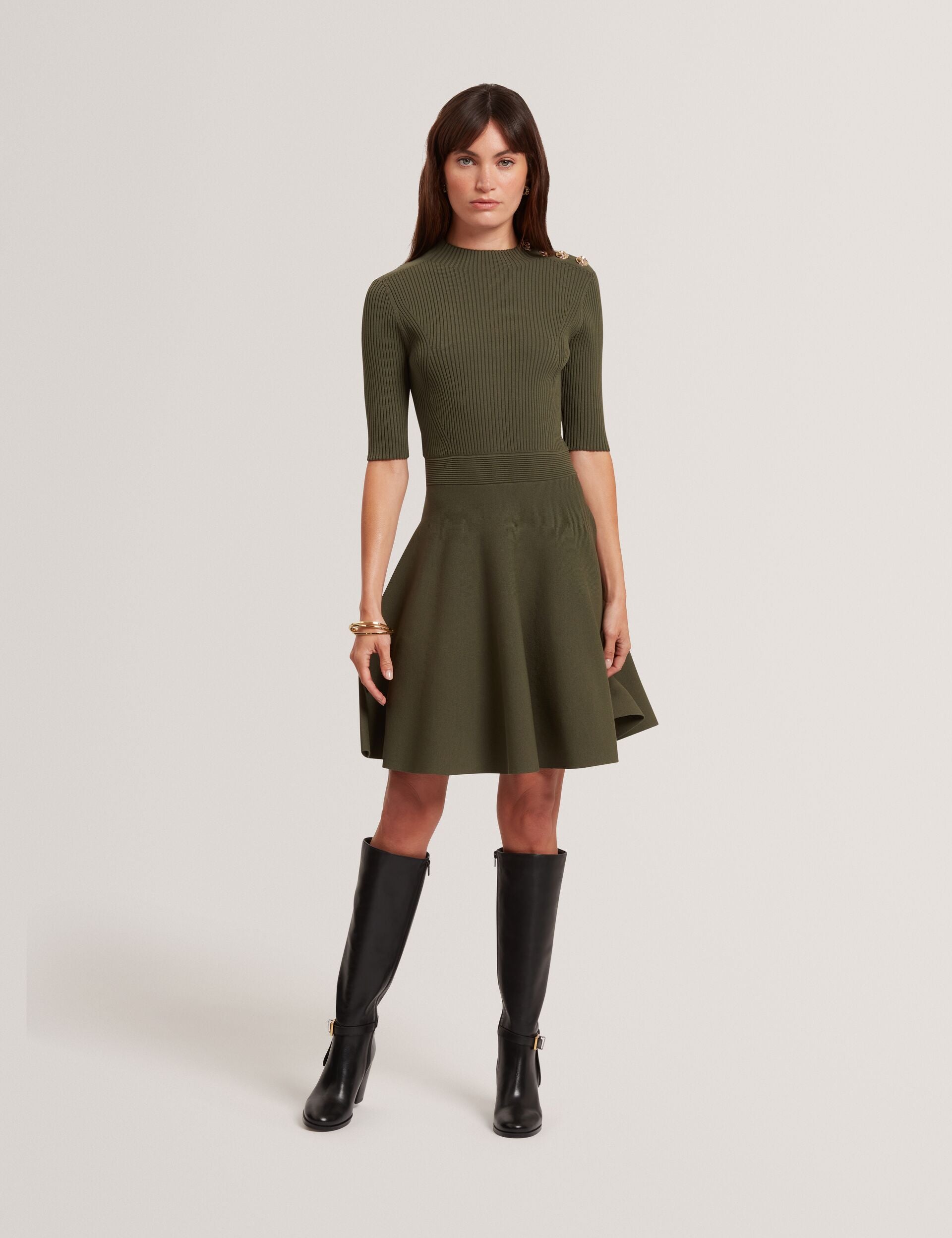 Work, drinks, dinner - do it all in the LILANO skater dress. It's shaped to flatter with a fitted bodice and flowy skater skirt, crafted from a comfy ribbed knit fabric. Shaped hardware rose buttons at the shoulder take it from staple to stand-out.