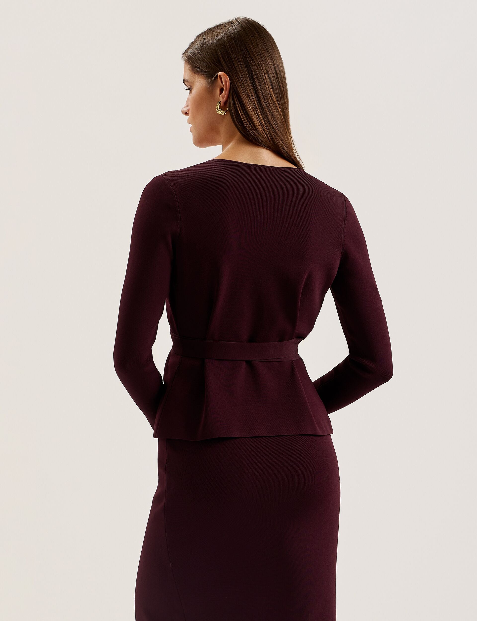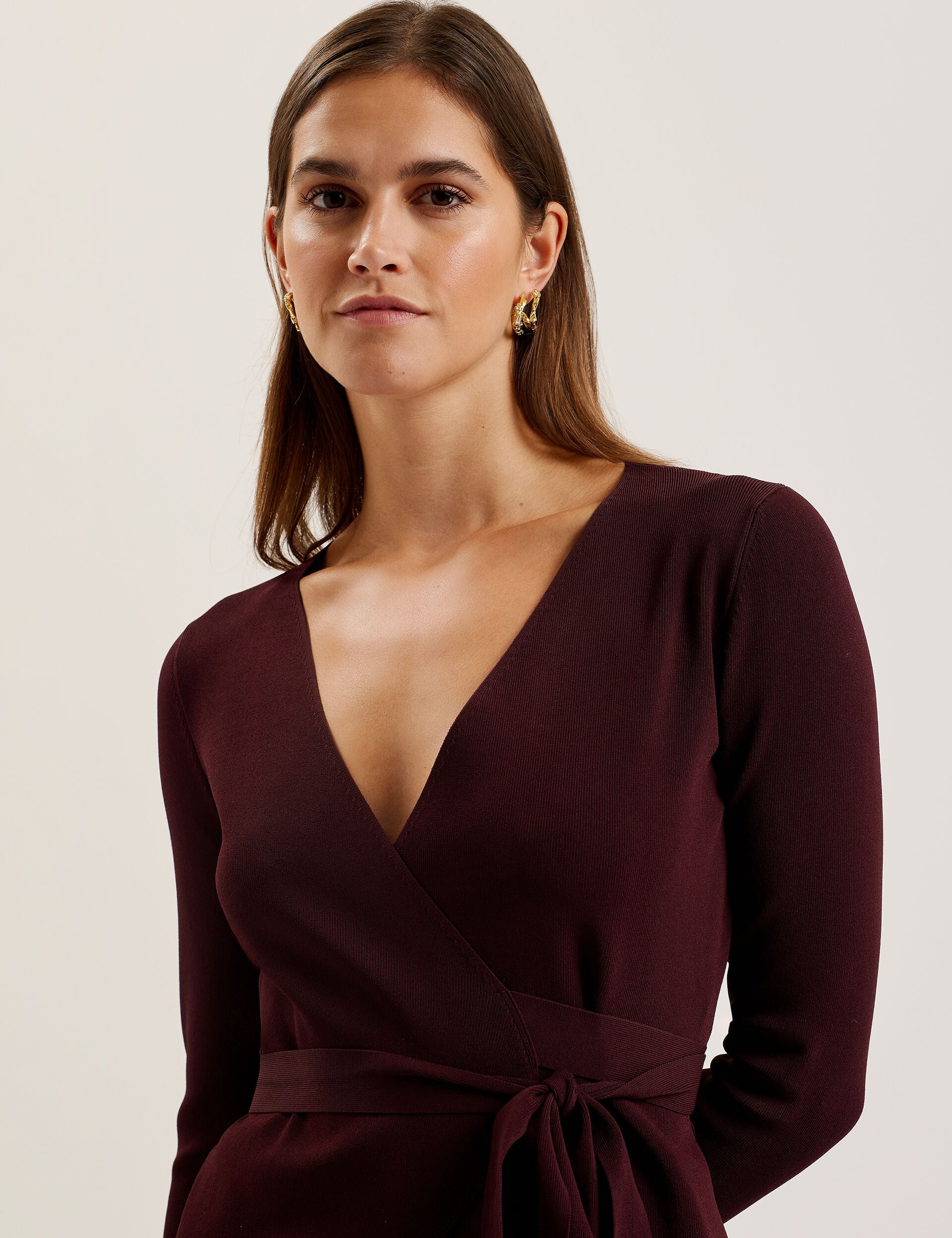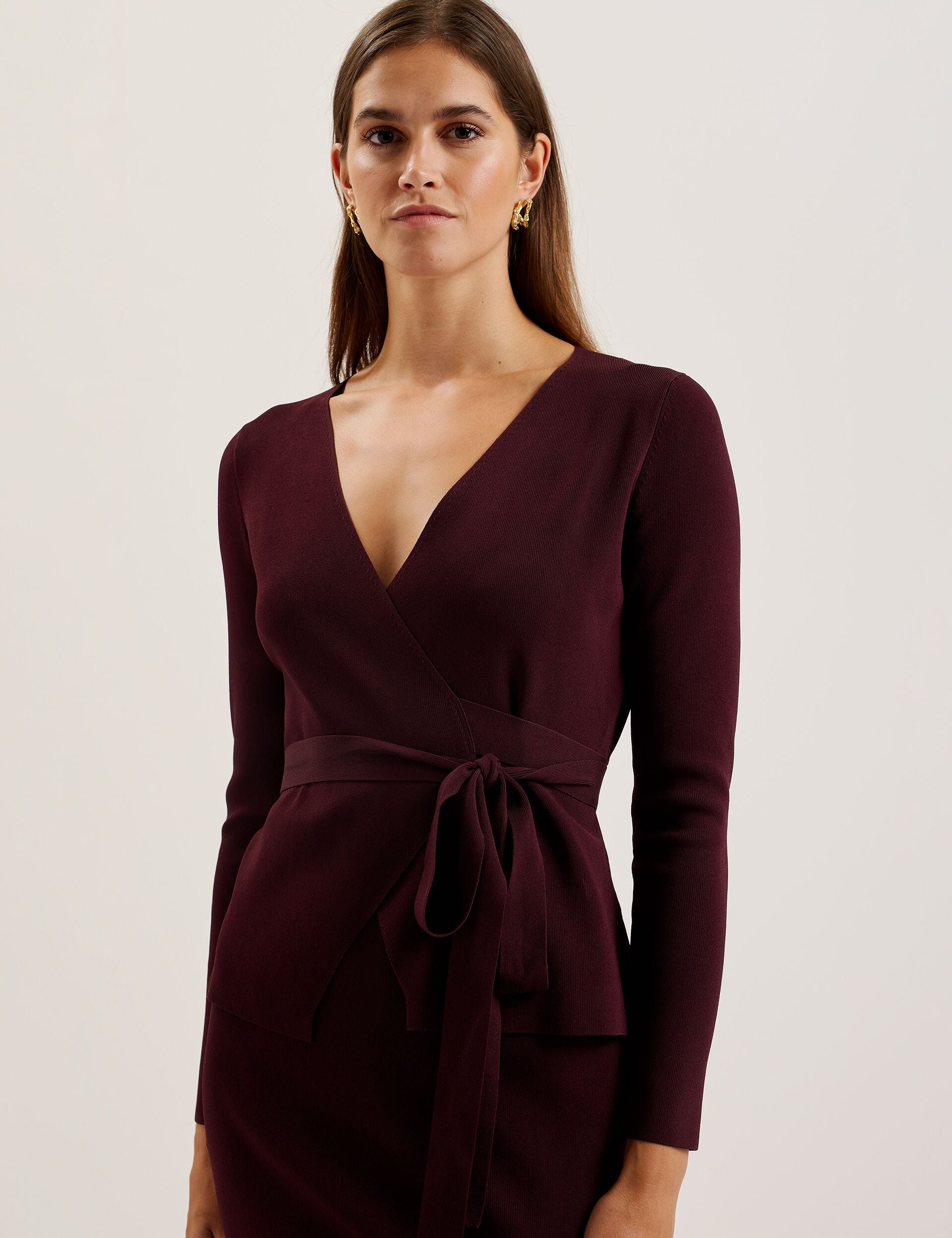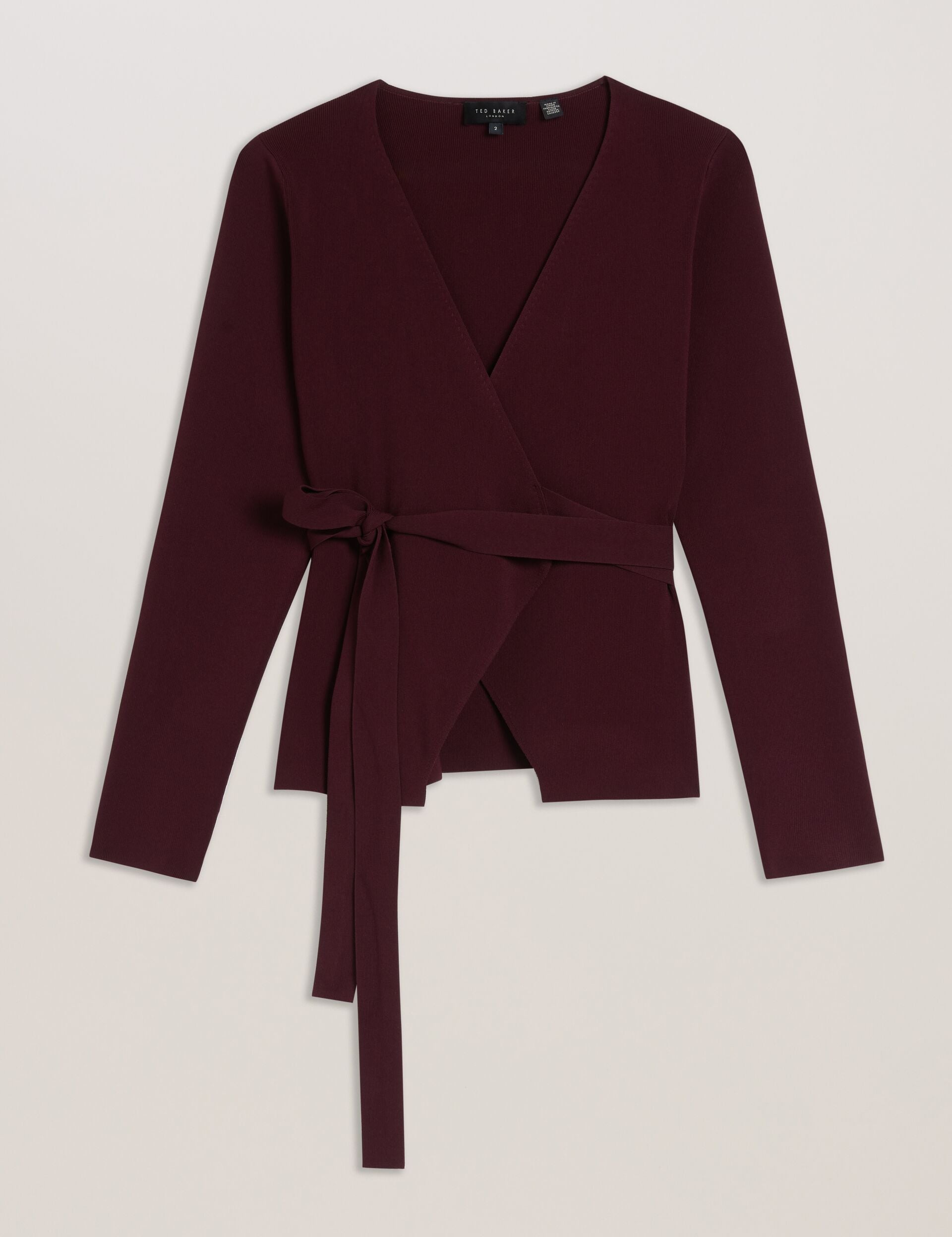NAYOMEE cuts the sleekest of silhouettes with its wrap design and low V neckline. This long sleeve top is crafted from a fine knit fabric that's warm but still flattering, and fastens at the waist with a self-tie belt to fit this piece just to your liking.