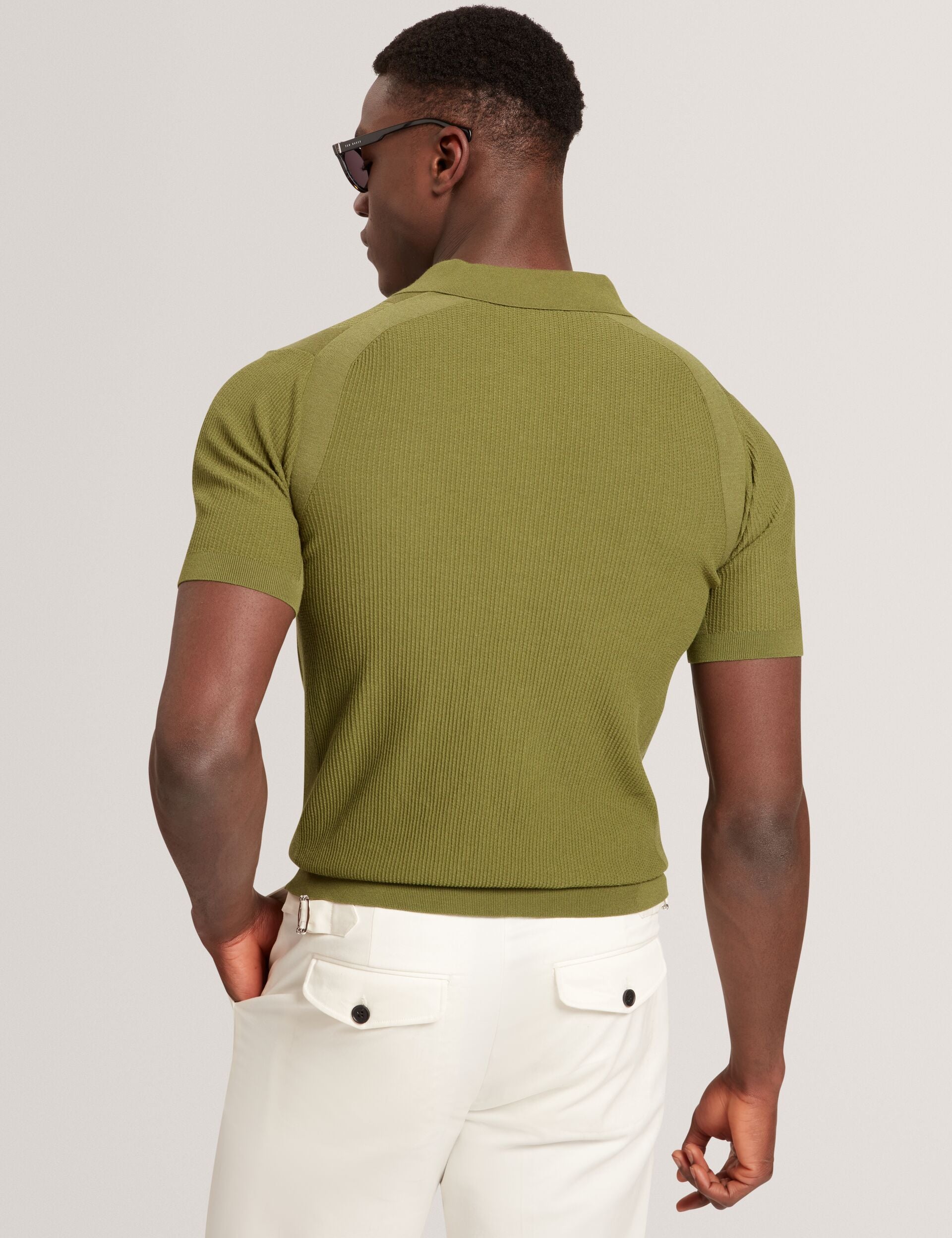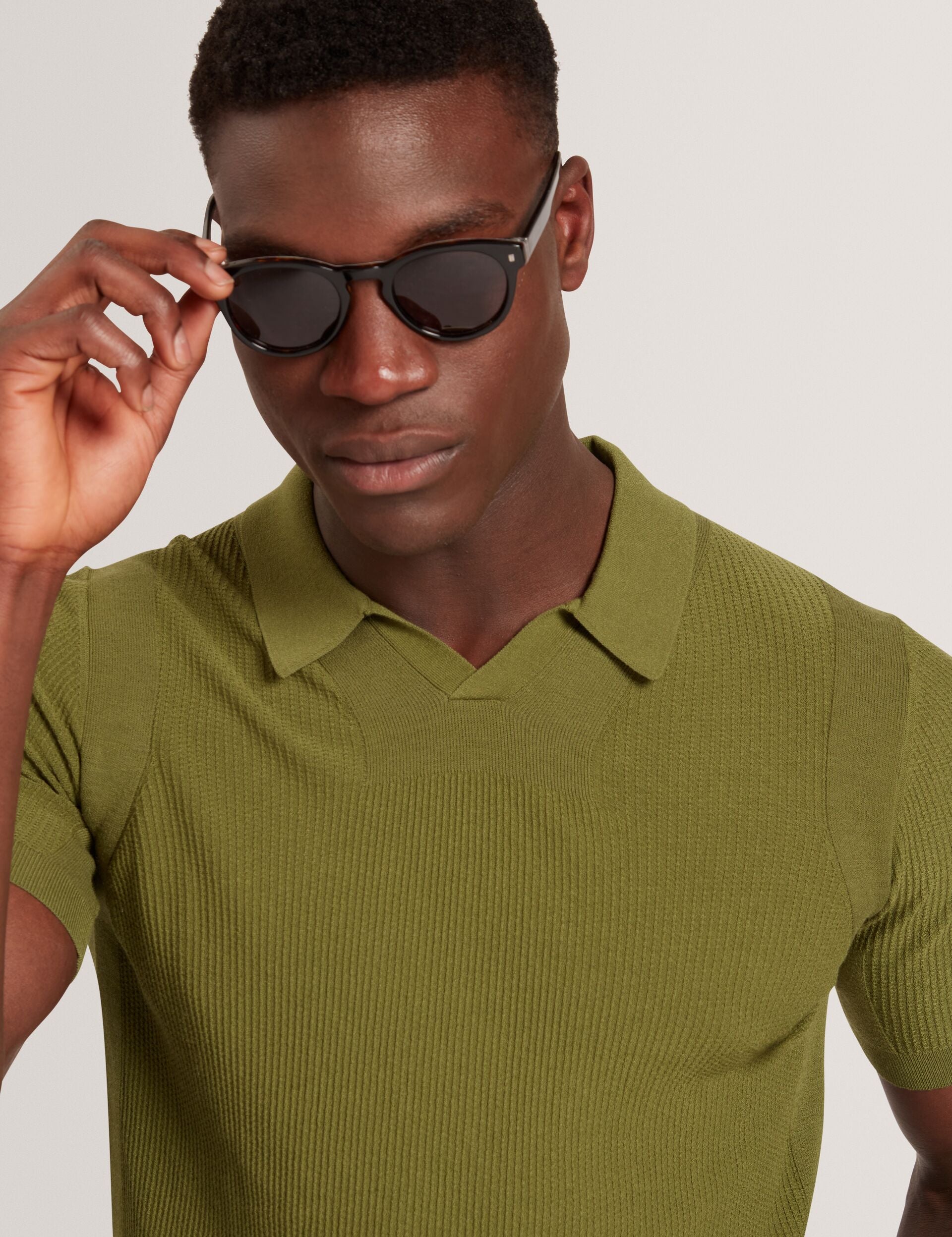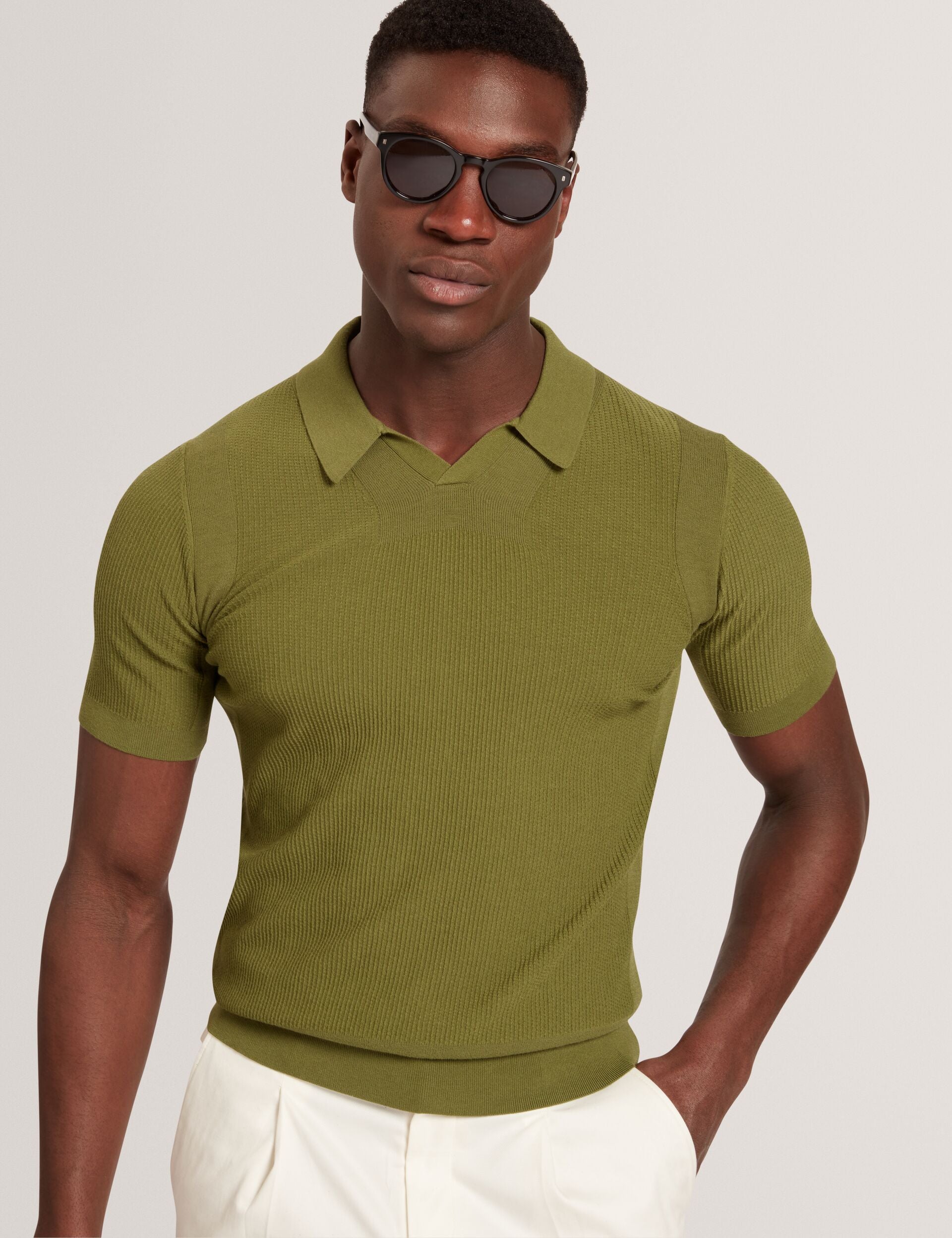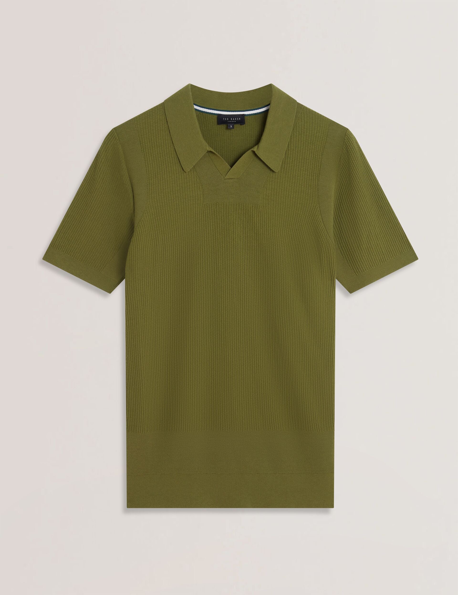 Textured Rib Knit Open Neck Polo Shirt