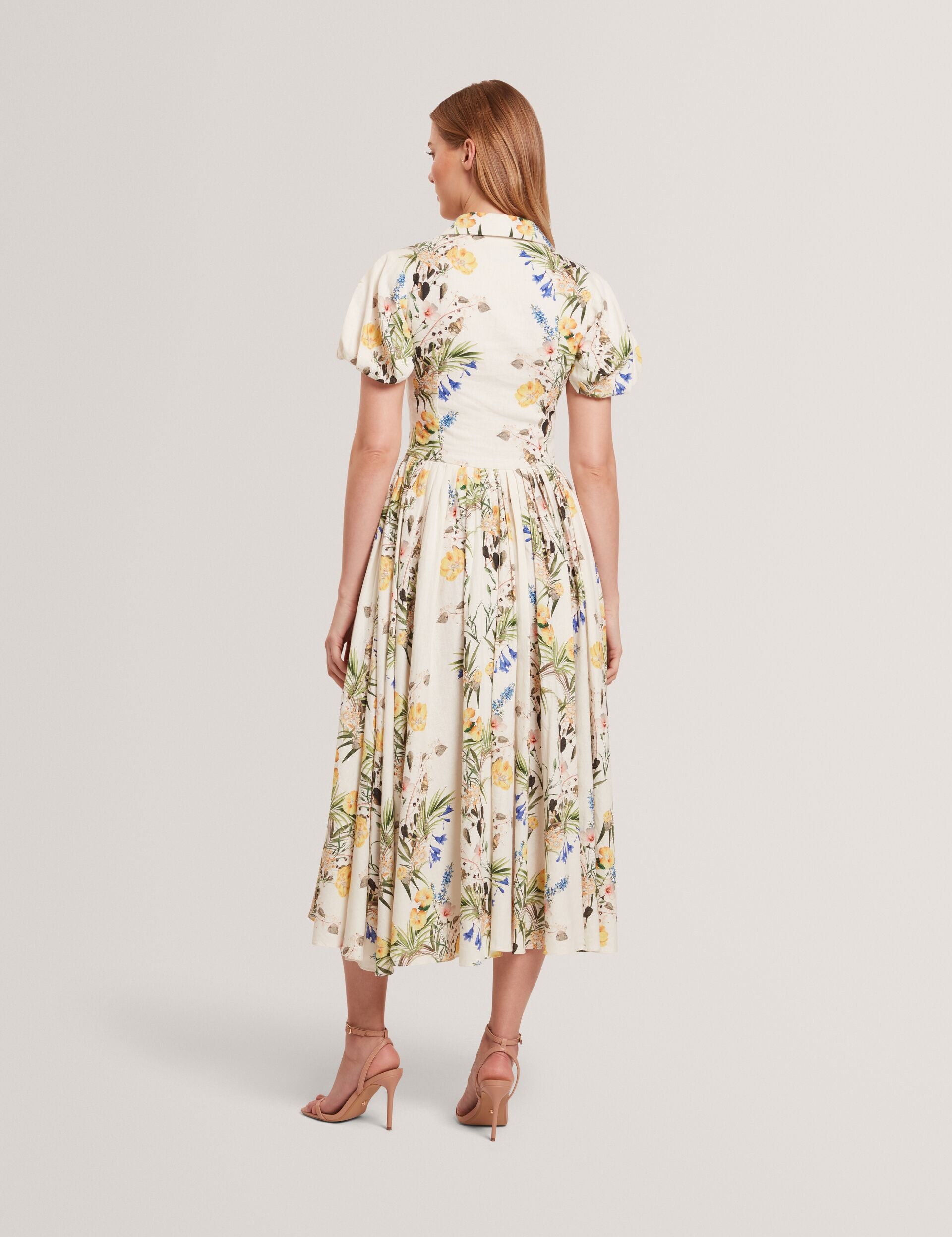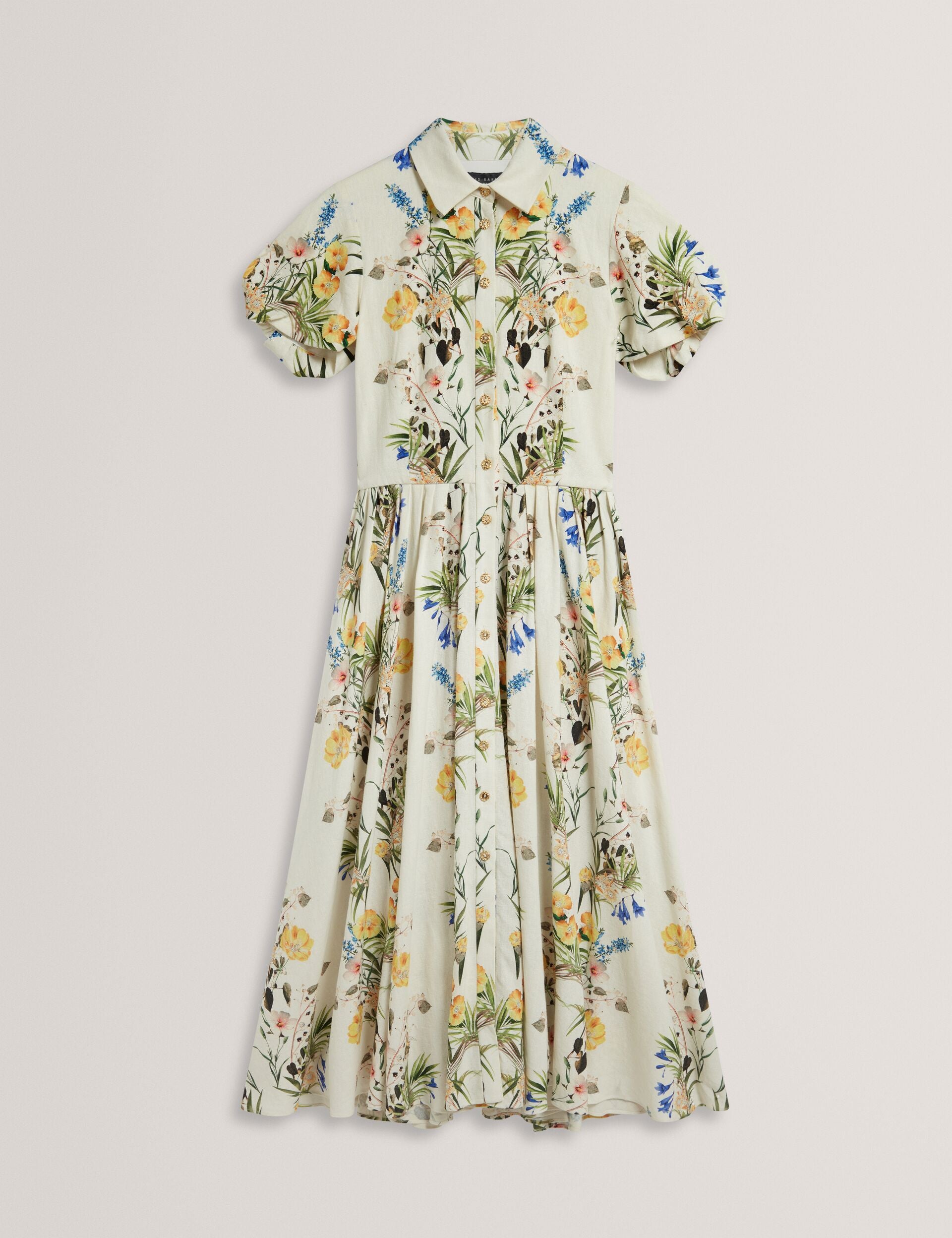 The Ted Baker Balloon Sleeve Button-Up Shirt Dress features a vibrant floral pattern and gold buttons that is a perfect blend of timeless elegance and contemporary flair. The flattering balloon sleeves and delicate floral design create a soft, feminine silhouette, while the gold buttons add a touch of luxury.