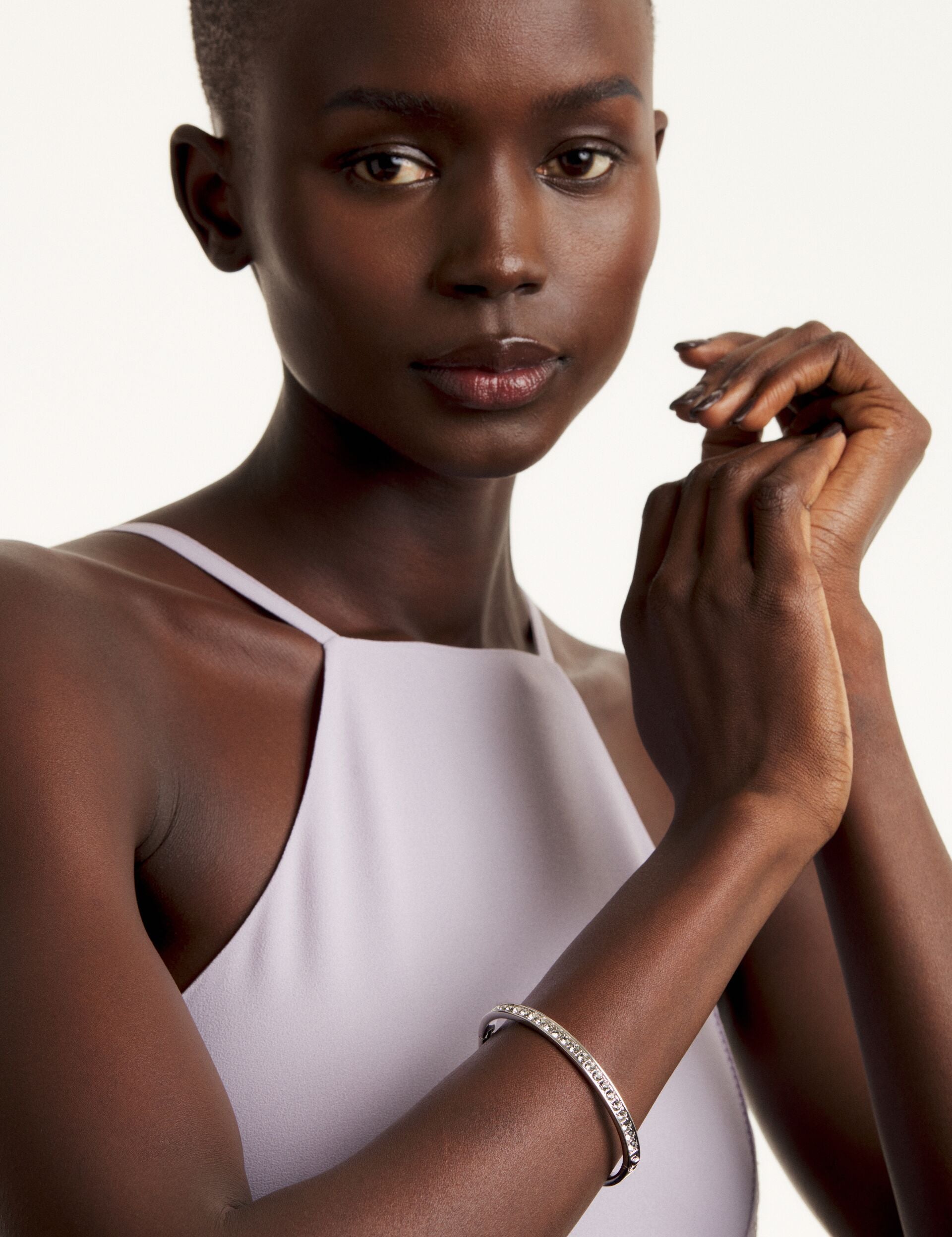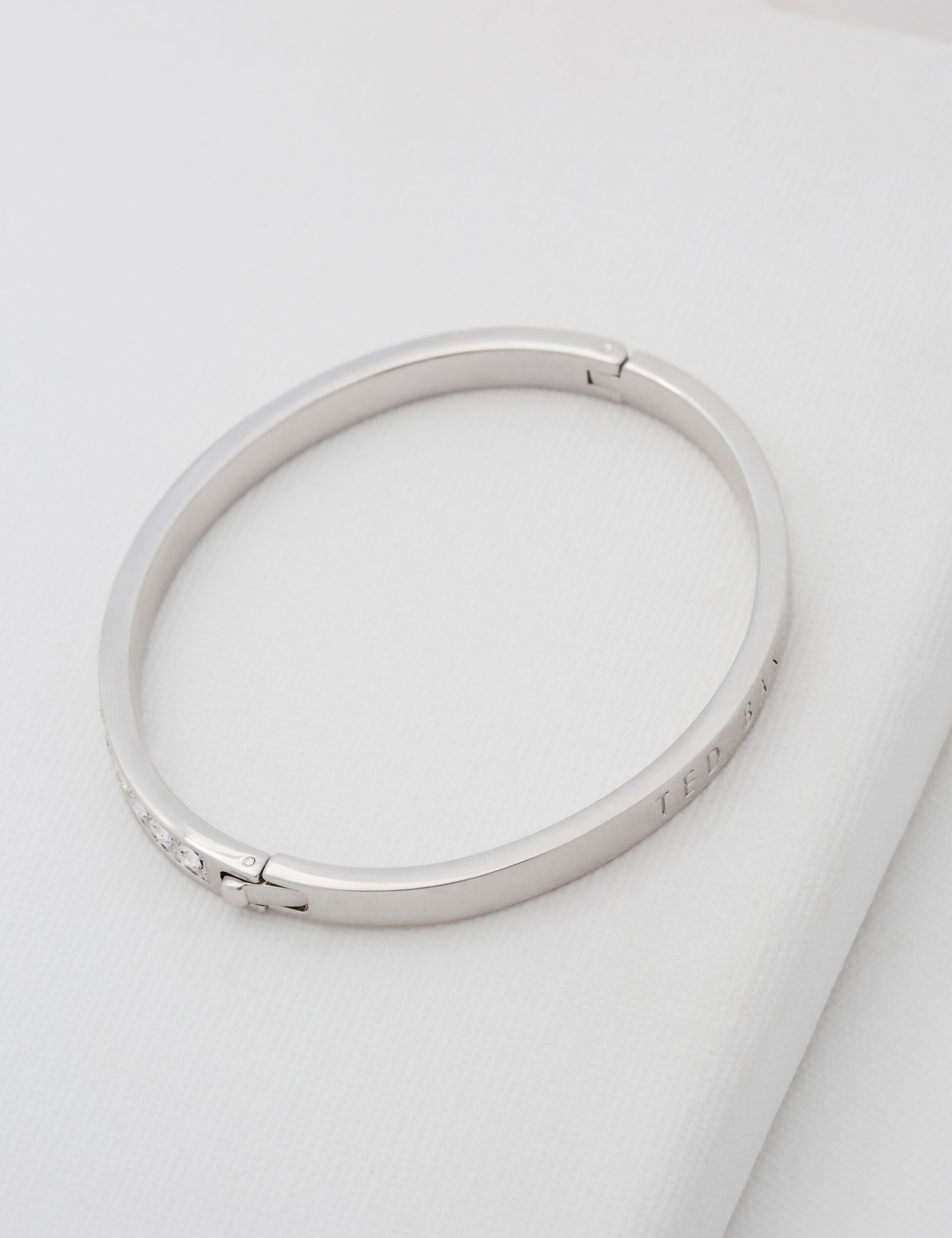 Featuring a row of crystals on one side and an engraved logo detail on the other, CLEMARA brings two elegant looks in one bracelet. This dainty bangle is a great piece for stacking or showcasing on its own, finished with an easy-to-use hinge closure.
