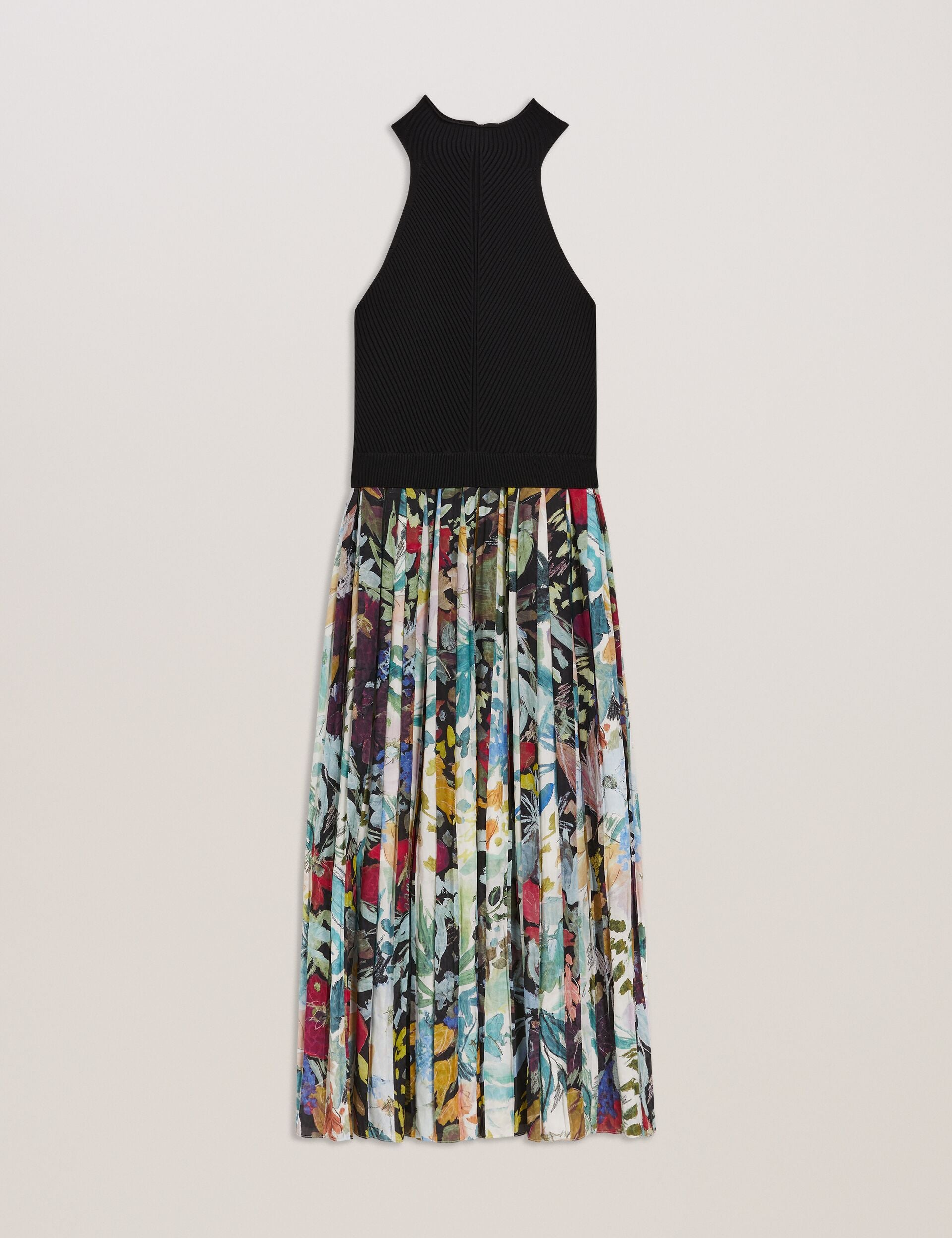 The CORINO dress pairs together a modern knitted bodice with the classic look of a box pleat skirt for a piece that exudes style. The sleeveless design is complemented by a high neckline, fastening at the back with an edgy exposed zip. On the skirt, floral prints in contrasting colours are spliced together for a look that's both bold and elegant.