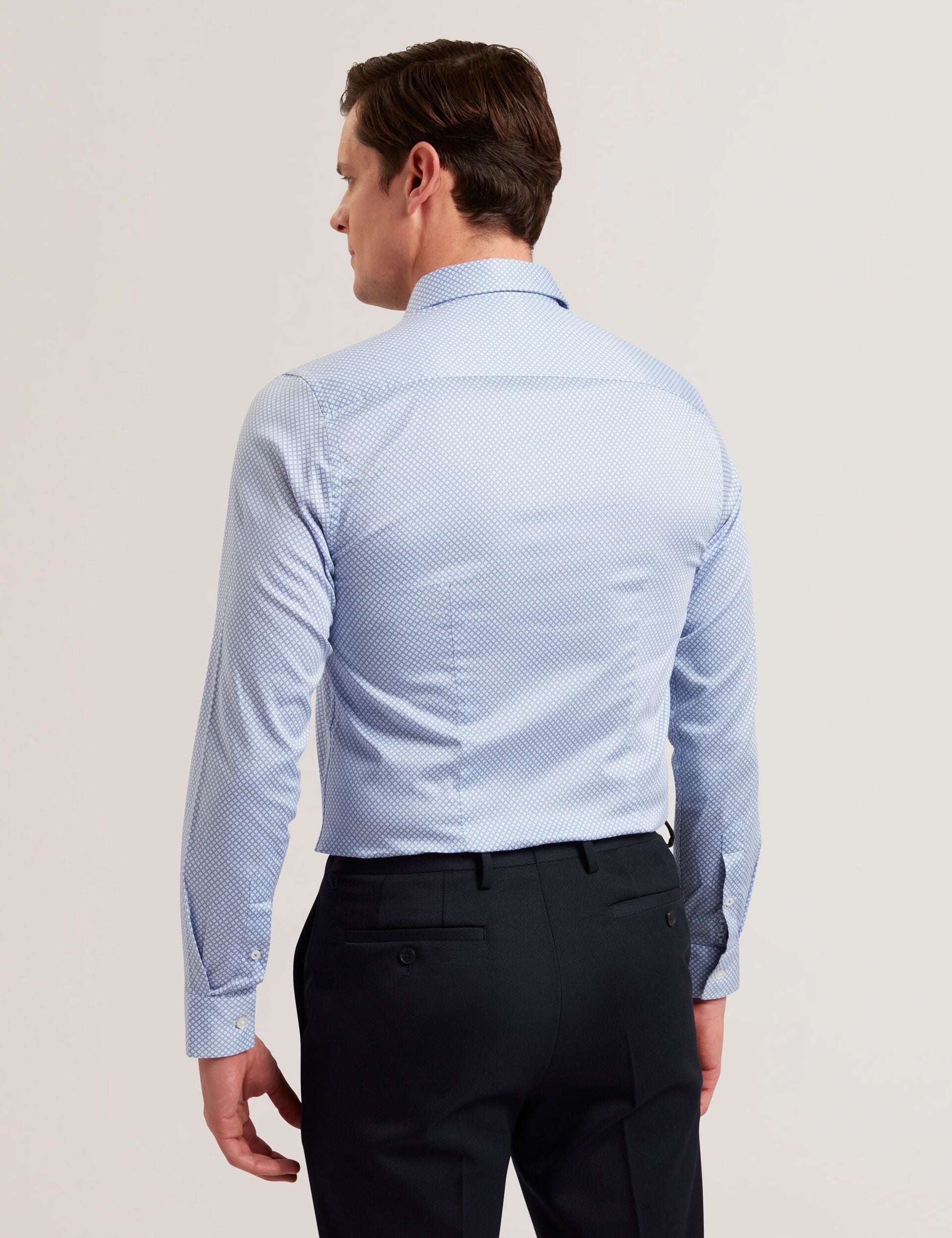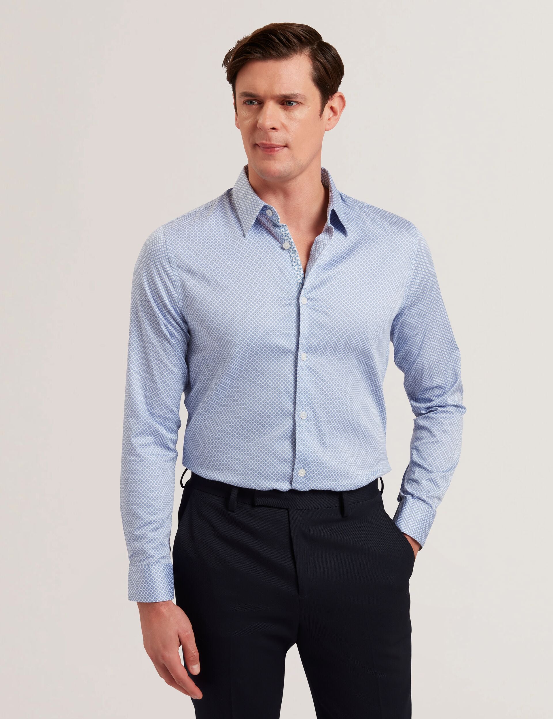 Elevate your formal repertoire with this sophisticated slim fit shirt, featuring a distinctive mini circles print that adds subtle texture and contemporary charm. The tailored silhouette delivers a sharp, modern aesthetic that transitions effortlessly from boardroom to evening occasions. Pair this polished piece with tailored trousers for an impeccably refined look.
