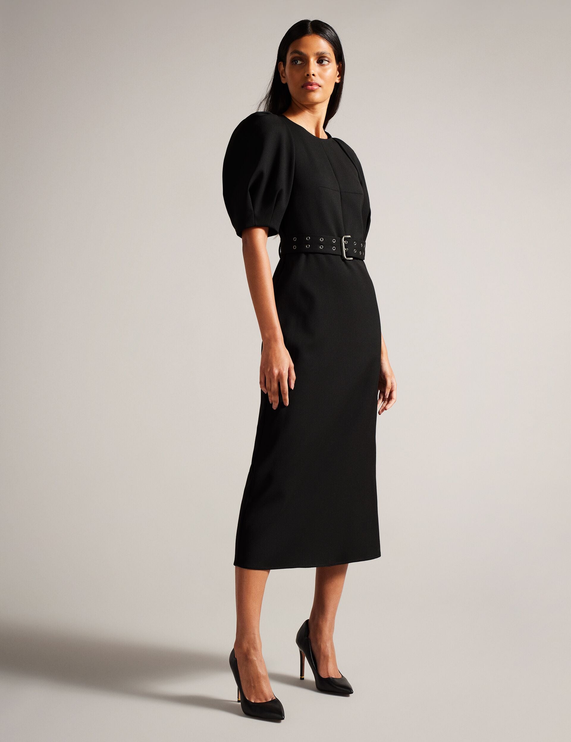 Structured Puff Sleeve Midi Dress With Belt