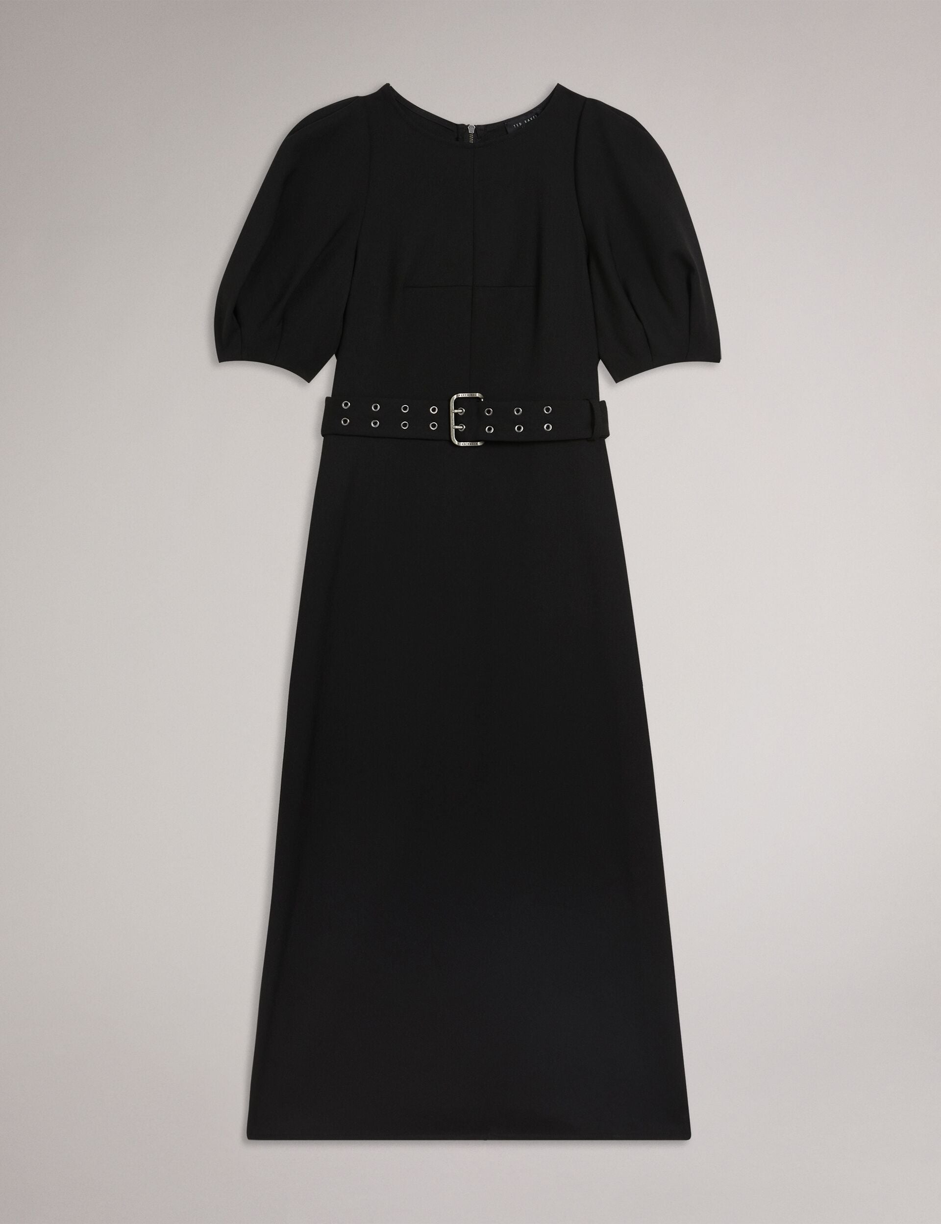 The GABYELA midi dress is elegance meets edge. Its puffed short sleeves are structured to bring drama to its sleek silhouette, complete with a double eyelet belt at the waist to set it apart from the rest.