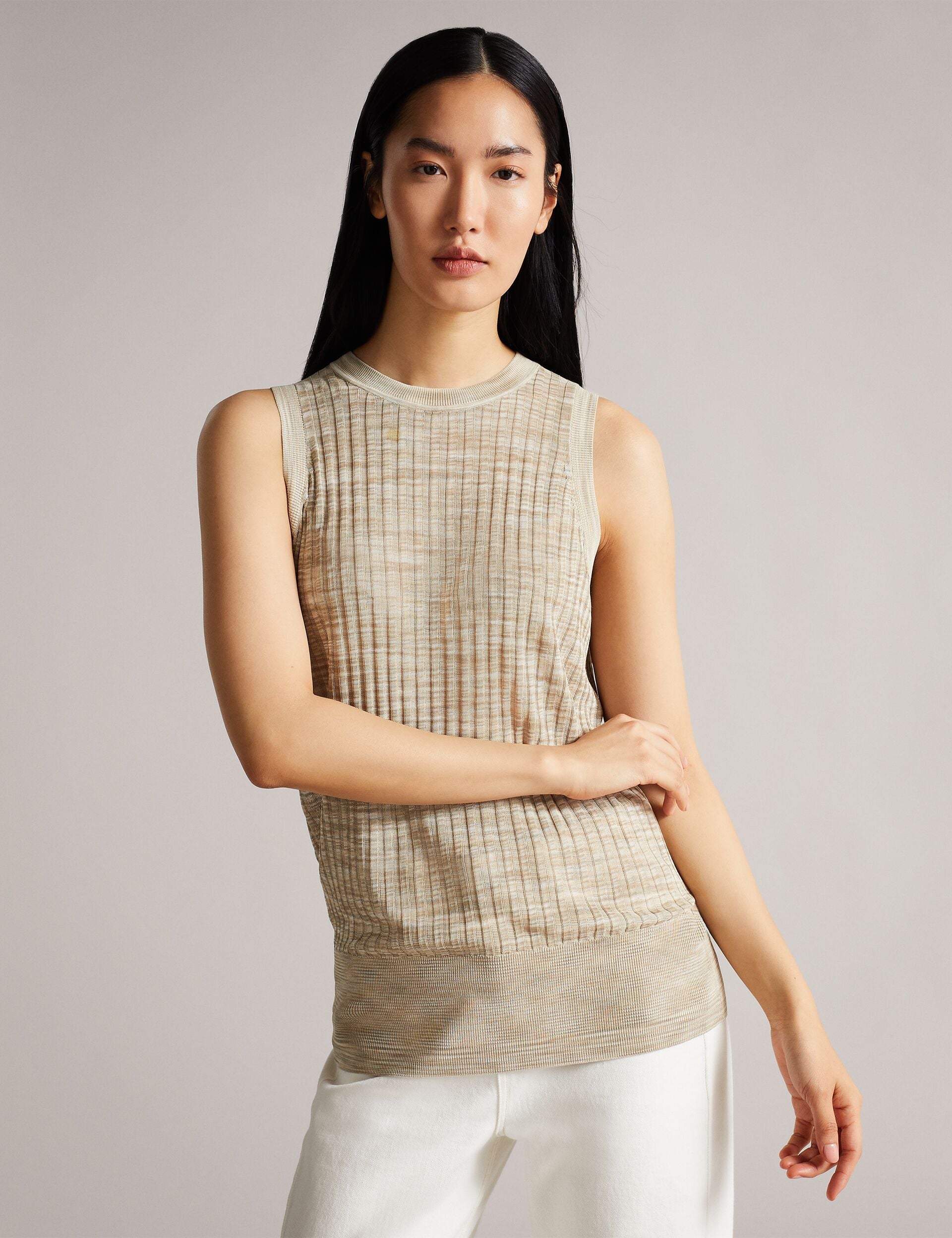 Effortlessly chic and irresistibly soft, this sleeveless piece elevates your warm-weather wardrobe with sophisticated texture and contemporary elegance. Crafted from luxurious rayon ribbing, it delivers exceptional comfort while maintaining a polished silhouette that transitions seamlessly from day to evening. Pair it with tailored trousers or your favourite denim for an instantly elevated look.
