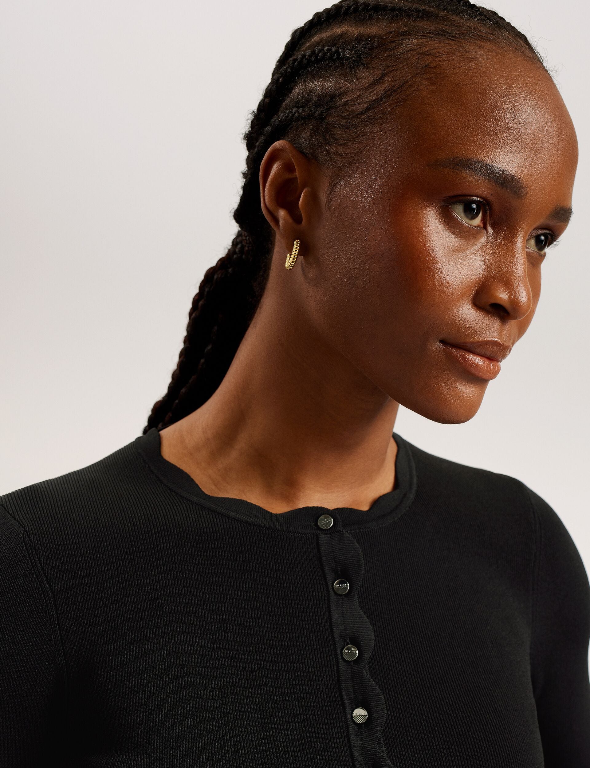KKLARA is the trusty little cardi your wardrobe needs. The cropped length, ribbed knit material, and slim fit make it perfect for layering over dresses and tees – or wearing on its own. Plus, its scallop trim and branded buttons add an element of sophistication.