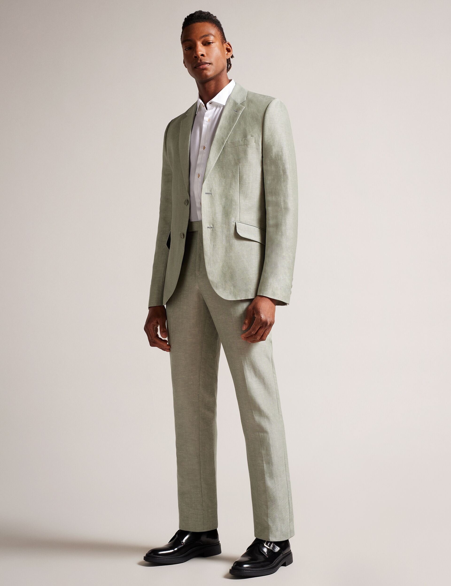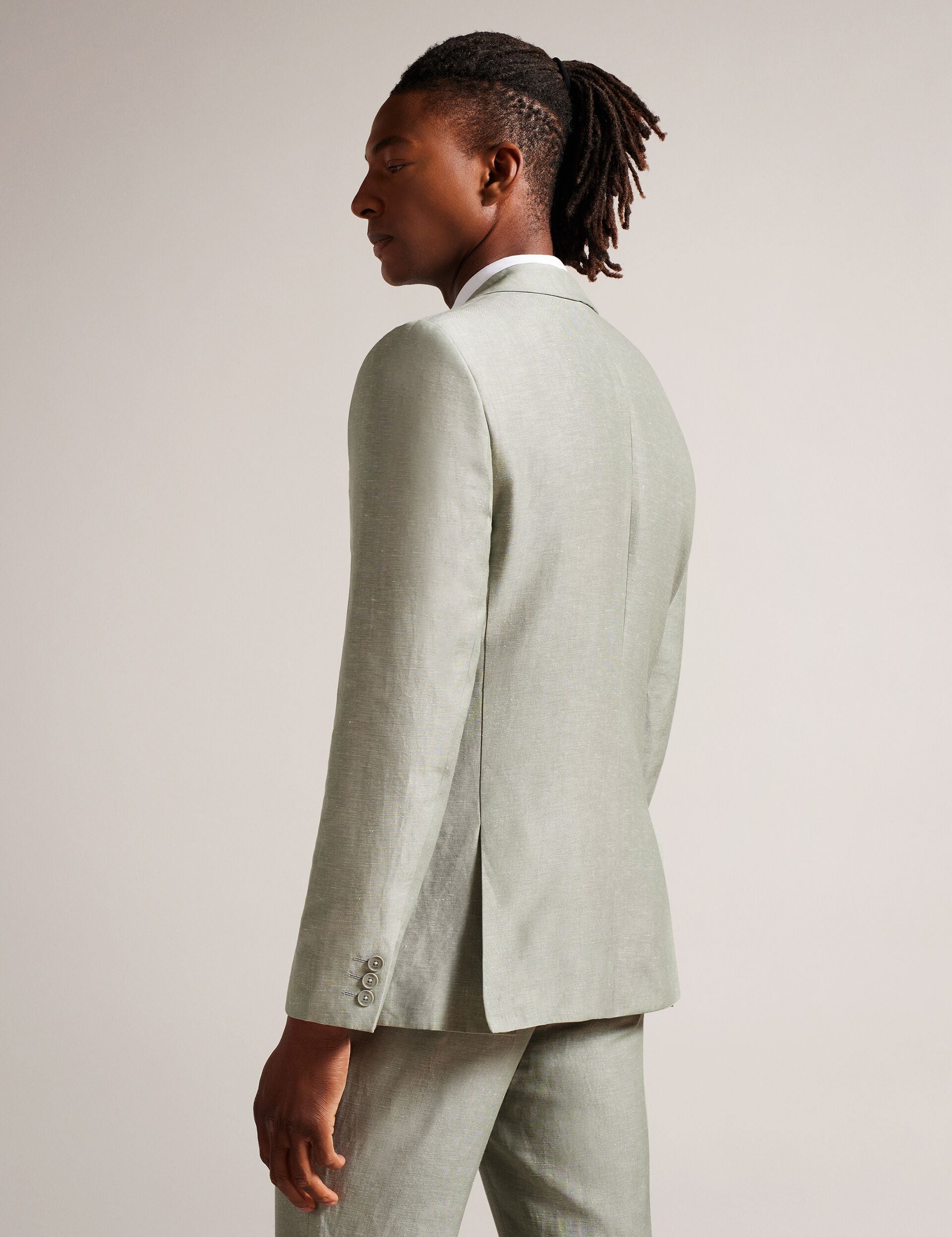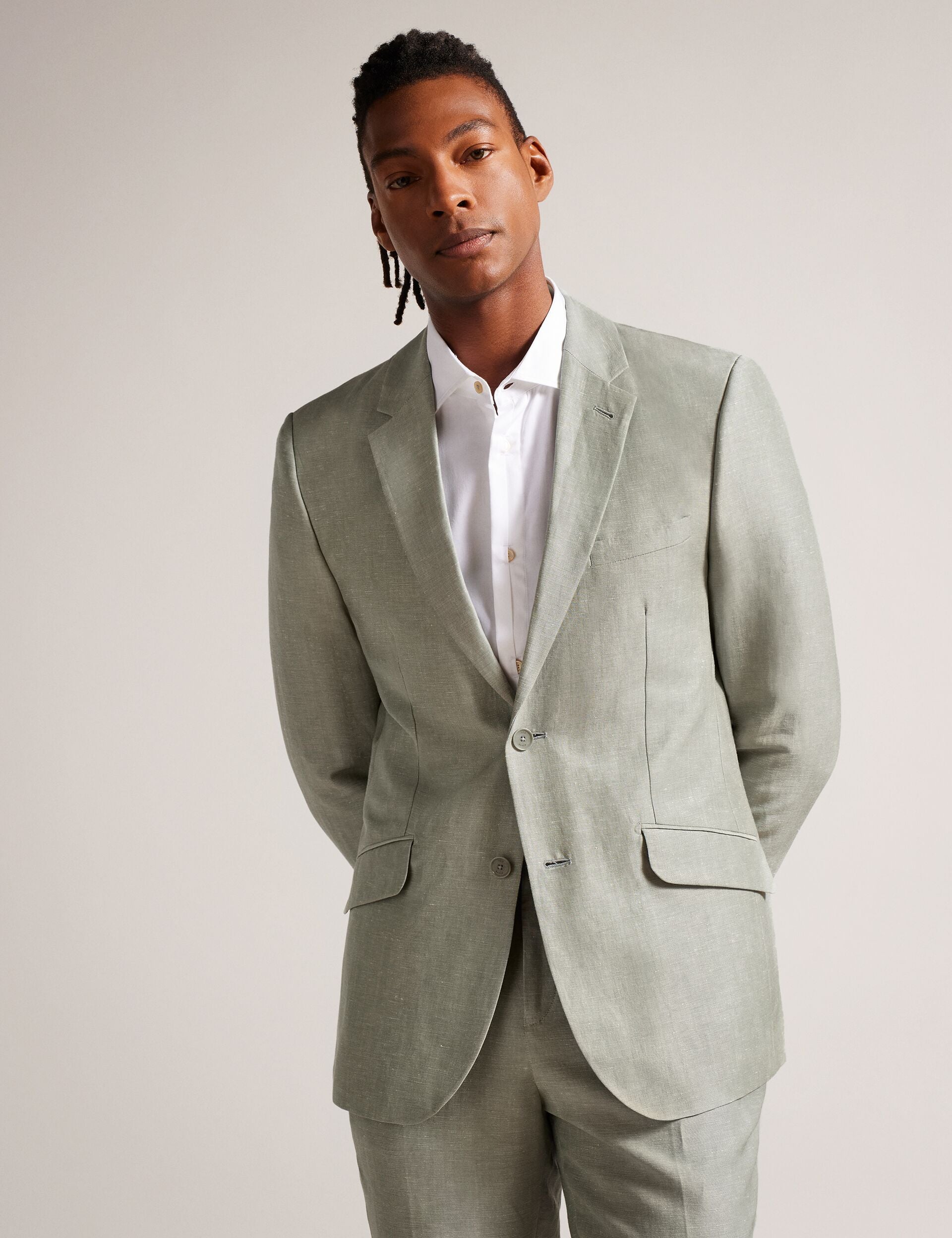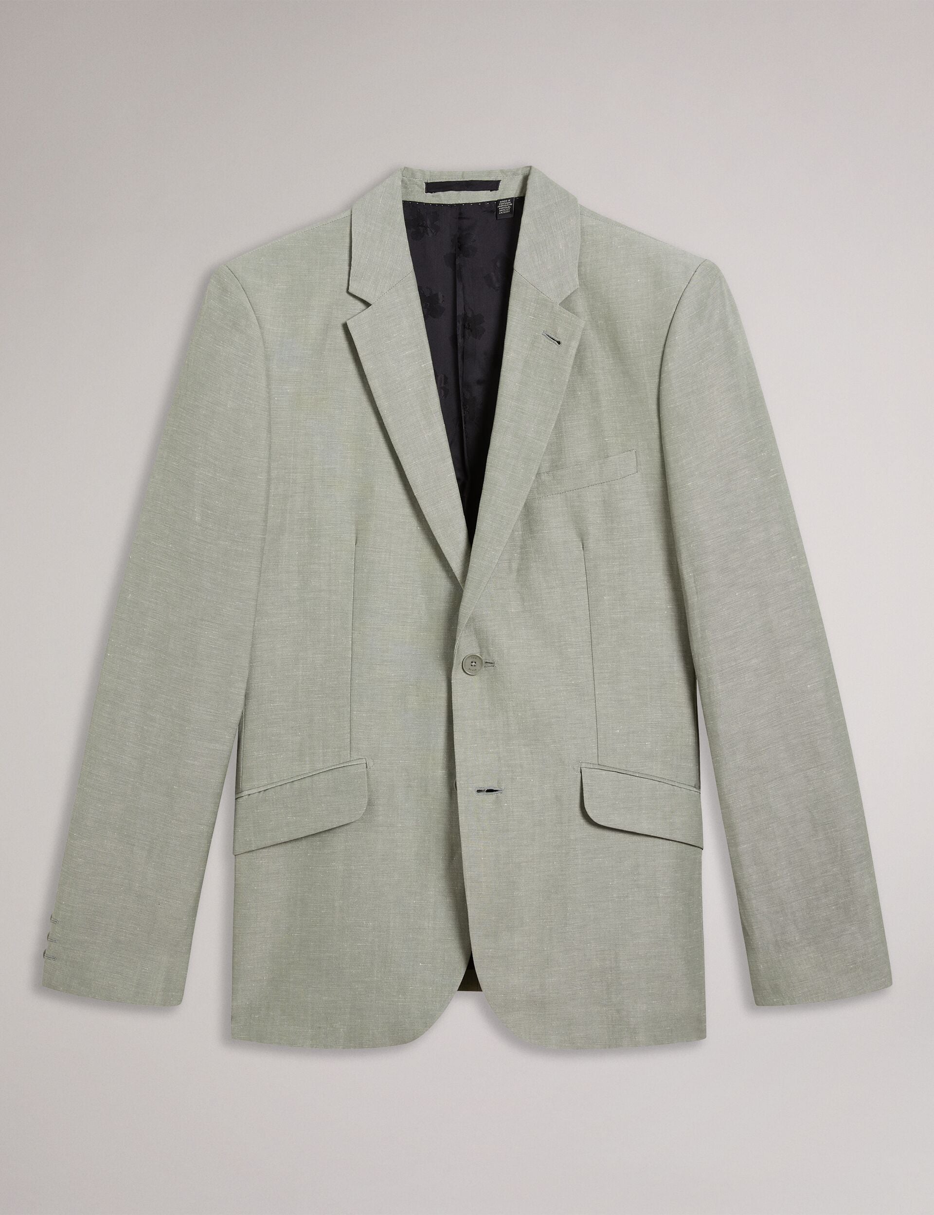 Look sharp in LANCEJ, a luxe blazer in a wool and linen blend that has all the details covered. With a jacquard magnolia lining, it features single breasted buttons and long sleeves.