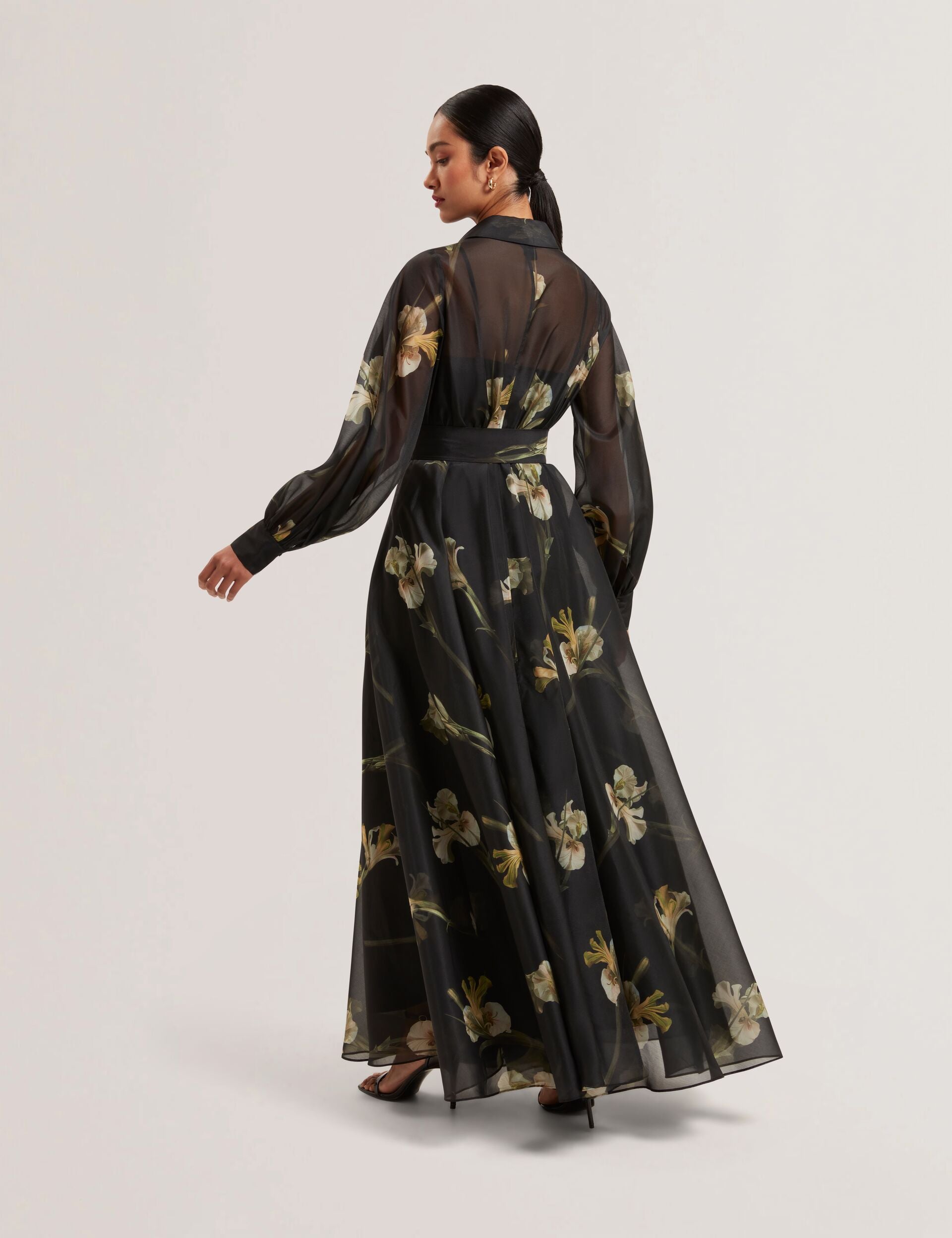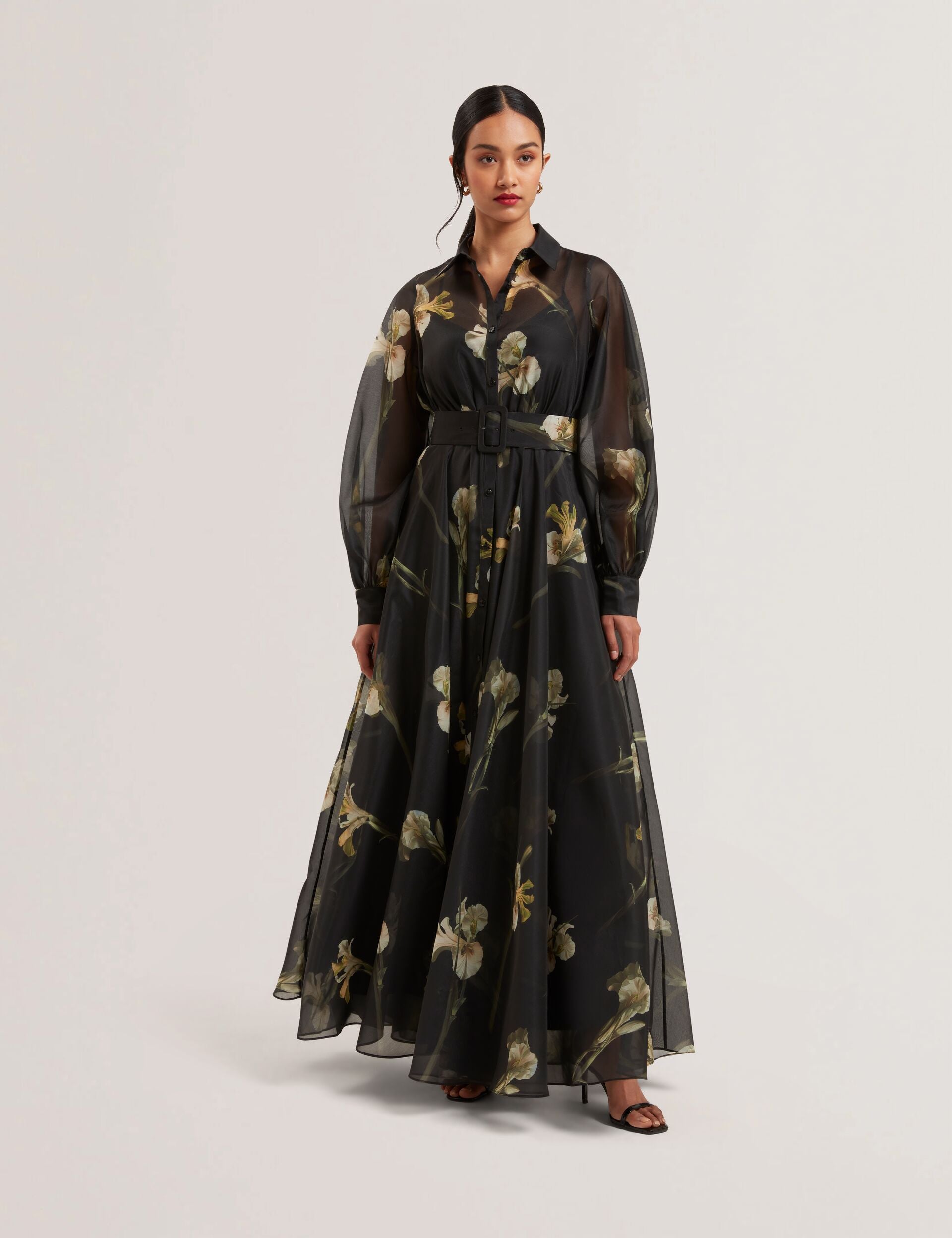 Floral Organza Belted Maxi Shirt Dress