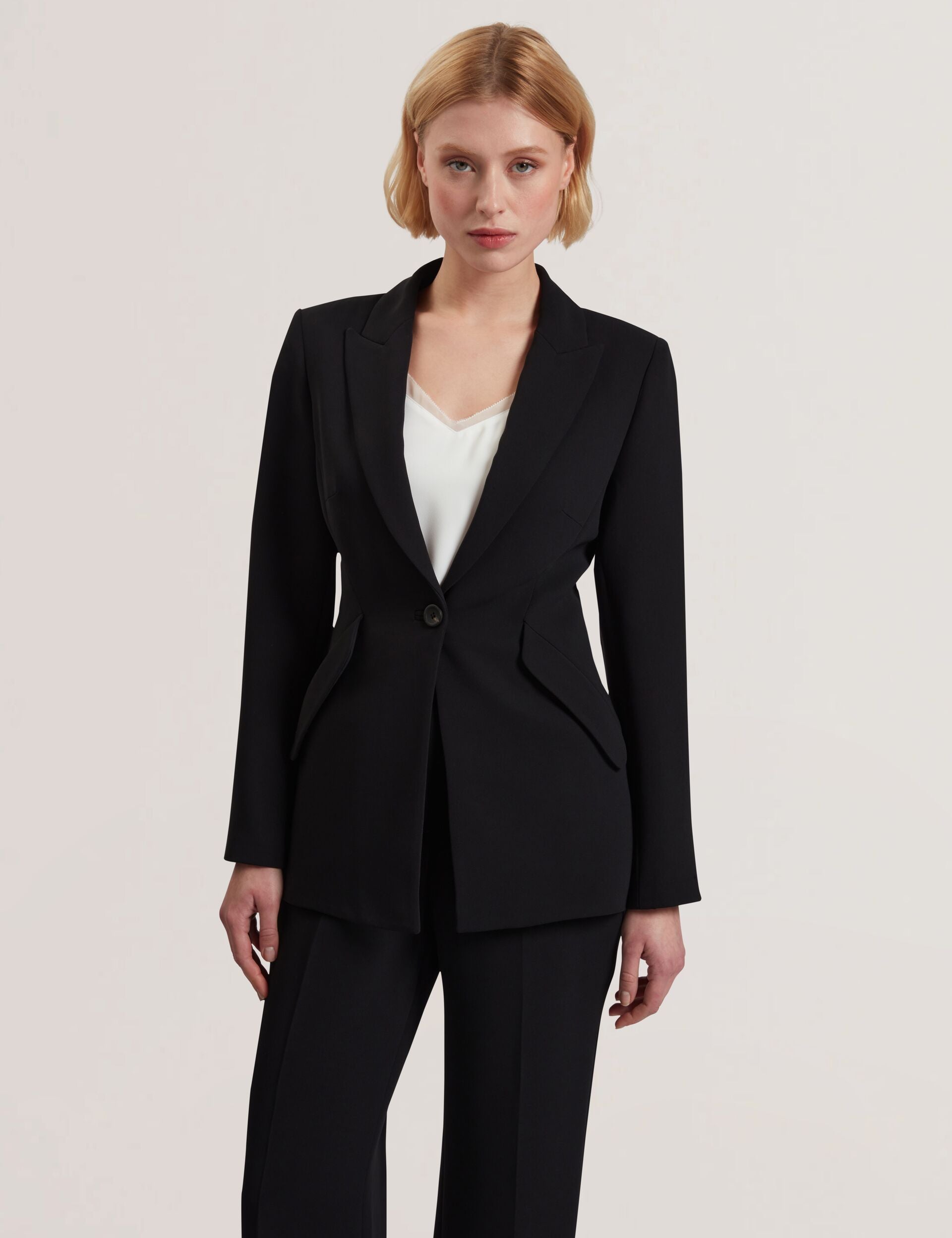 If your taste in tailoring includes flattering silhouettes, then MANABL is the jacket for you. The fitted design creates an hourglass silhouette, fastened with a single button to accentuate your shape even further. Add in the peak lapels and decorative pocket flaps, and you've got the ultimate power blazer.