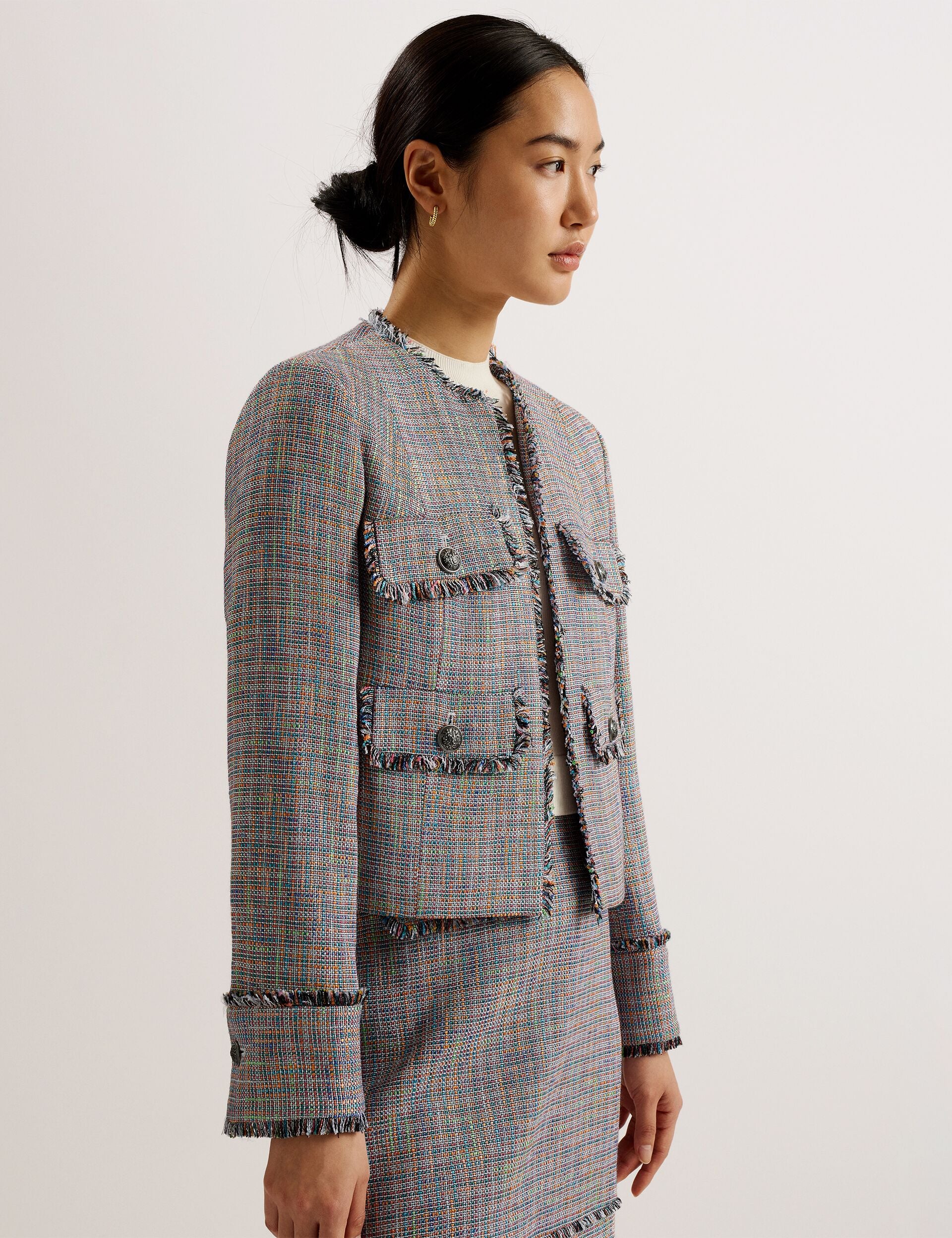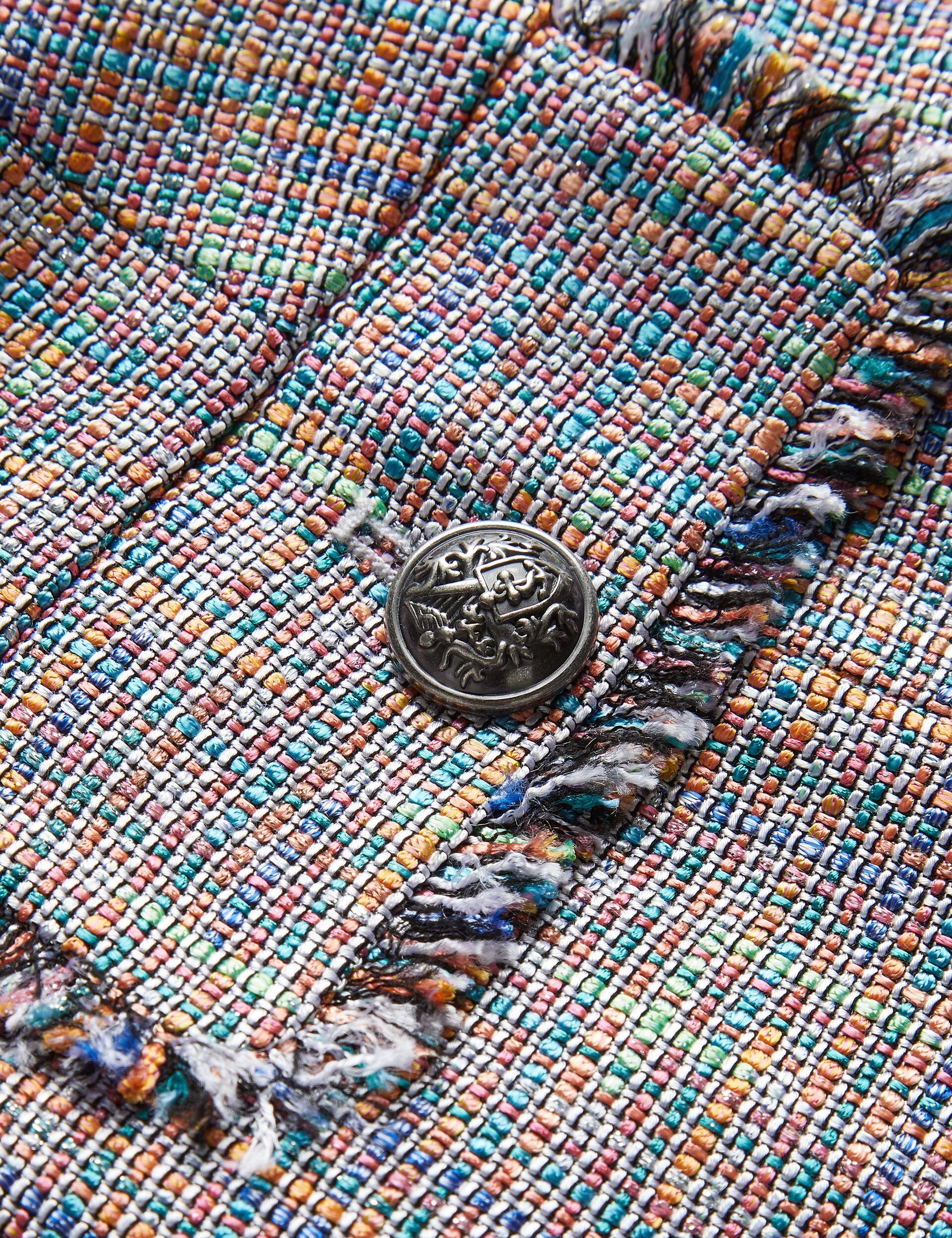MAYUMI is starting a workwear renaissance, blending classic tailoring with playful details. This boucle jacket features flap pockets, antique-style metal buttons, a cropped length, and frayed hems. It's a classic blazer that has been brought into the modern era.