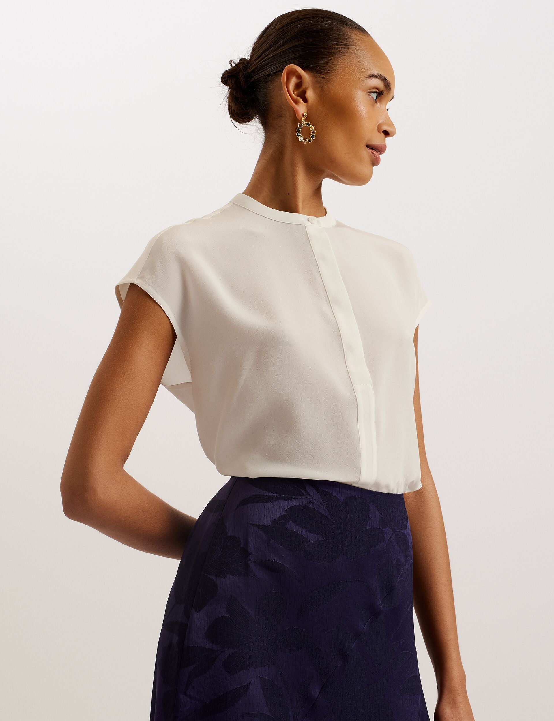 The MIYOKOE blouse is here to bring a more tailored feel to your looks with cap sleeves and a straight fit, and made from 100% silk for a luxe feel. The grandad collar is the perfect blend of smart and casual, giving way to a practical half placket with button fastening. This staple piece is a must have for stylish office fits or to elevate your denim.