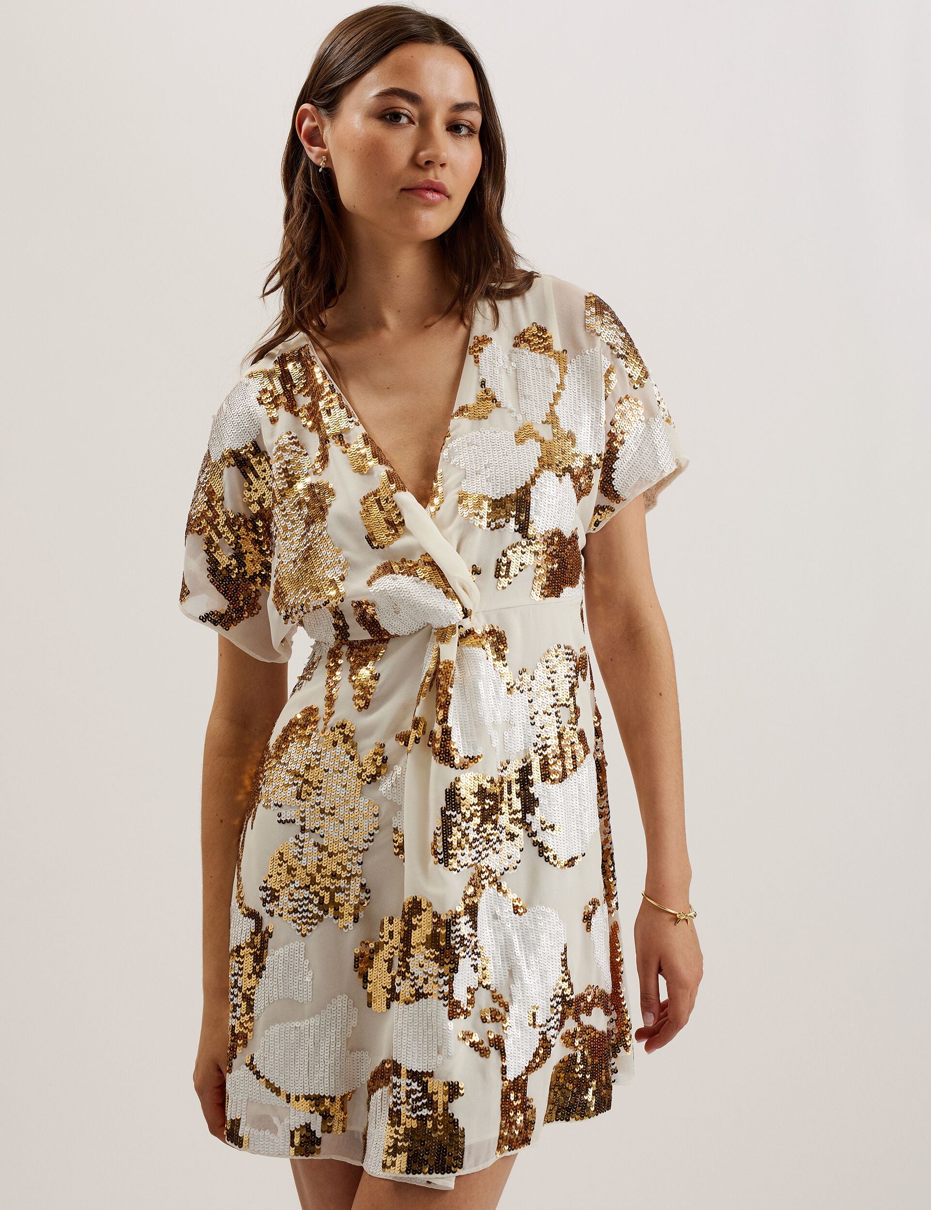 Shine bright in NOOSH. With a flattering V-neck and a chic tie knot detail at the front, this dress is adorned with all-over floral sequin embellishments that catch the light from every angle. The side zip makes for an easy fit, while the straight hem adds a touch of modern elegance. Crafted from midweight, non-stretch fabric, it’s perfect for when you’re ready to turn heads and steal the spotlight. Because why blend in when you can sparkle?