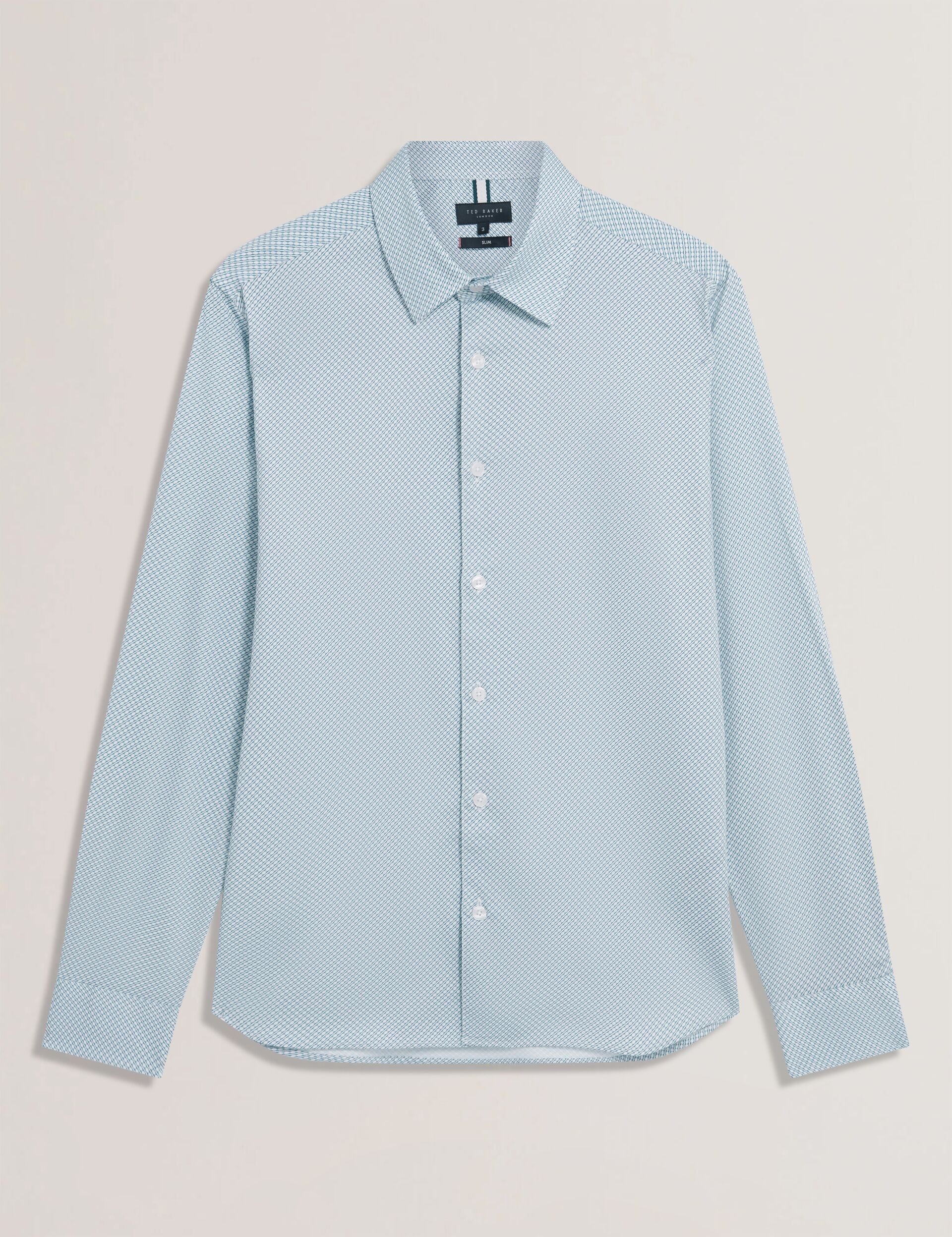 Contemporary shirting with signature Ted Baker flair. The OLWENO shirt features a micro geometric design that infuses your formalwear with personality whilst still feeling smart. Crafted from breathable cotton with a touch of stretch, style this slim fit piece with plain suits and classic chinos.