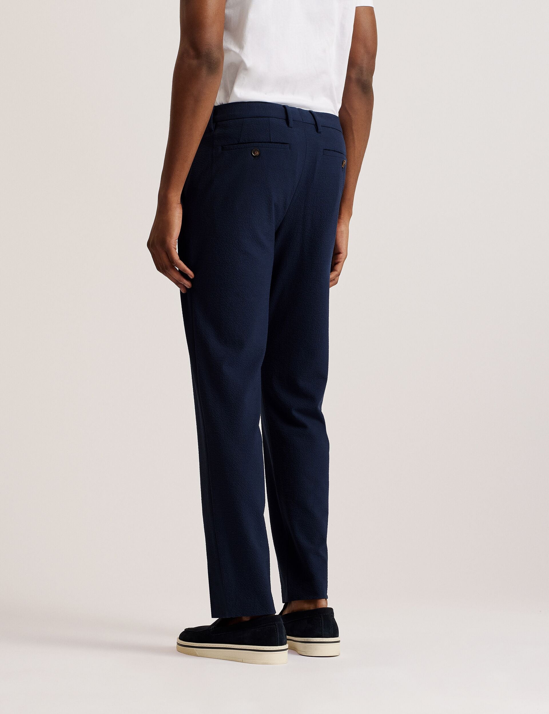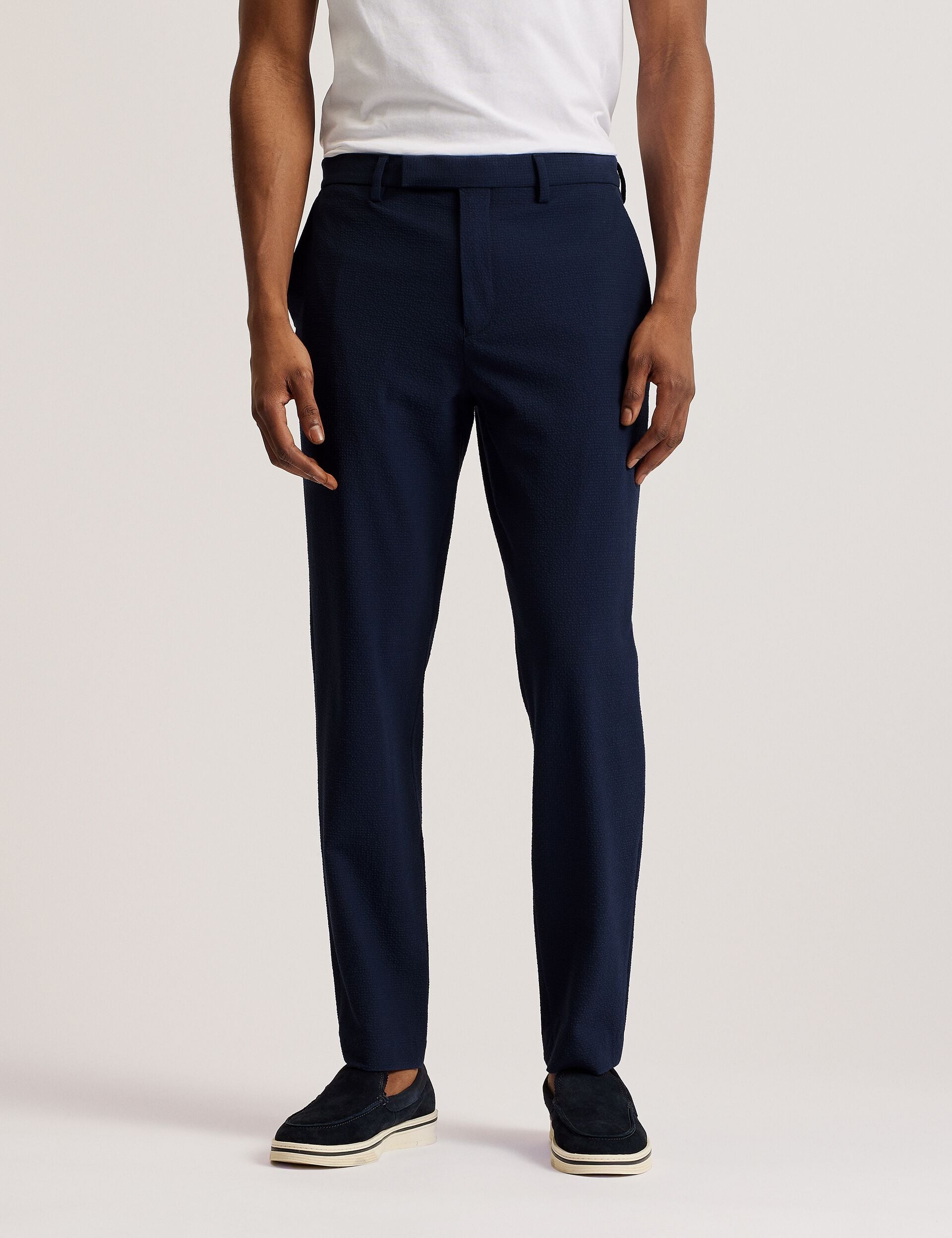 Sport on-trend tailoring with these REMUST trousers, cut in a flattering slim fit and finished with a subtle seersucker texture. This smarter staple is plenty versatile - pair with button-up shirts or casual printed tees. The hook fastening at the waist adds a sleek touch, finished with pockets and belt loops for practicality.