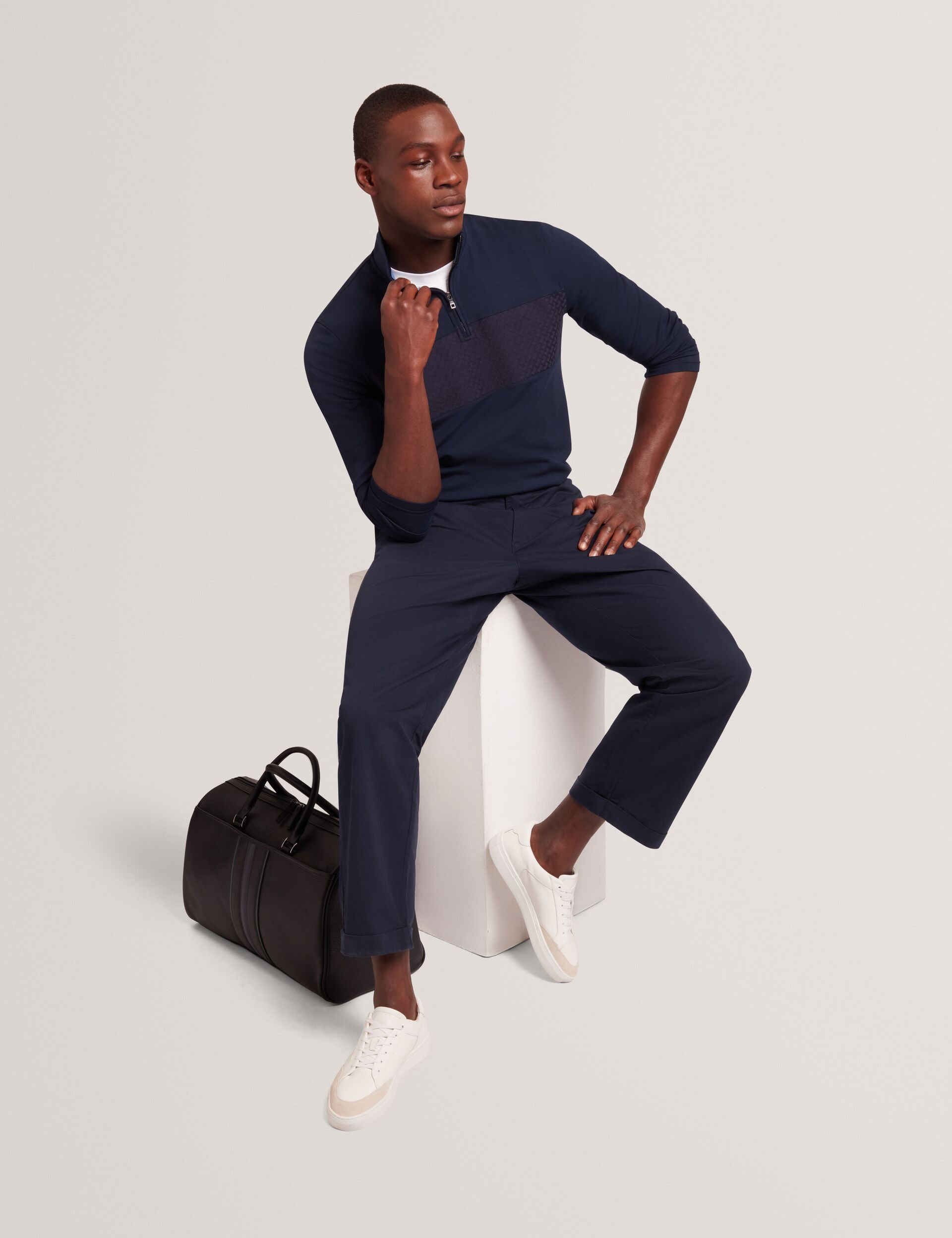 When you need to pull on an extra layer, reach for SIMONEAO. This soft quarter-zip sweatshirt features a funnel neckline for warmth, and a T pattern panel across the chest to add modern texture to its classic look. Layer under winter coats or over a crew neck t-shirt.